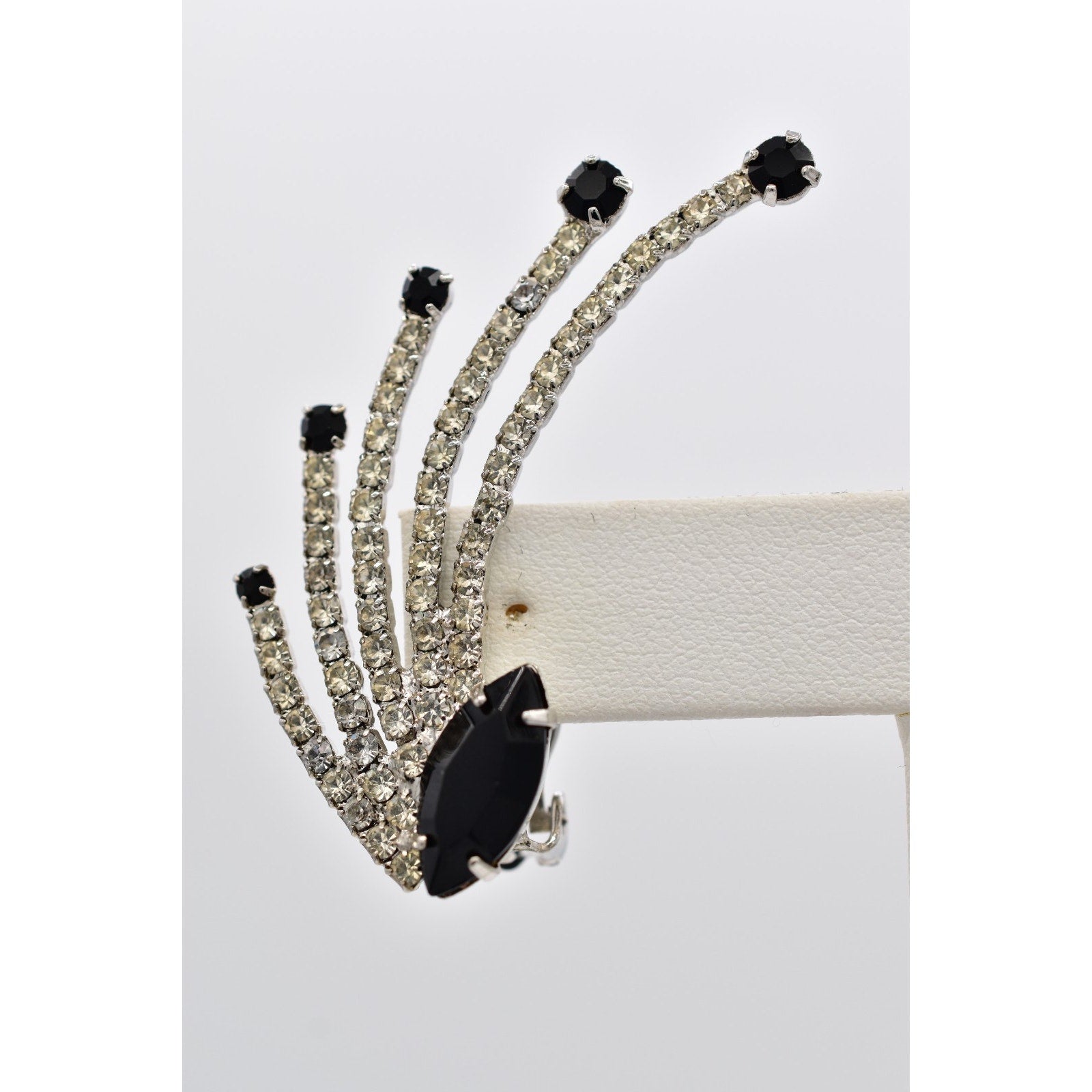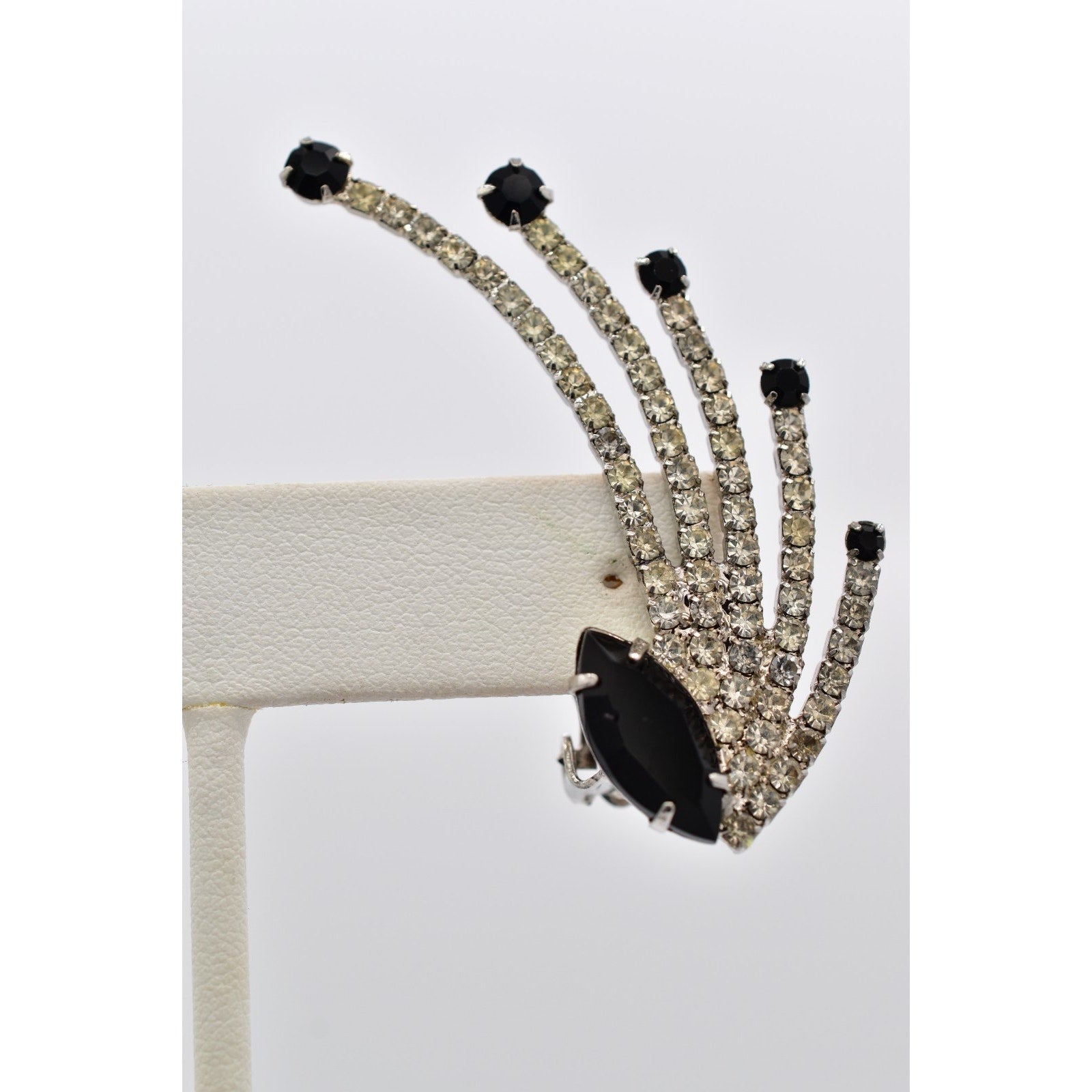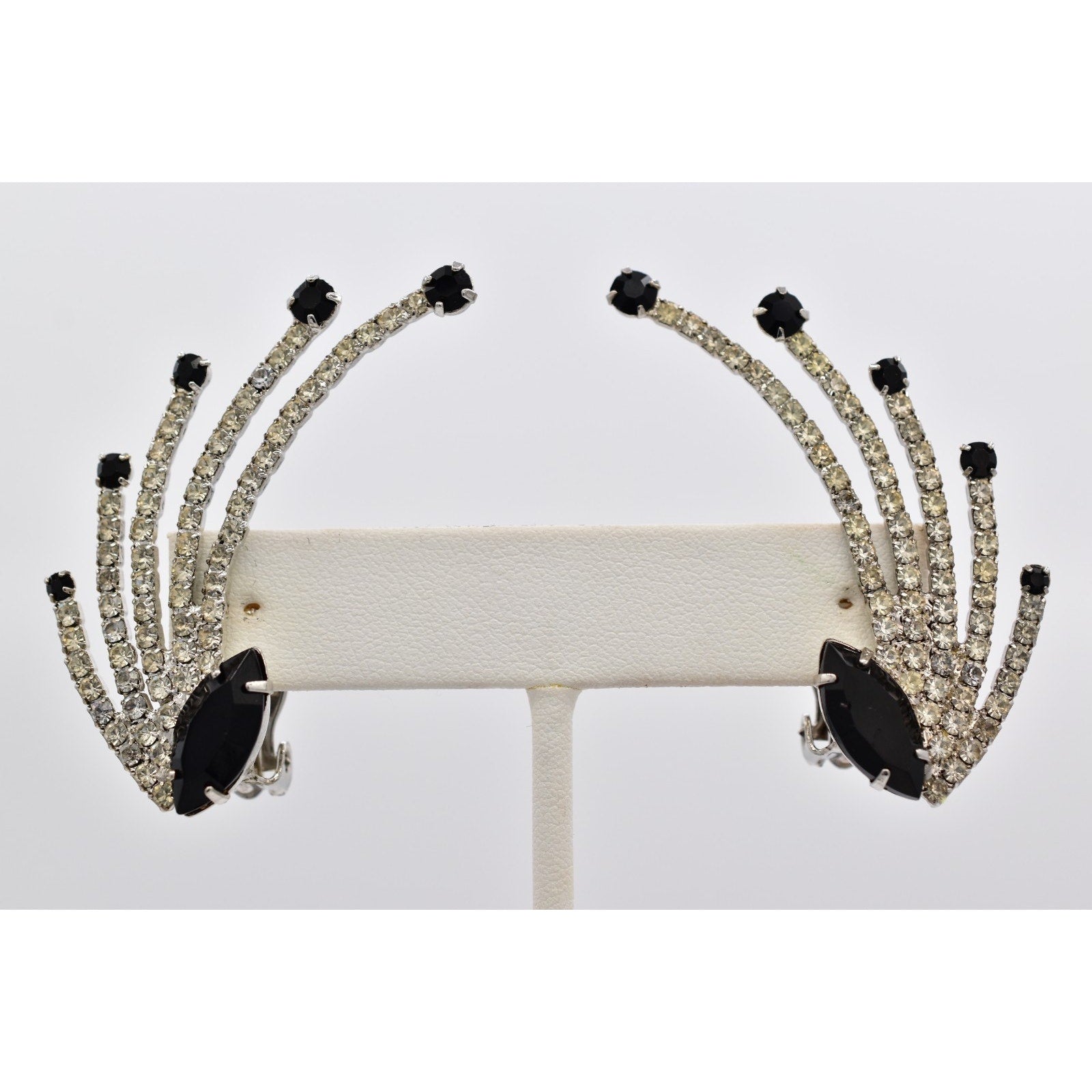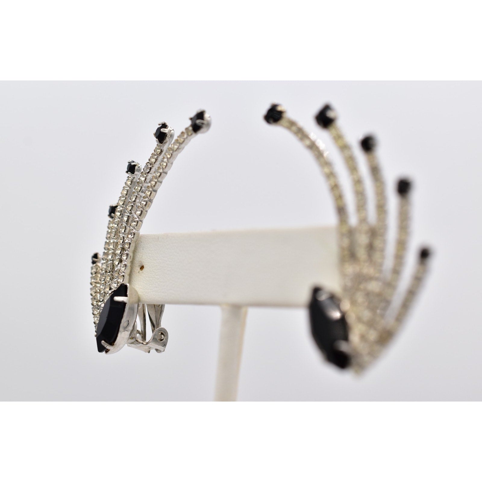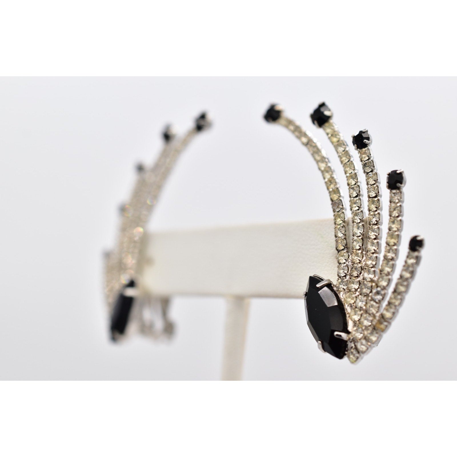 Bold vintage statement earrings featuring sweeping rhinestone spray arms accented with black faceted stones. Dramatic, elegant, and perfect for evening or special occasions.