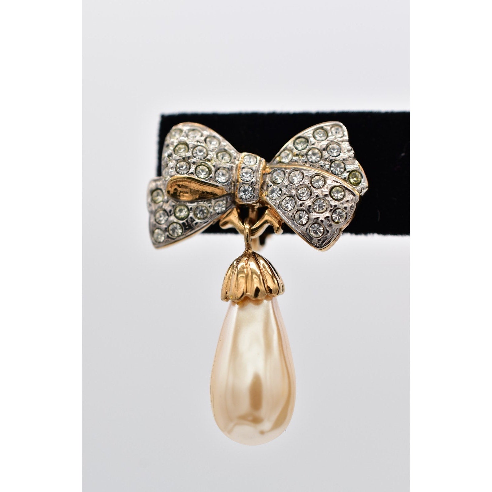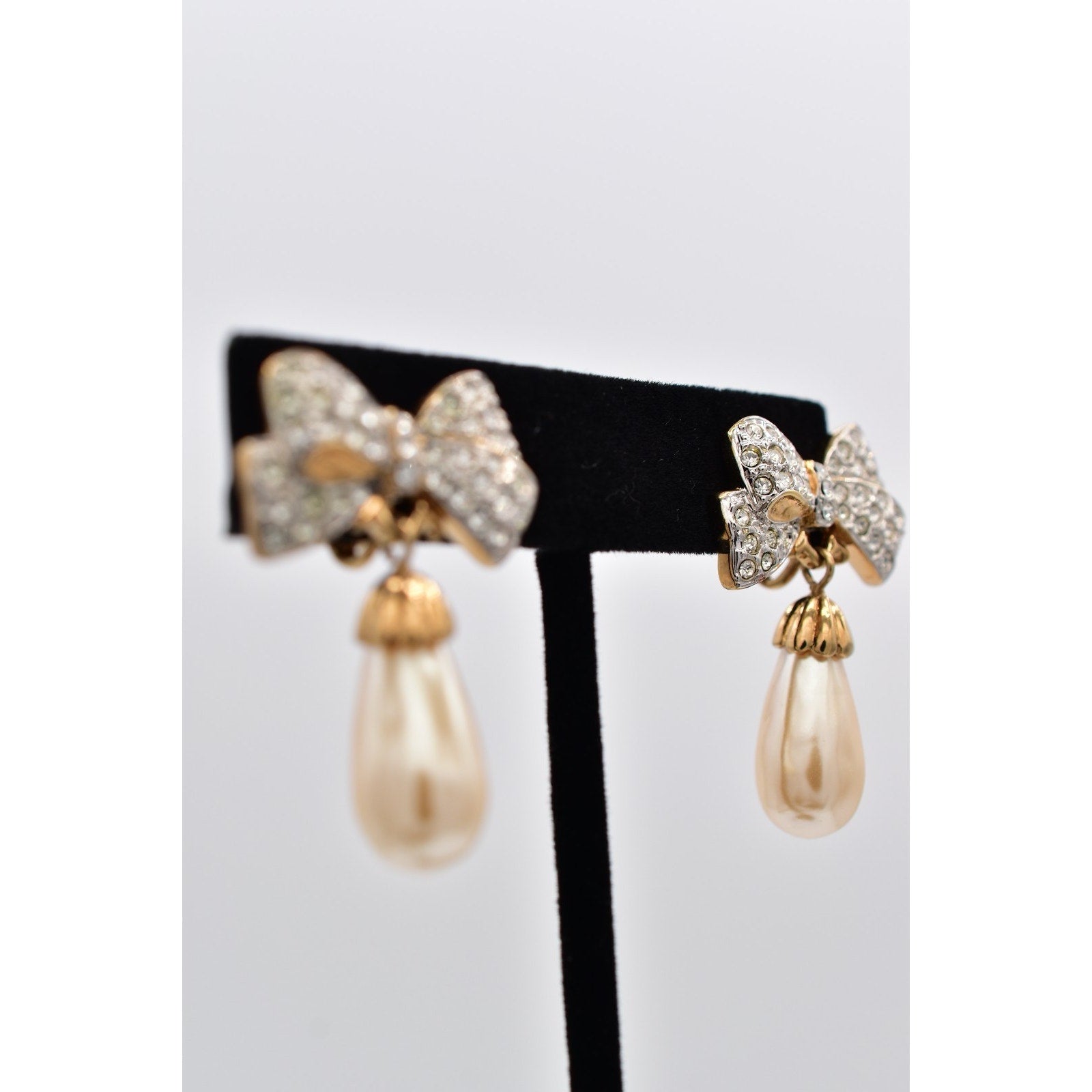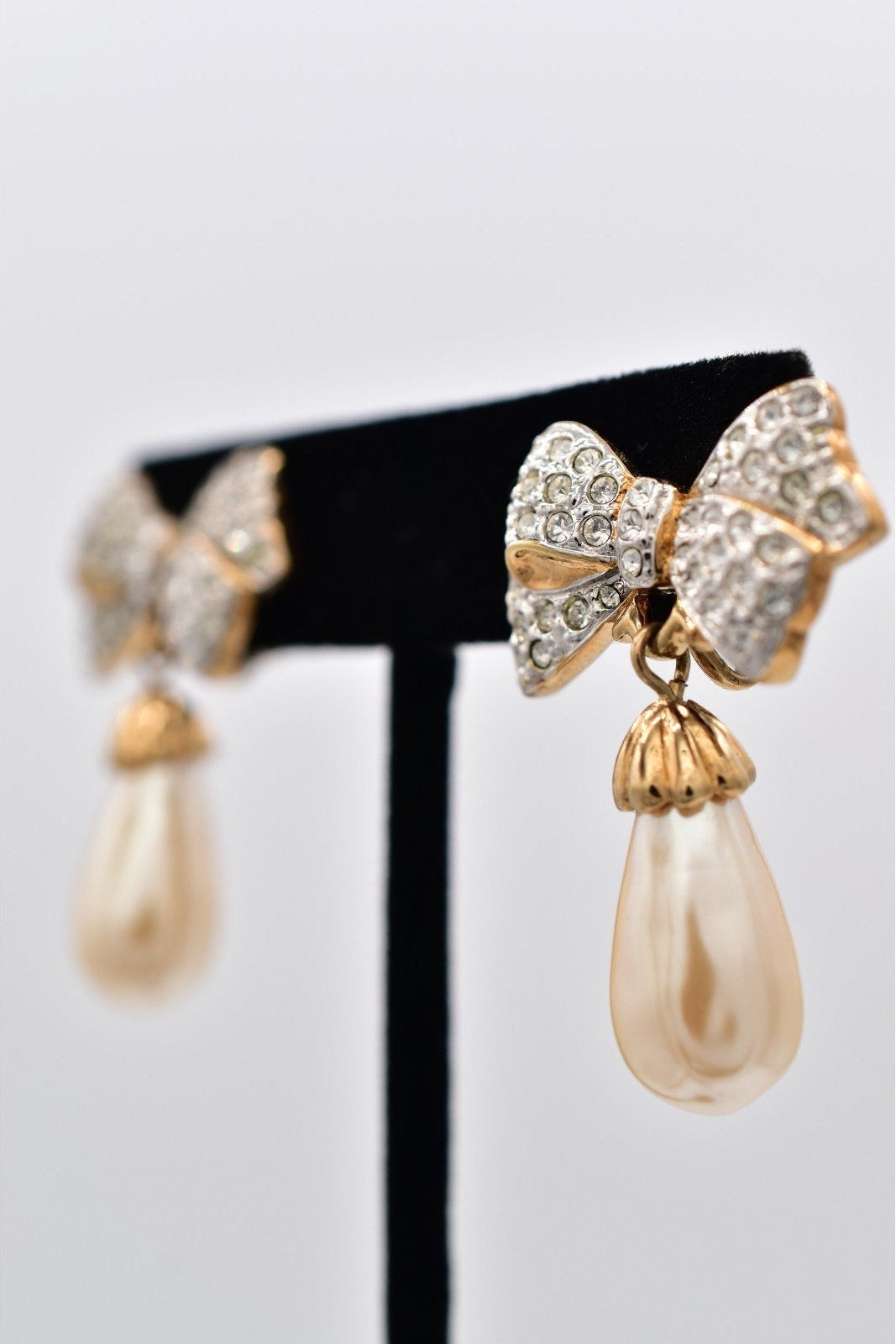 Elegant vintage Carolee bow earrings featuring sparkling clear rhinestones and luminous faux pearl drop dangles. A classic, feminine design with timeless appeal—perfect for dressy occasions or elevating everyday looks.