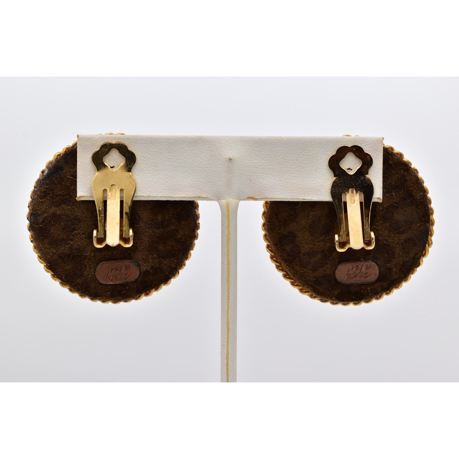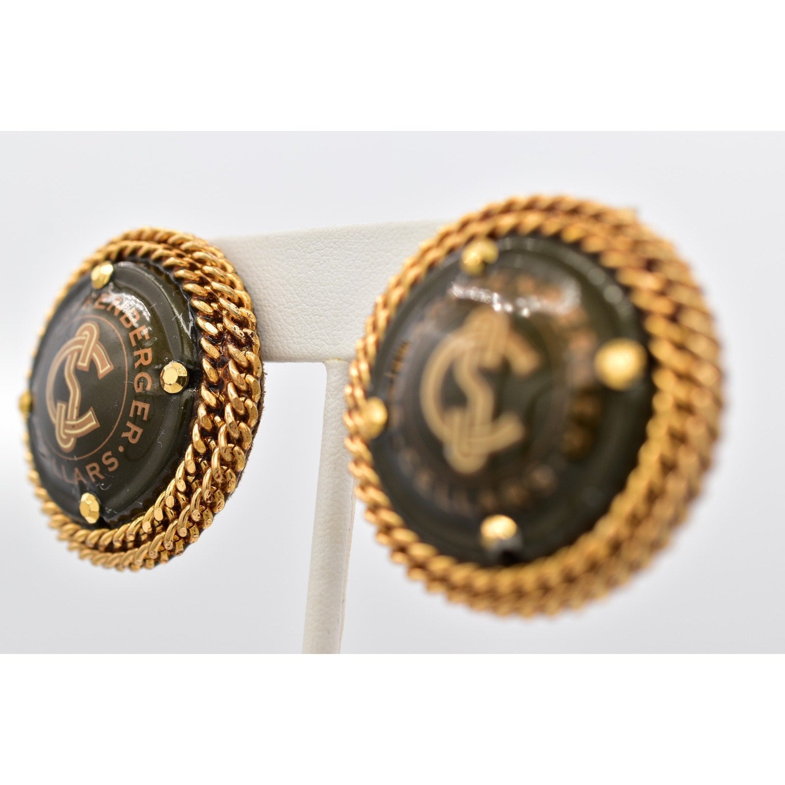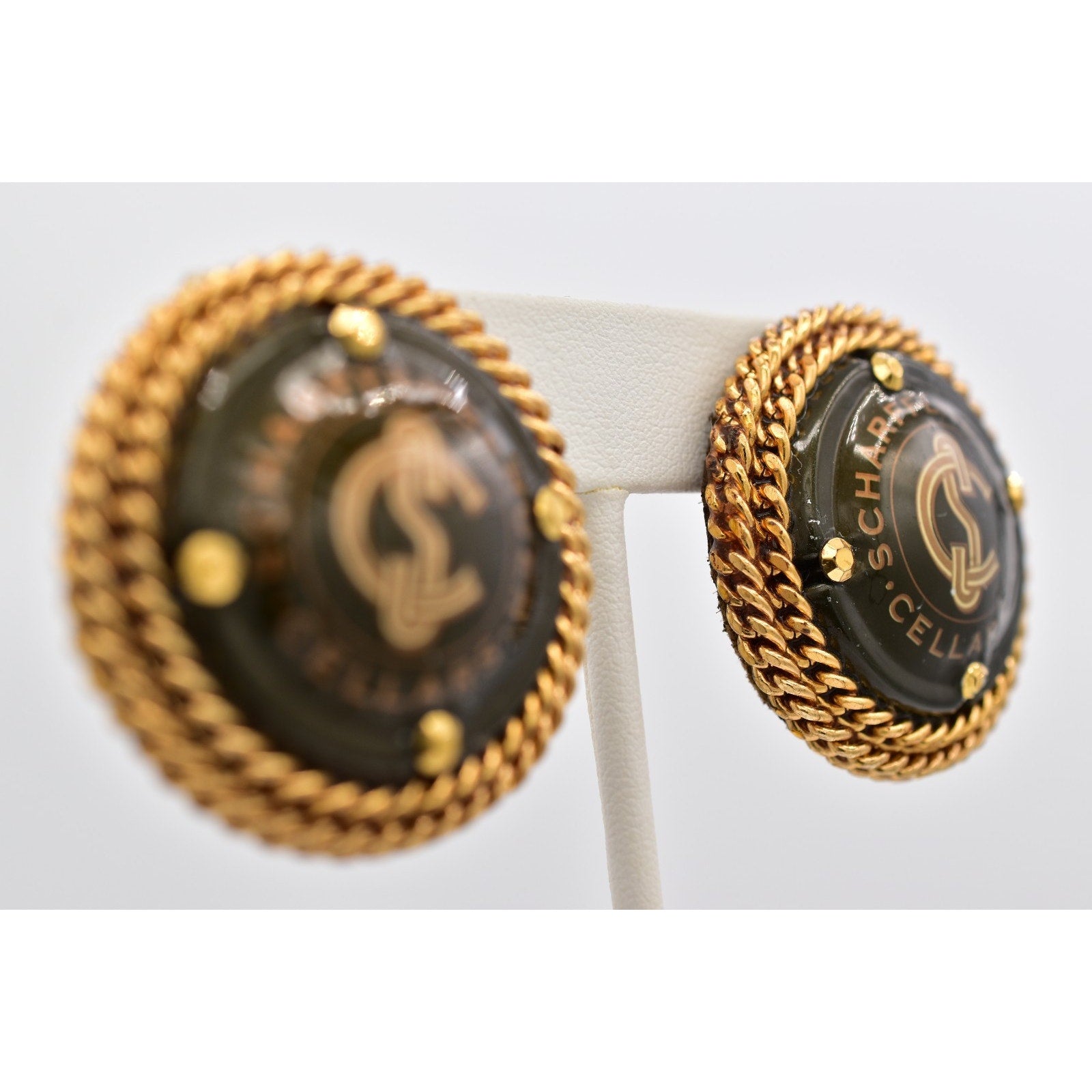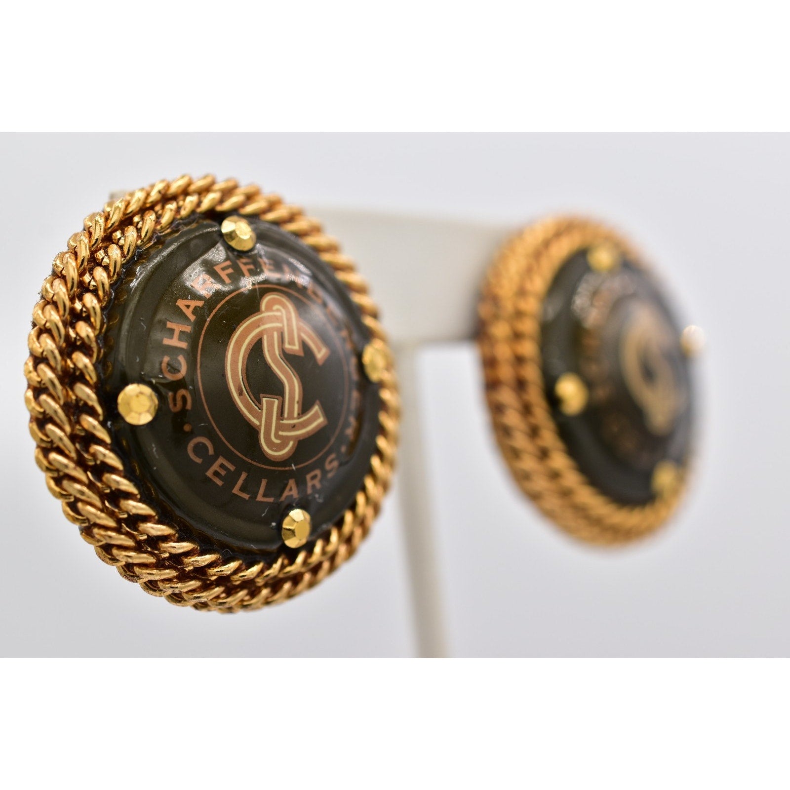 Iconic and collectible, these vintage clip-on earrings by Cheryl Berez feature authentic Domaine Chandon champagne cellar medallions, framed in rich gold-tone rope detailing for a bold statement with true provenance.
