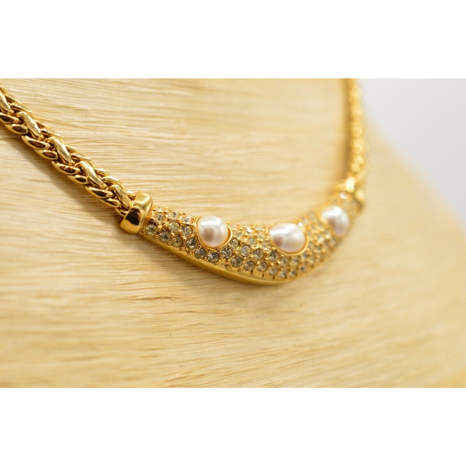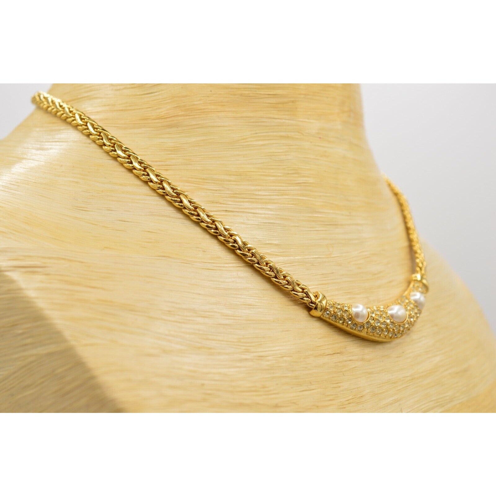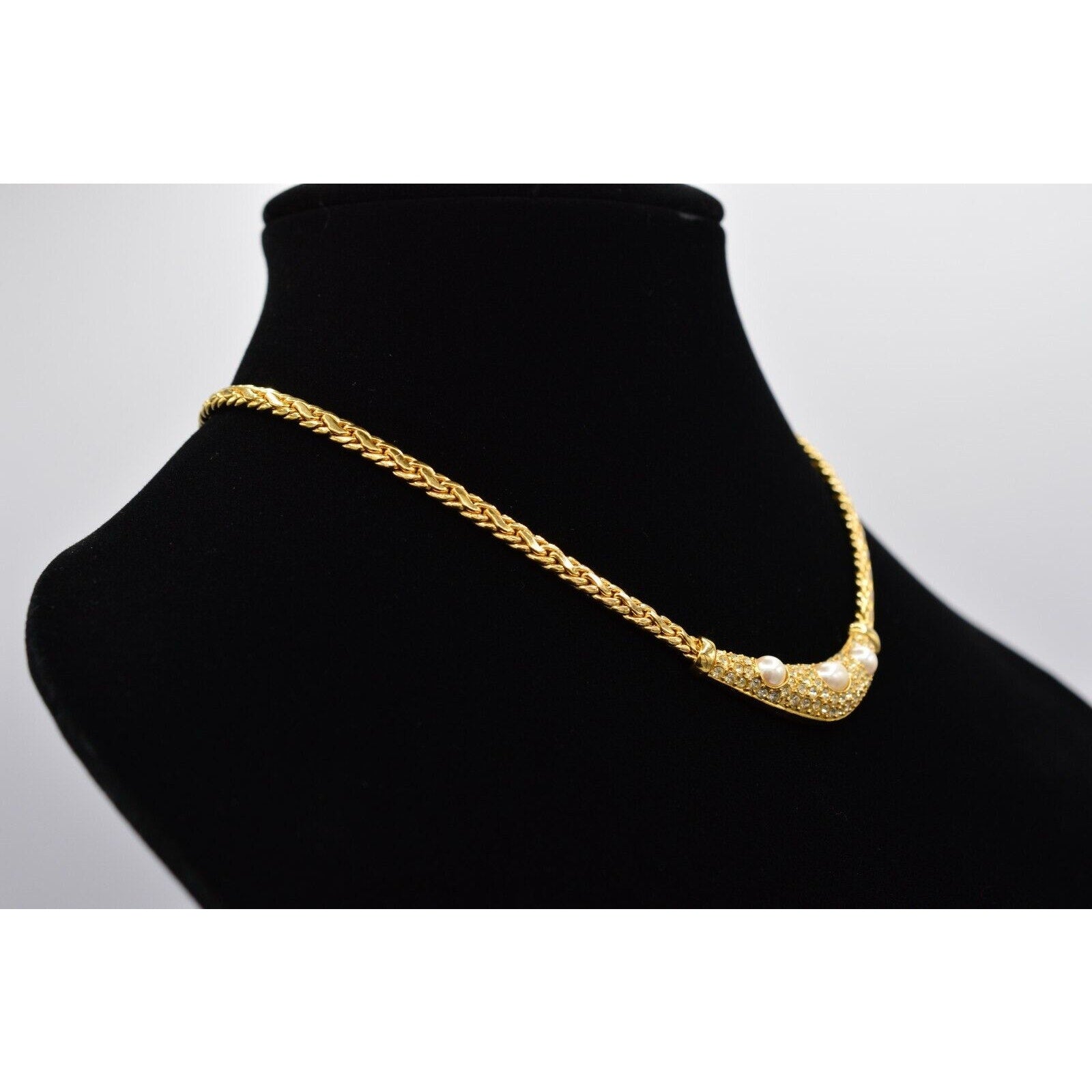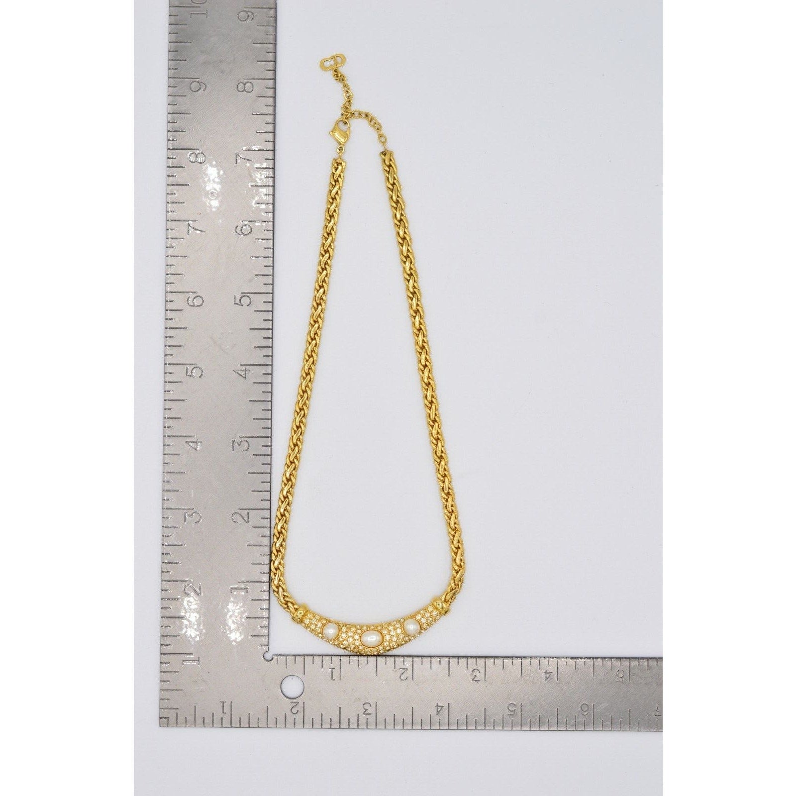An exquisite vintage Christian Dior collar necklace from the glamorous 1980s, featuring a rich gold-tone woven chain accented with luminous faux pearls and sparkling crystal pavé. A timeless statement that embodies Dior’s iconic elegance and luxury craftsmanship.