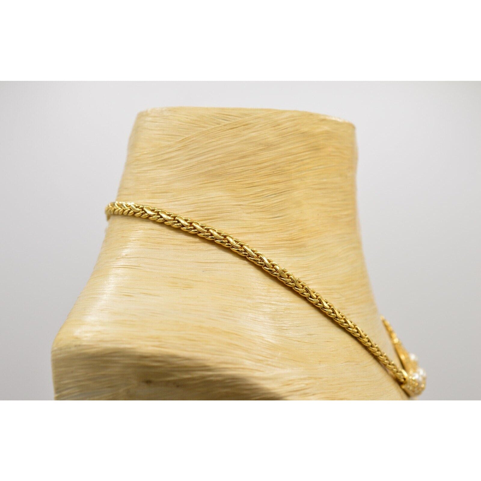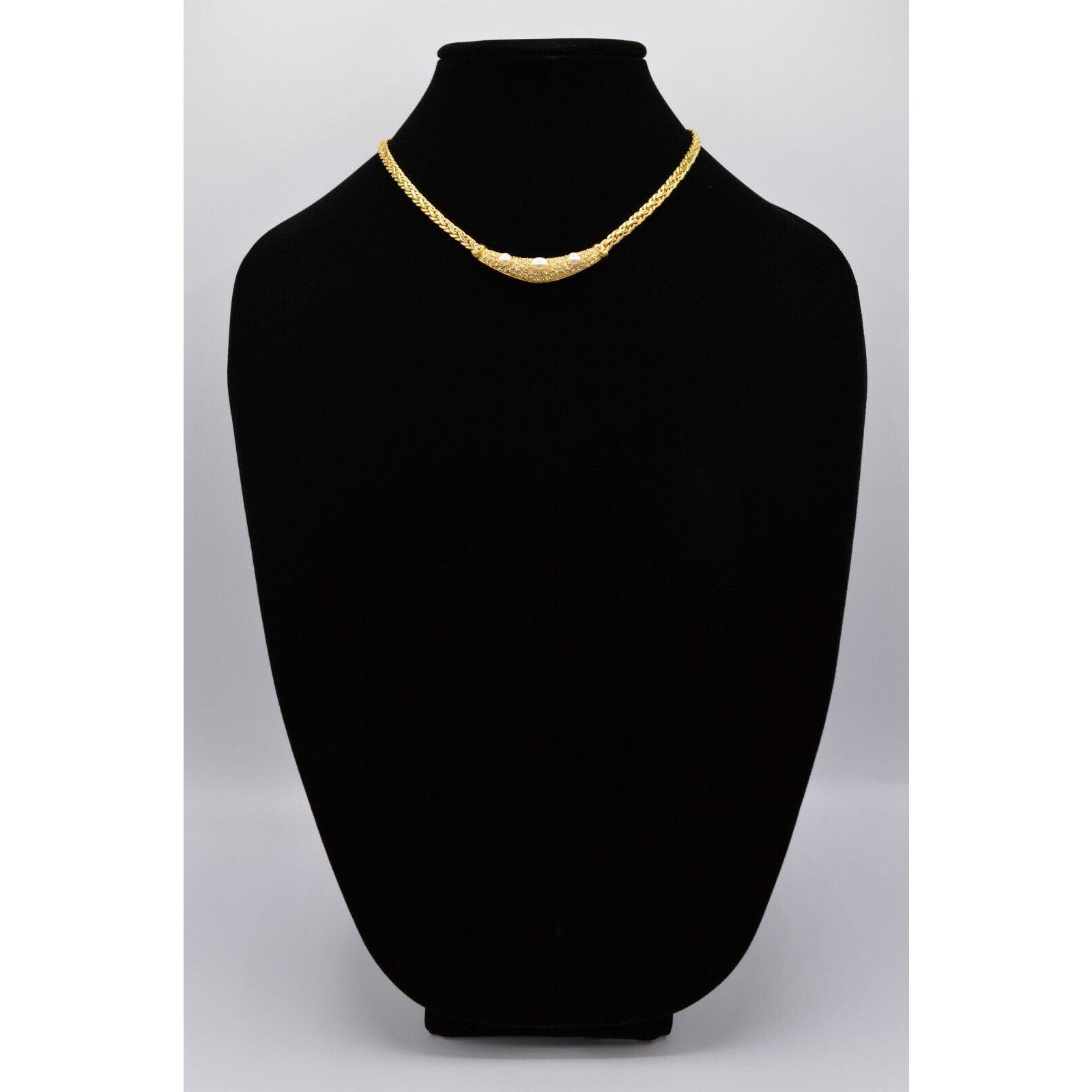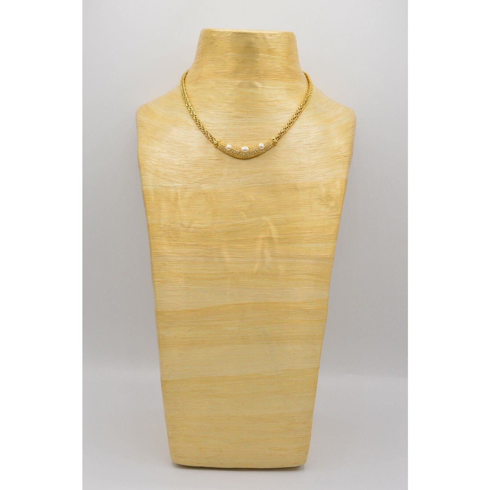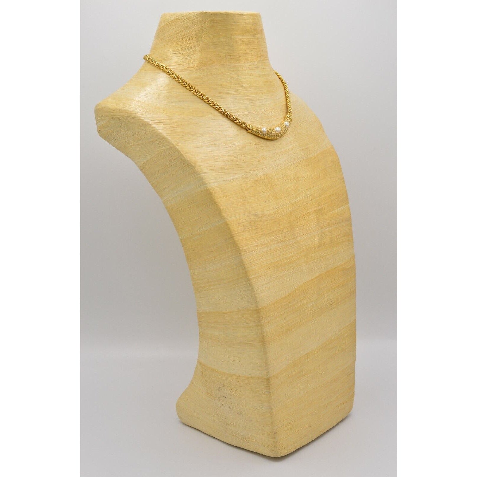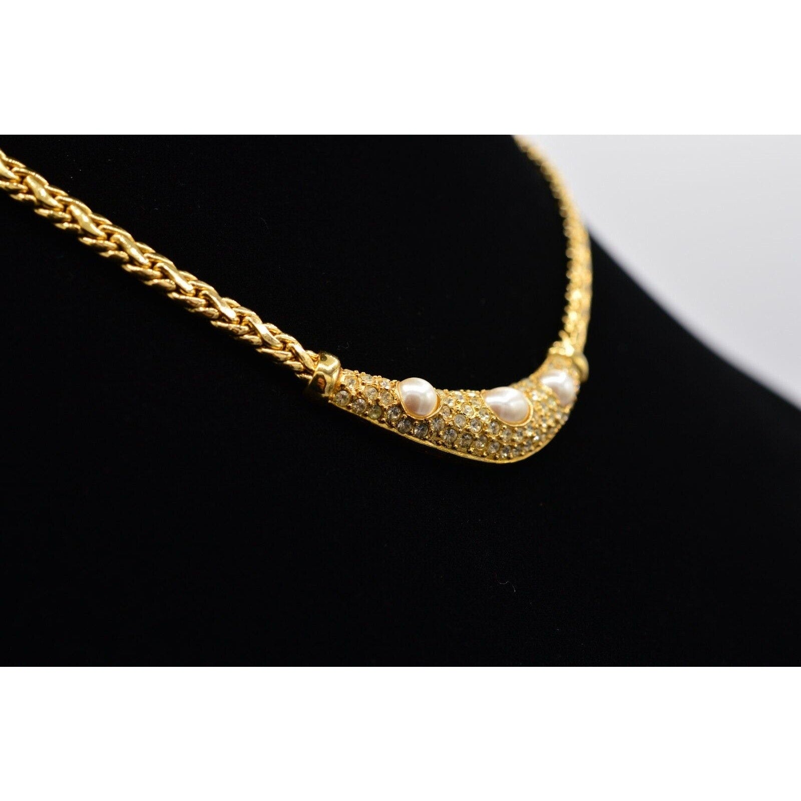 An exquisite vintage Christian Dior collar necklace from the glamorous 1980s, featuring a rich gold-tone woven chain accented with luminous faux pearls and sparkling crystal pavé. A timeless statement that embodies Dior’s iconic elegance and luxury craftsmanship.