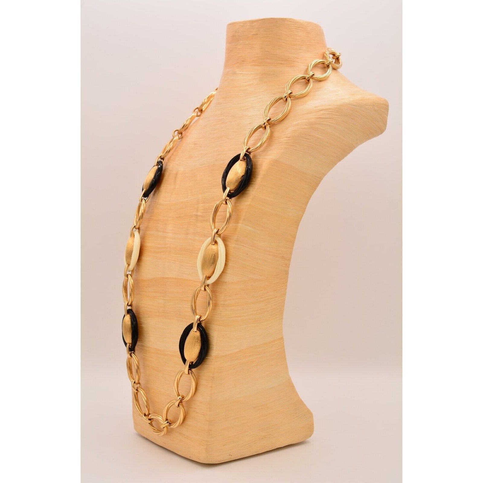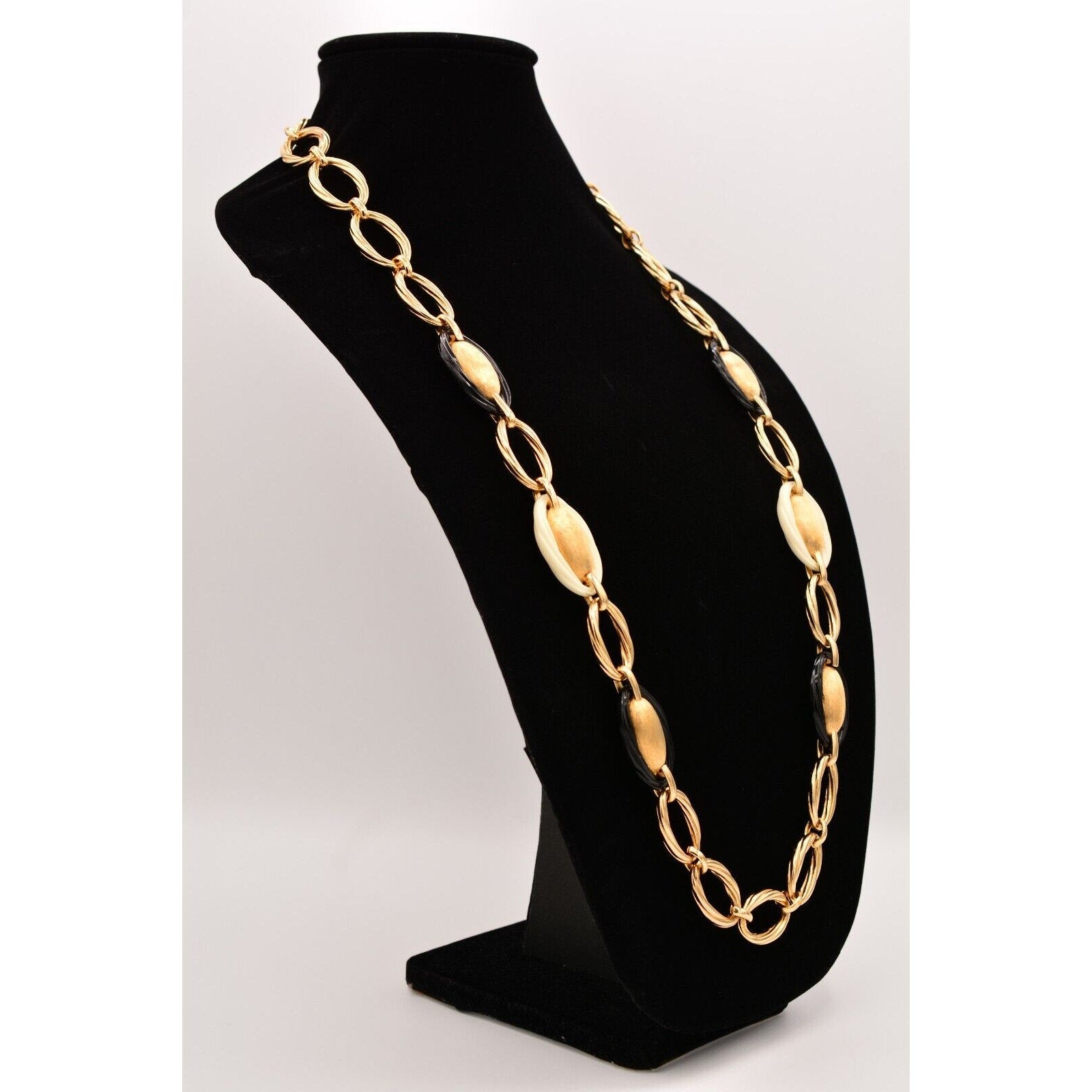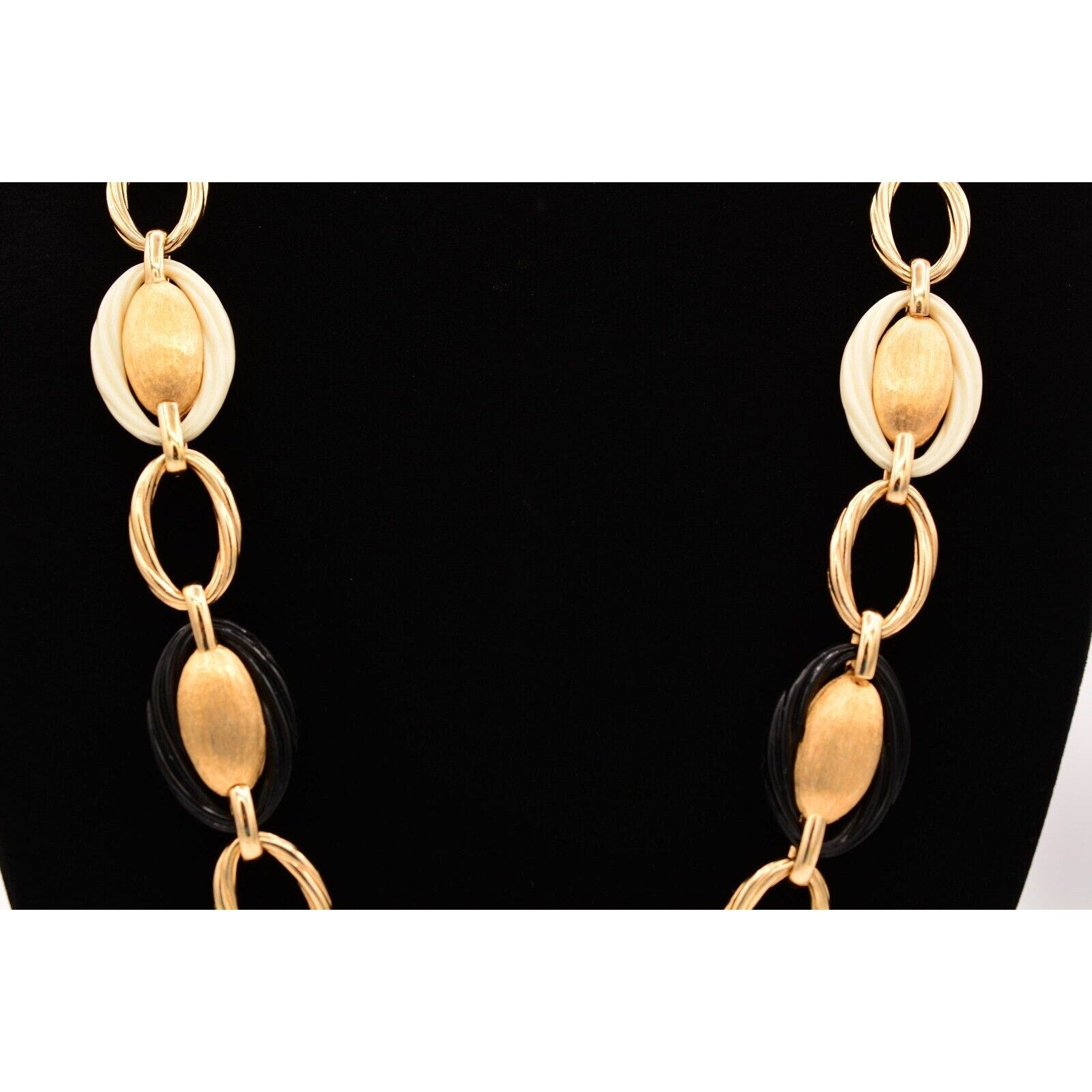 Bold, iconic Dior—this vintage 1980s statement necklace features substantial gold-tone oval links with striking black and ivory/cream accents for that classic power-jewelry look.