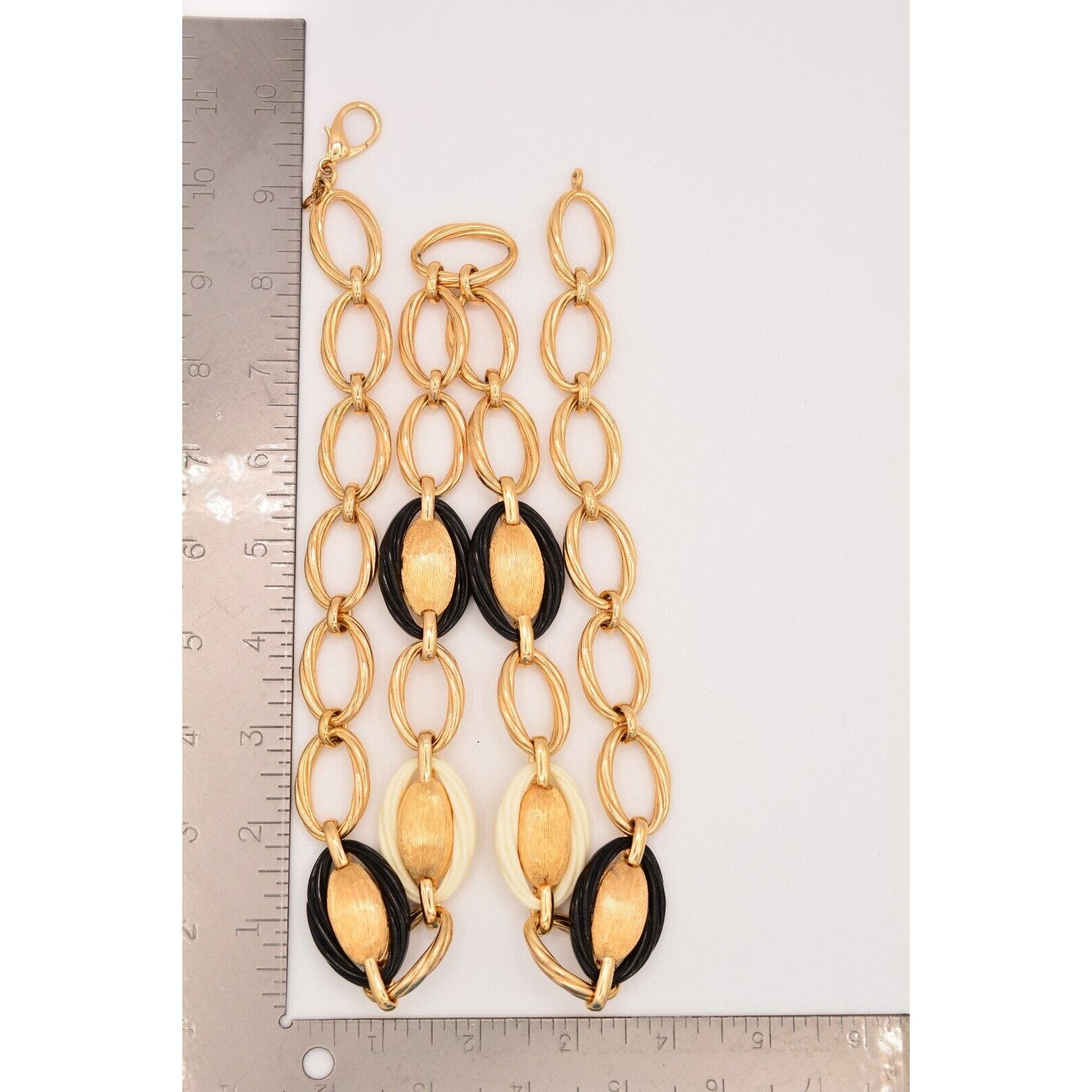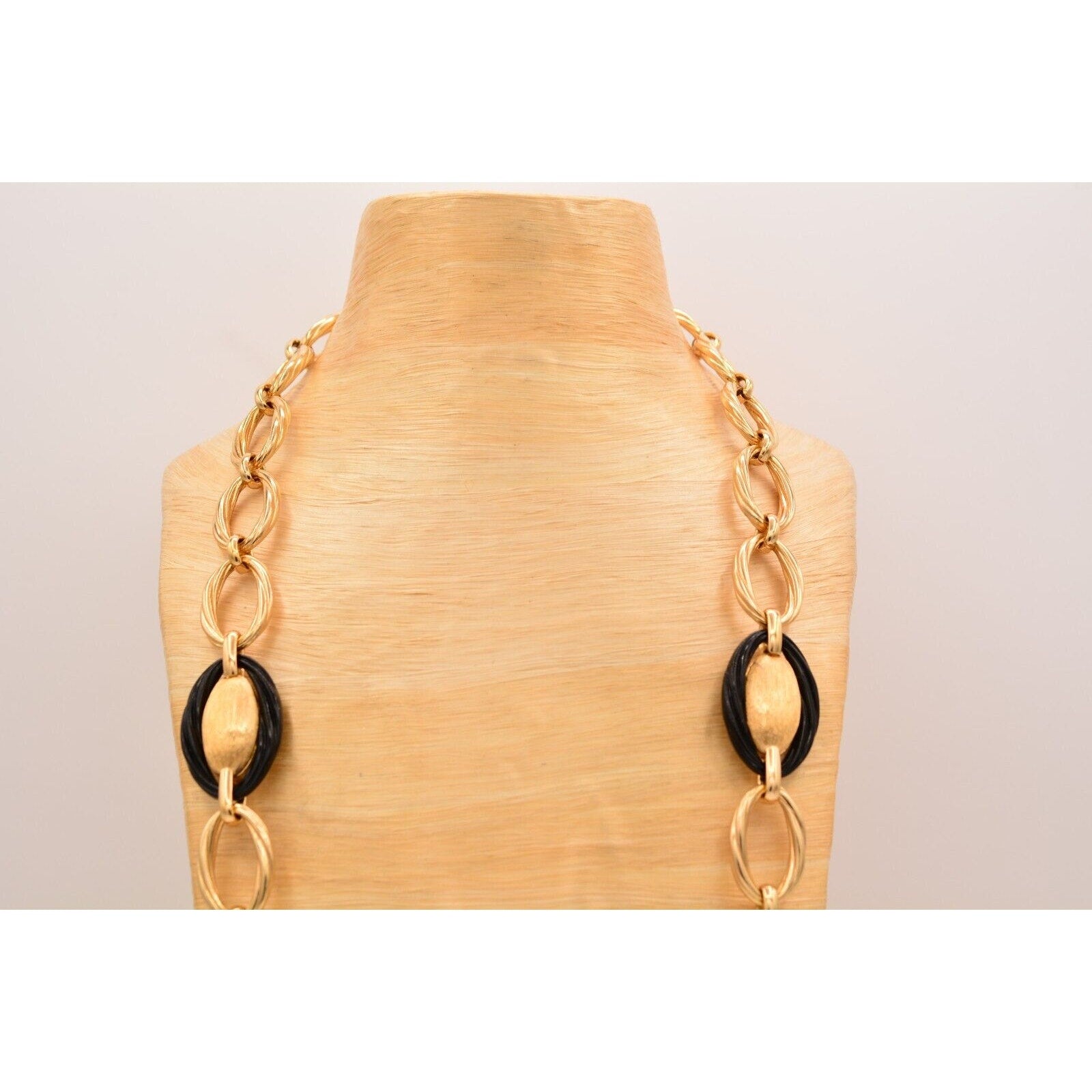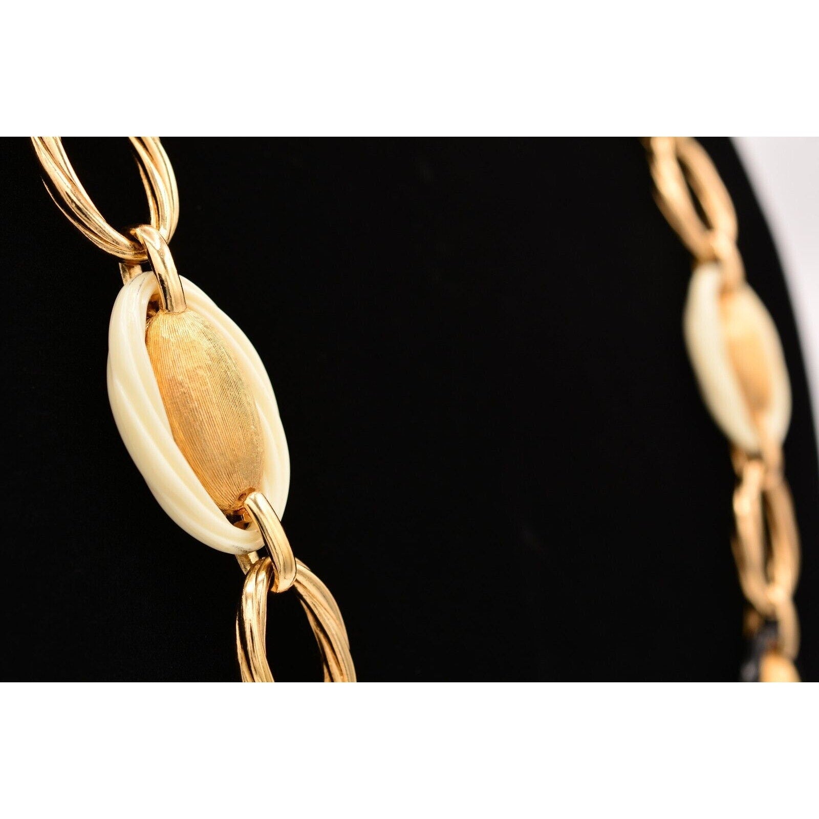 Bold, iconic Dior—this vintage 1980s statement necklace features substantial gold-tone oval links with striking black and ivory/cream accents for that classic power-jewelry look.