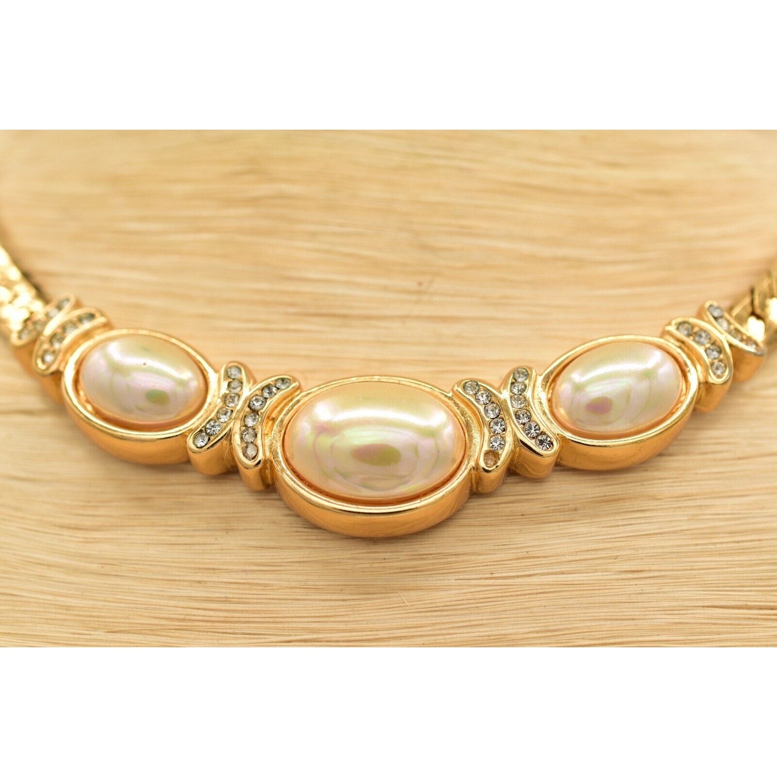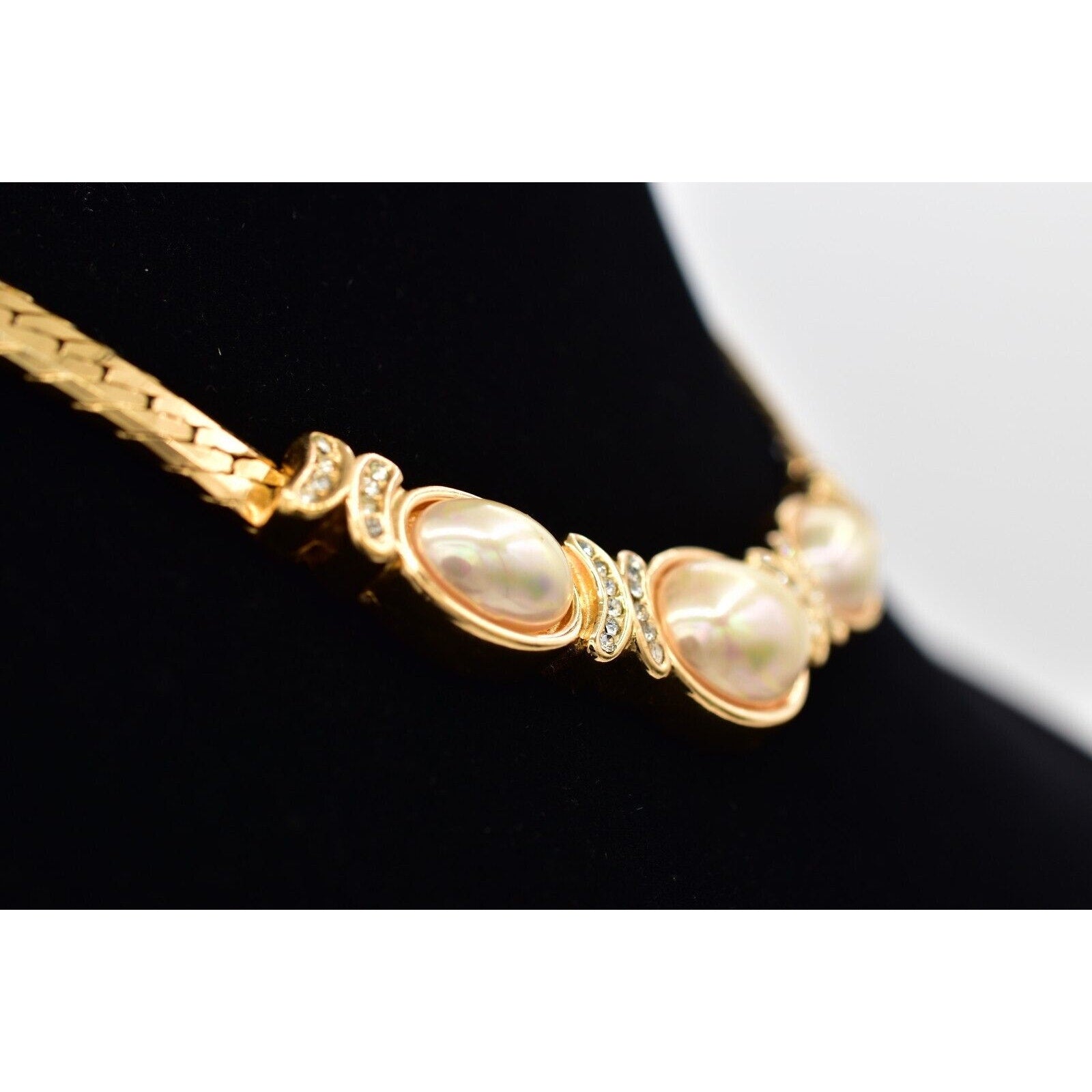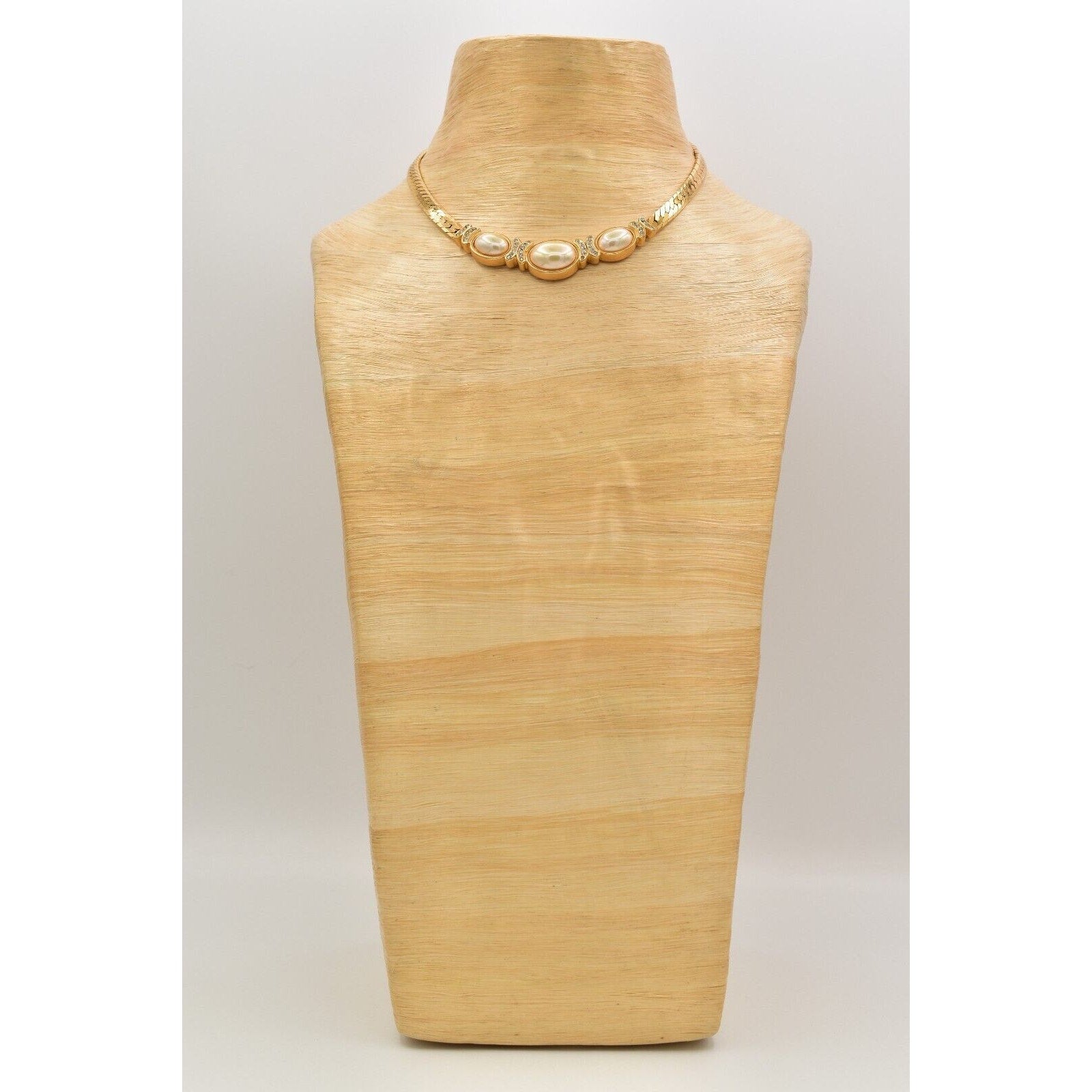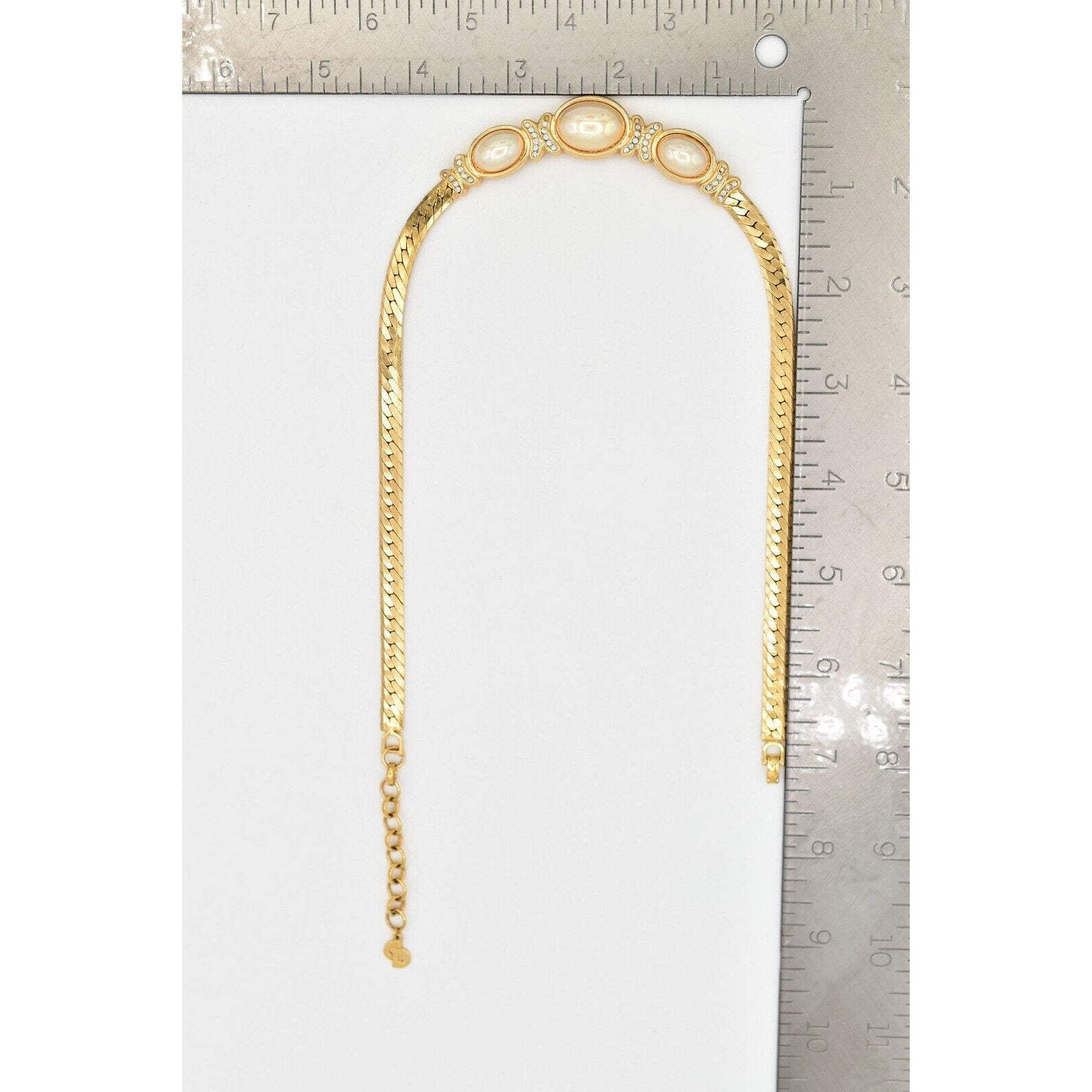 Vintage Christian Dior collar necklace with imitation pearls, pavé rhinestones and a chunky gold tone chain.