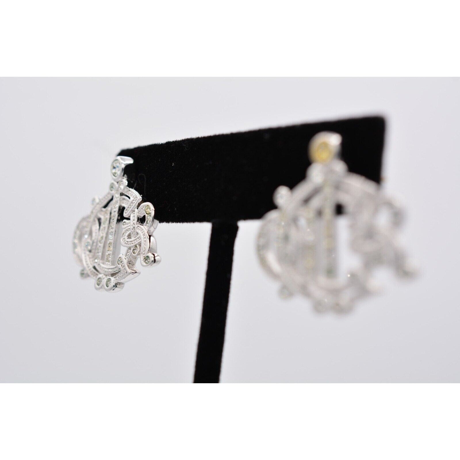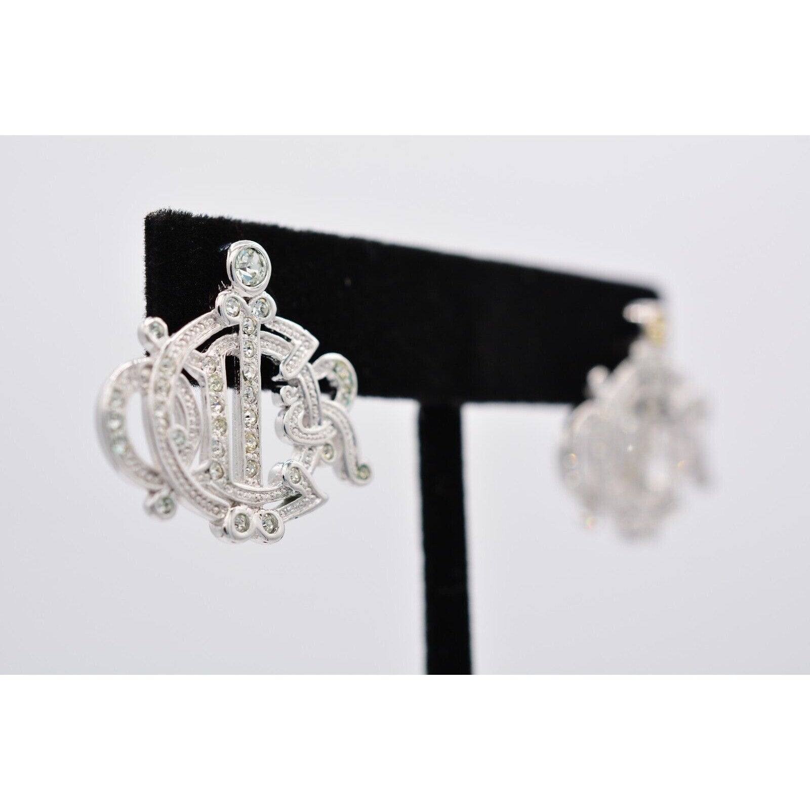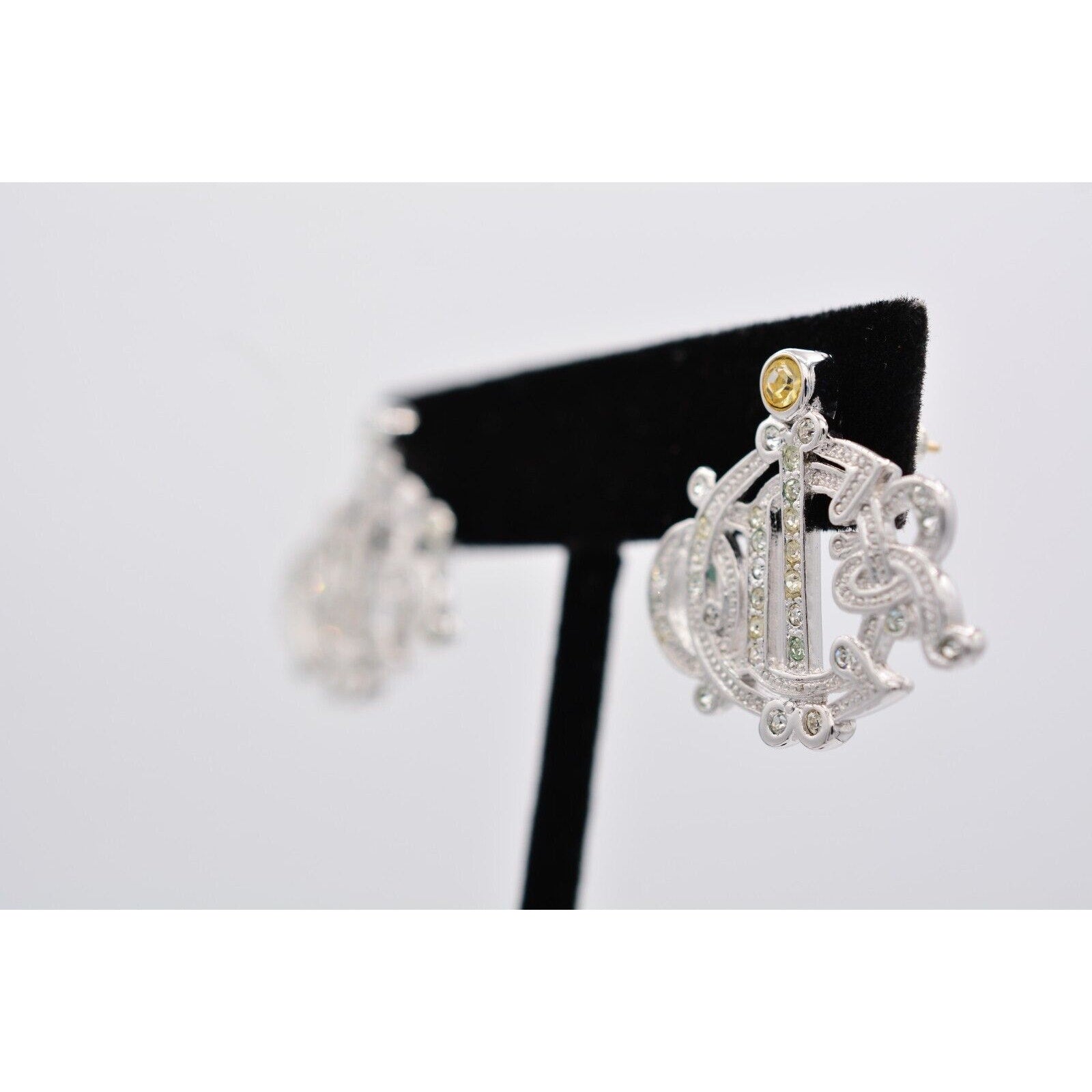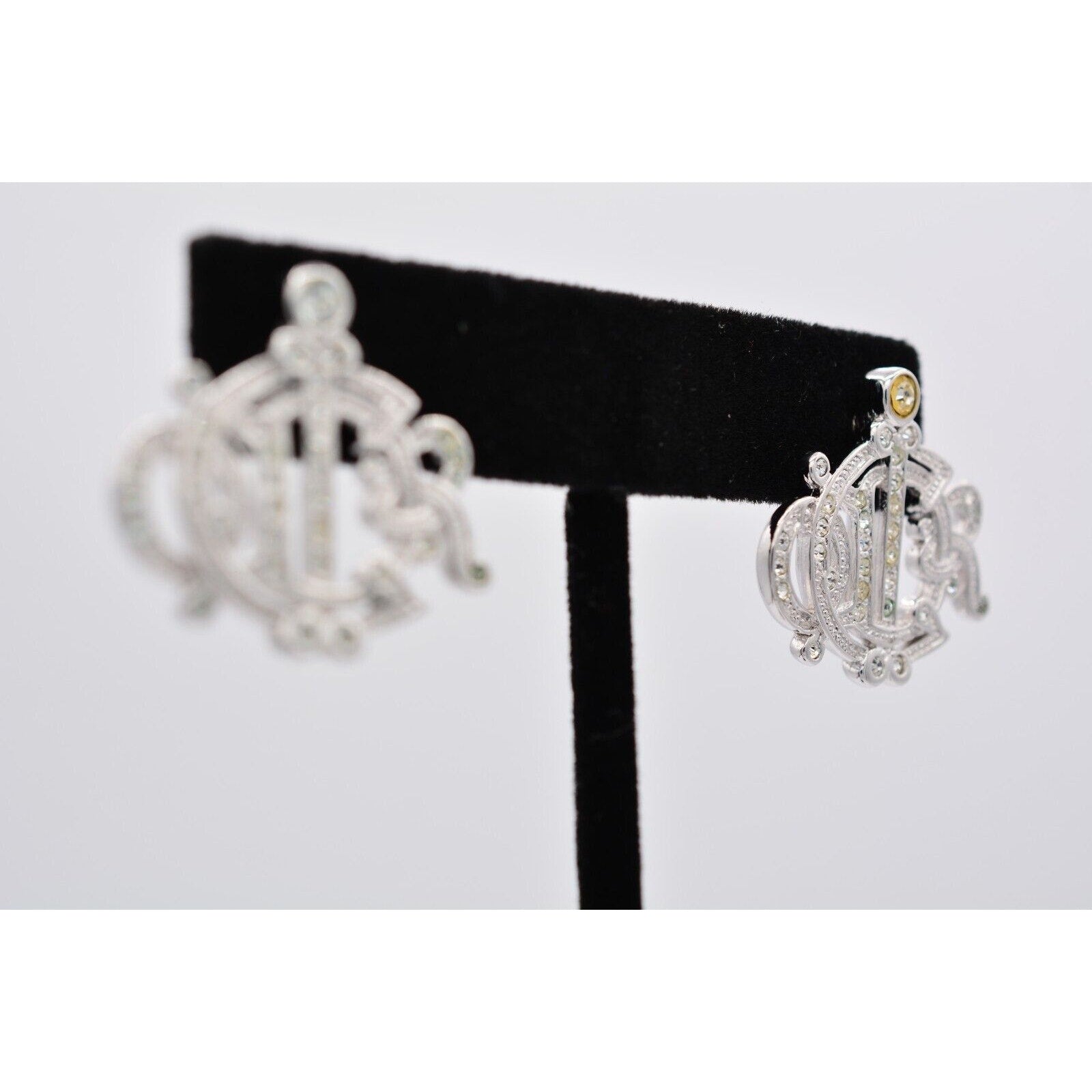 Christian Dior Vintage Script Earrings Insignia Logo Rhinestone Crystal 90s Bin1