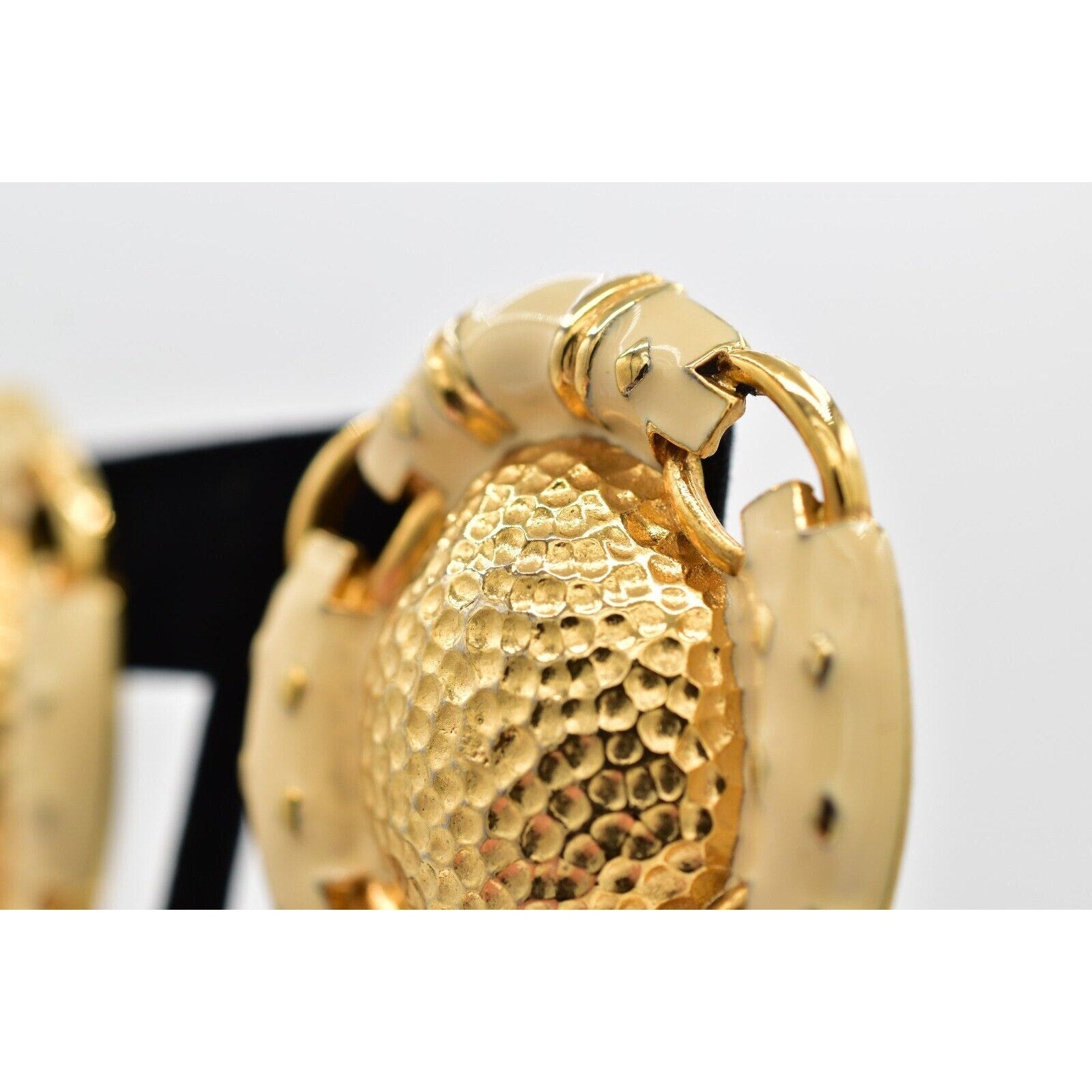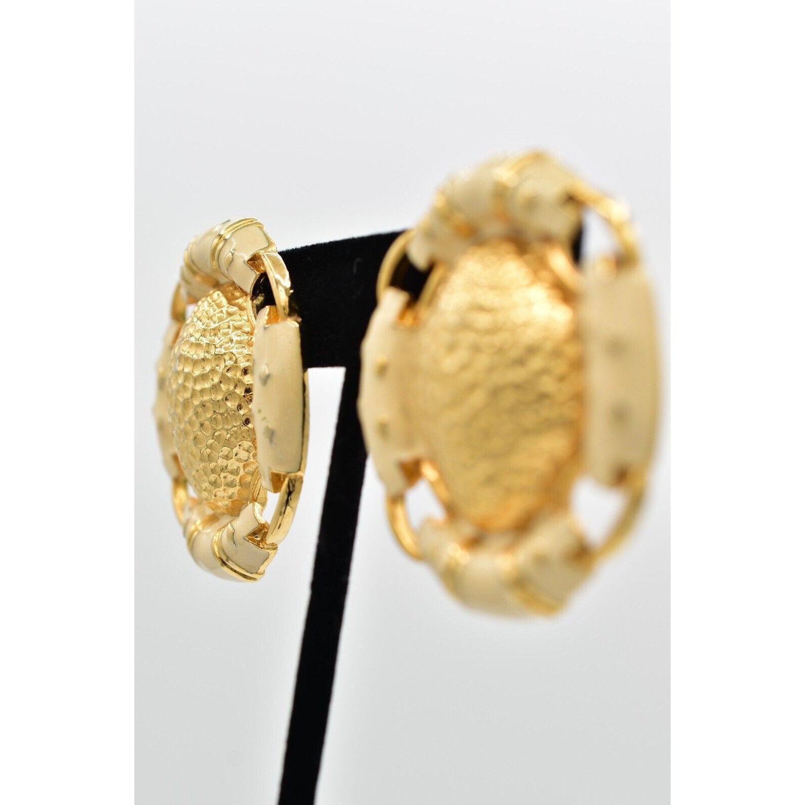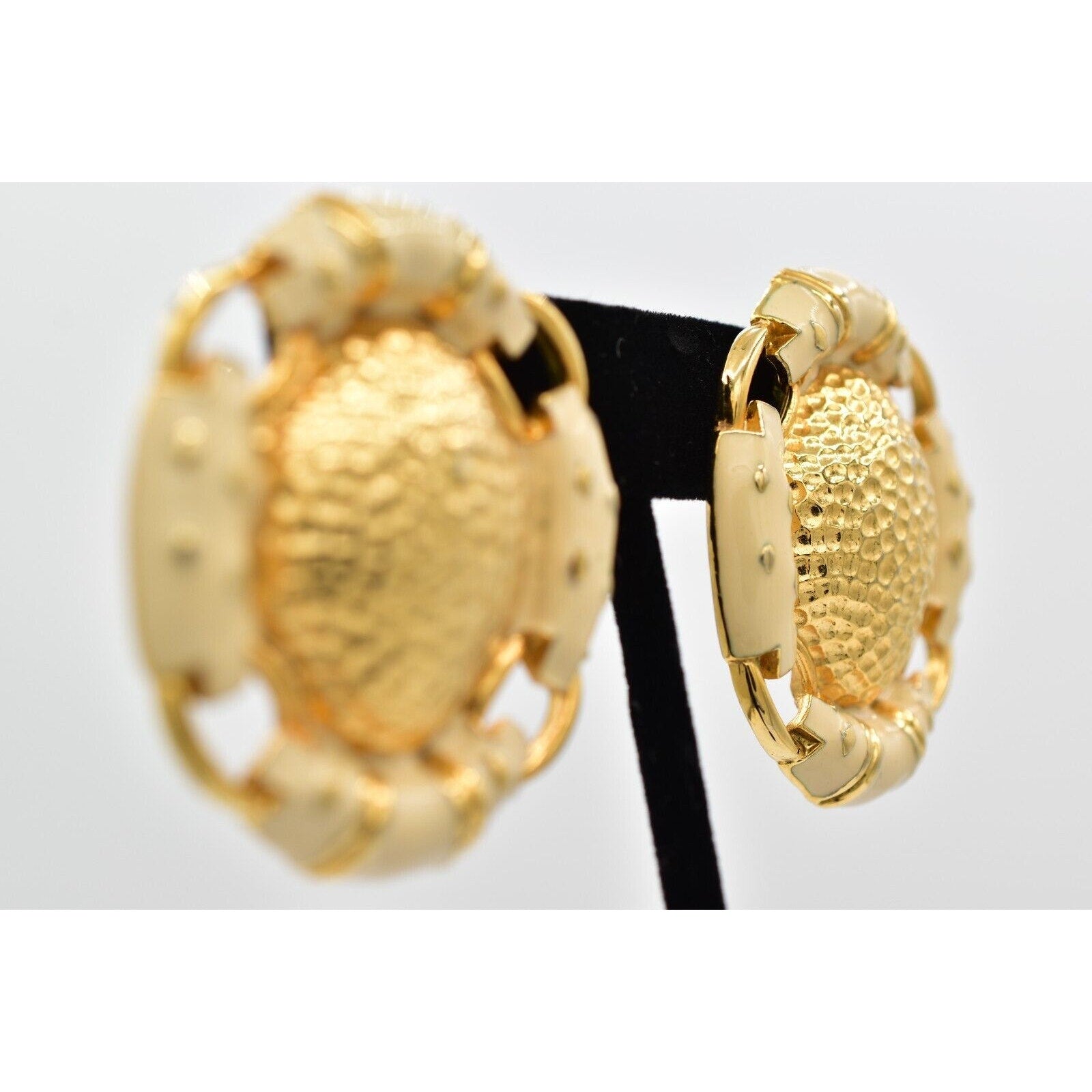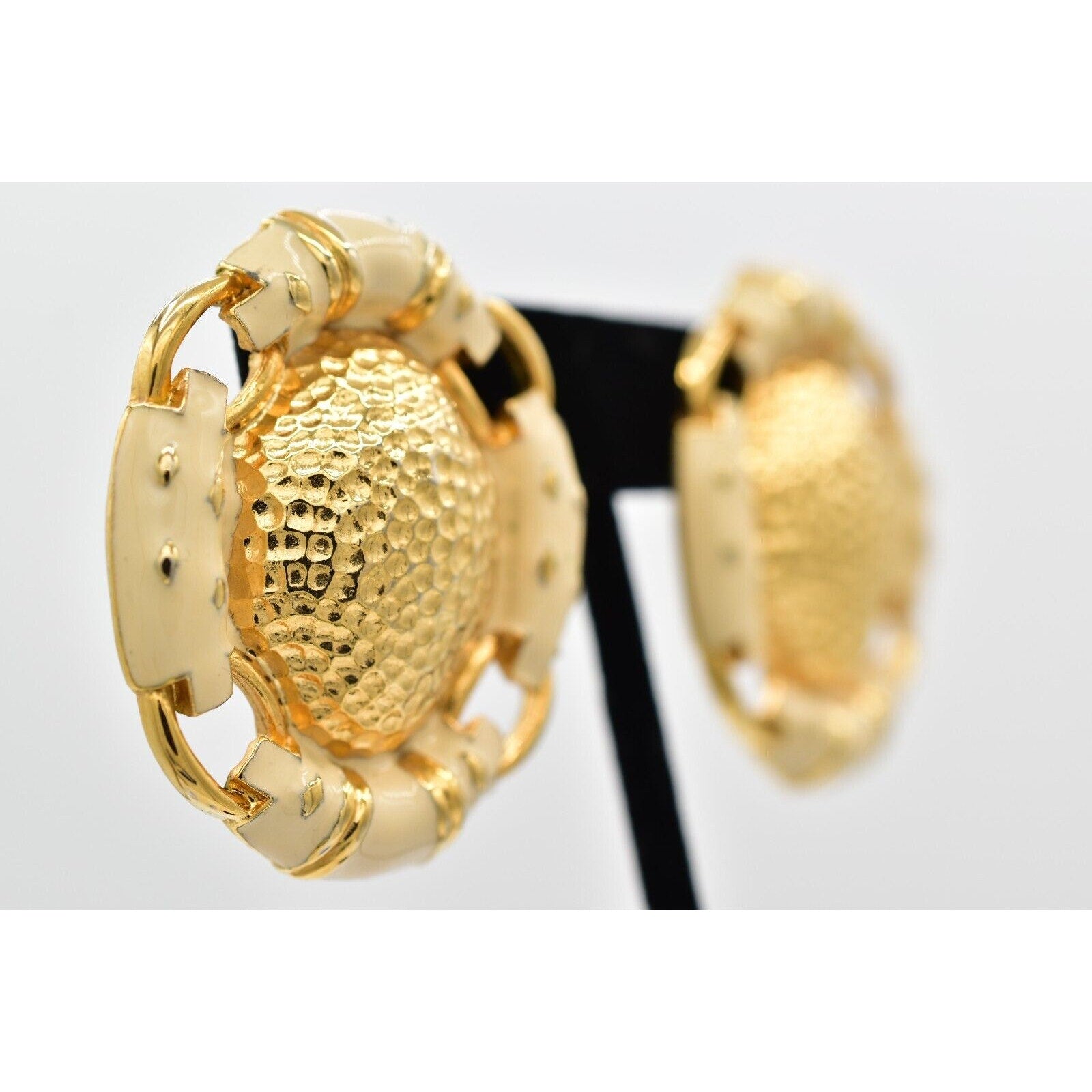 Chunky vintage earrings with creamy enamel and pebbled gold.