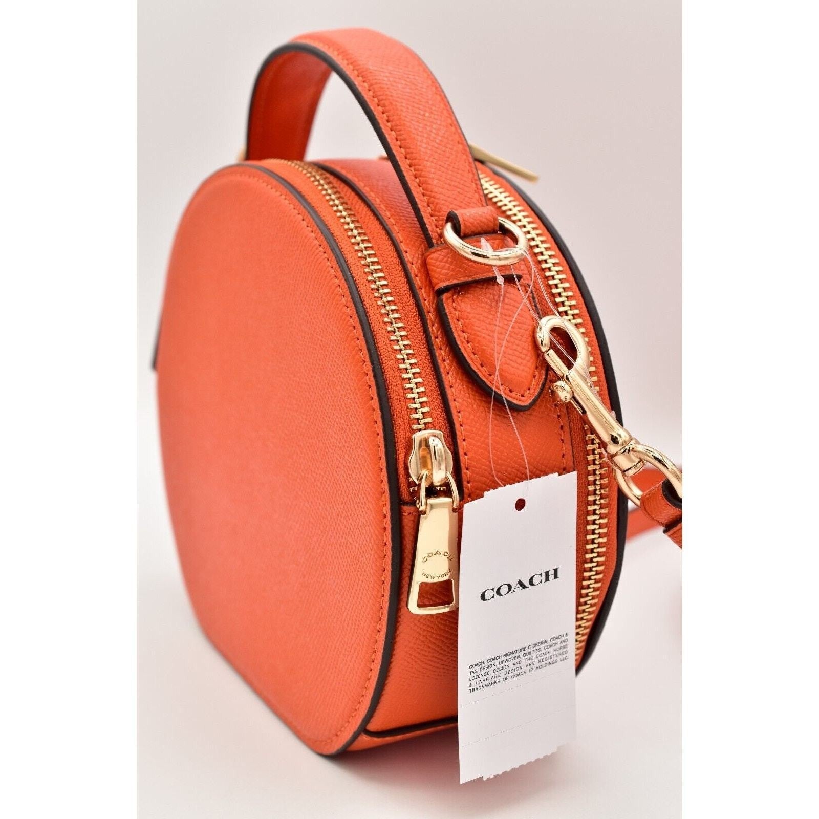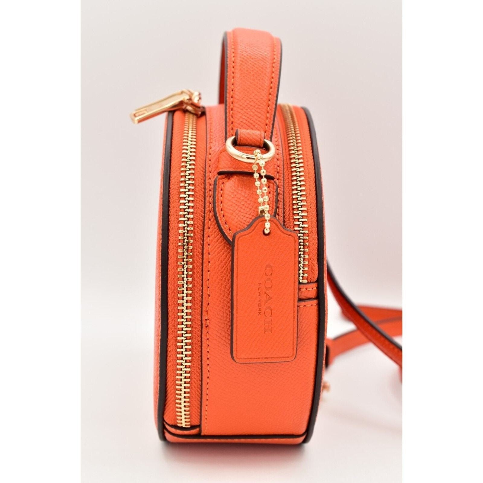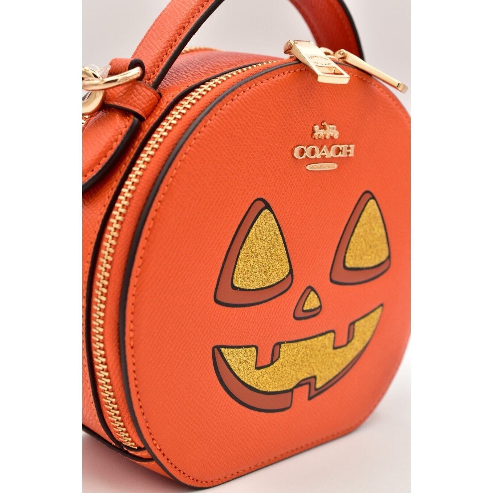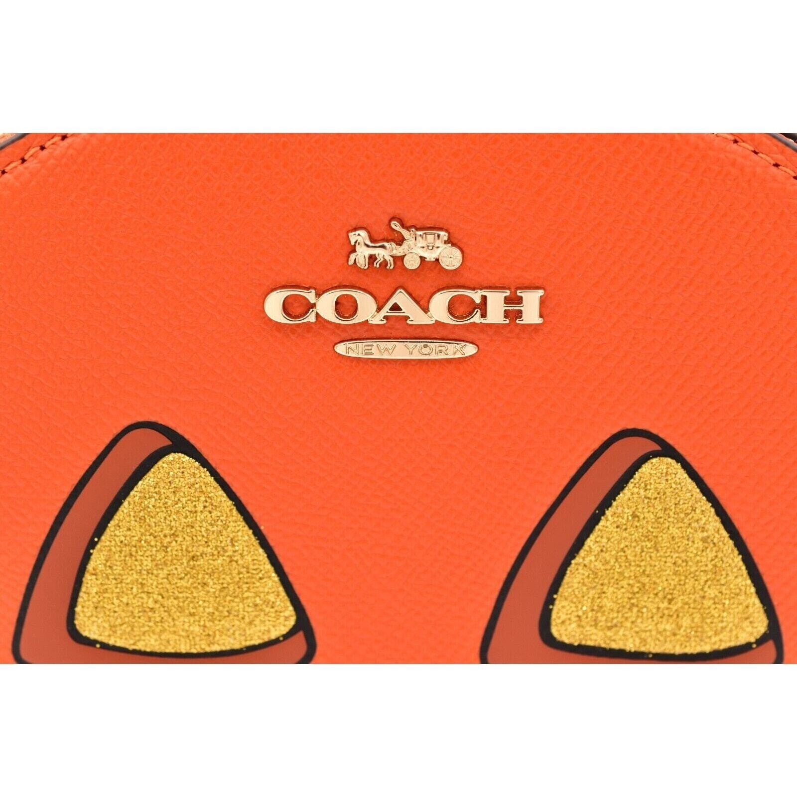Adorable Coach 2024 Halloween Edition round crossbody bag in bright orange crossgrain leather with a glittery jack-o’-lantern face. Compact but functional with a double-zip design, top handle, and detachable strap—perfect for fall, Disney nights, or year-round spooky-cute style.