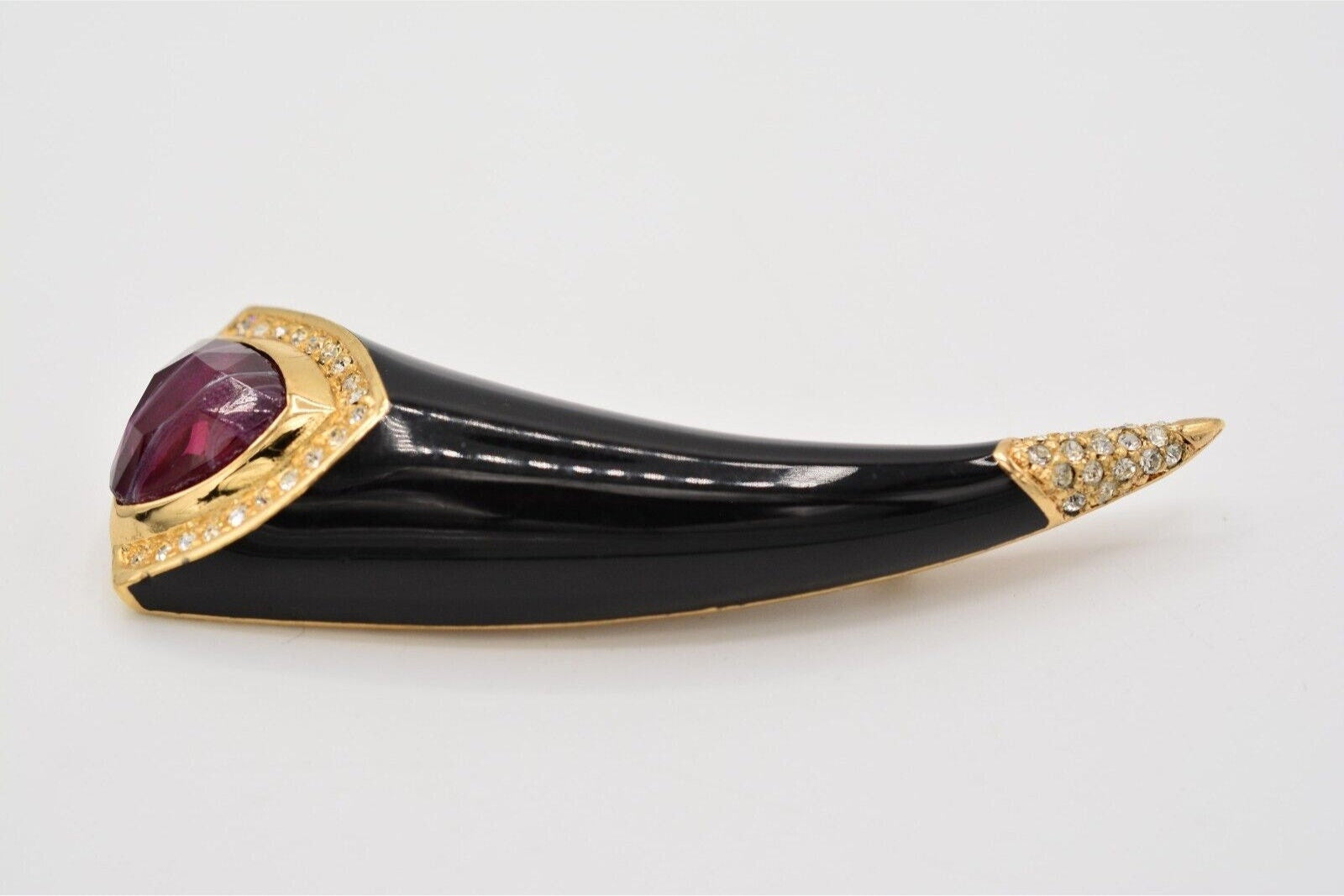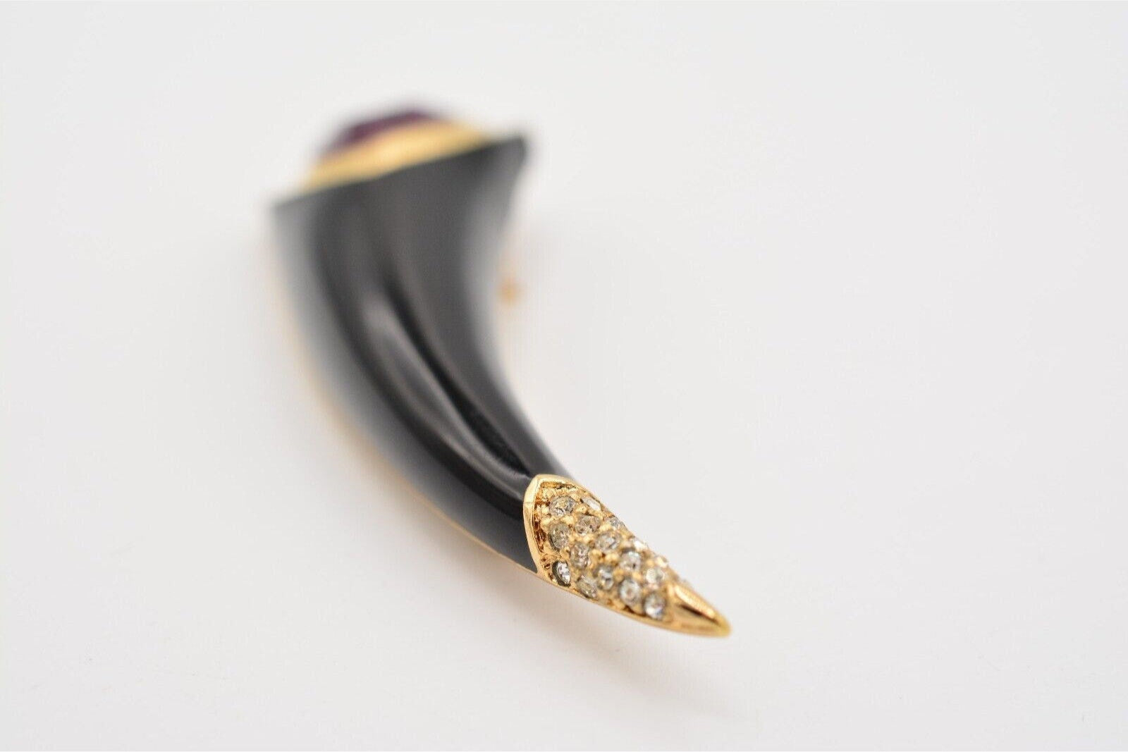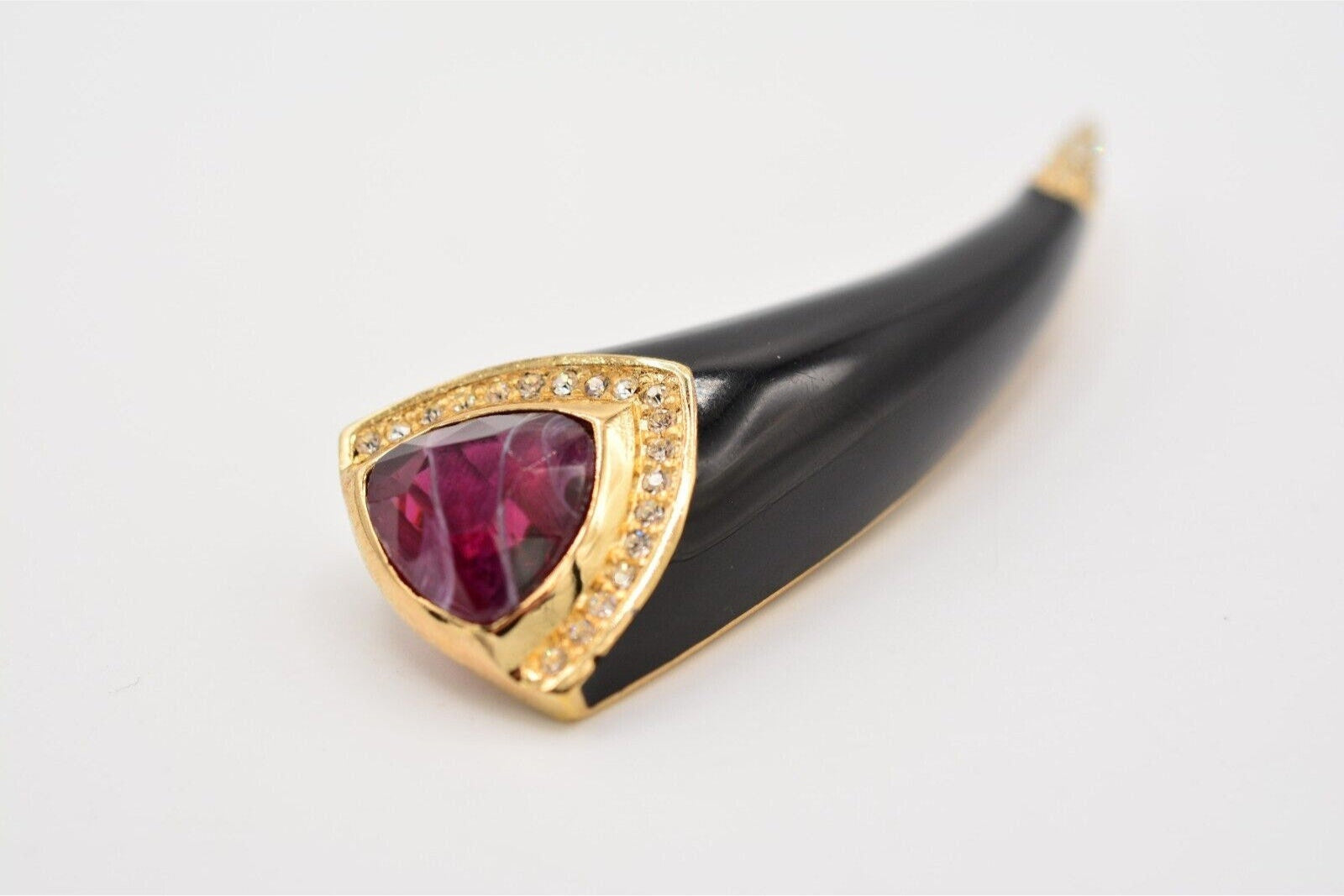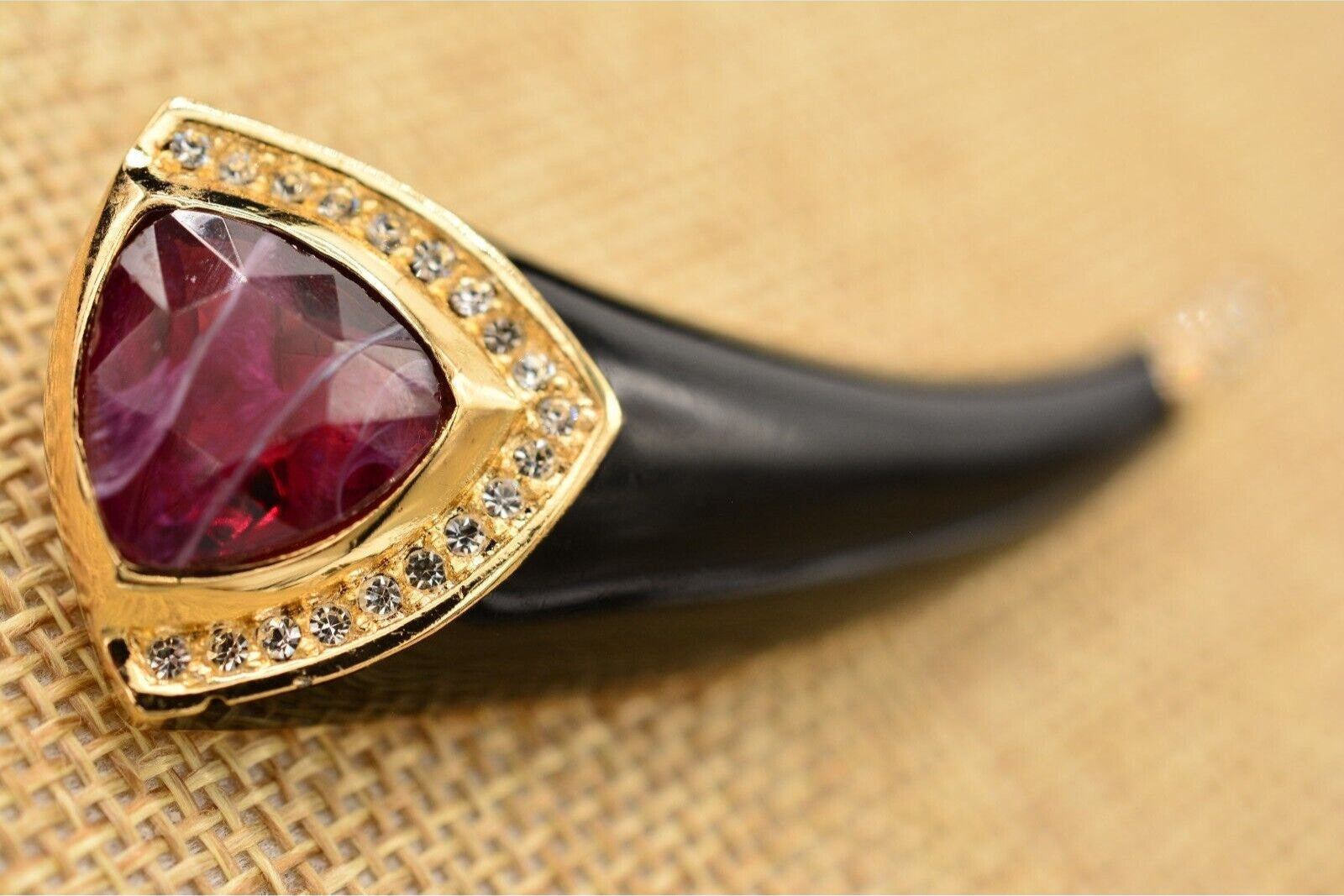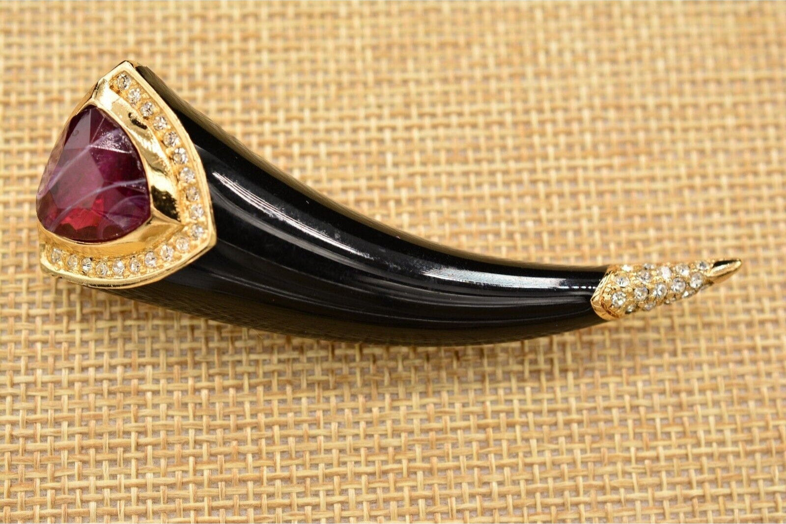 Vintage Christian Dior horn pin with vibrant red cat's eye cabochon and shiny black enamel.
