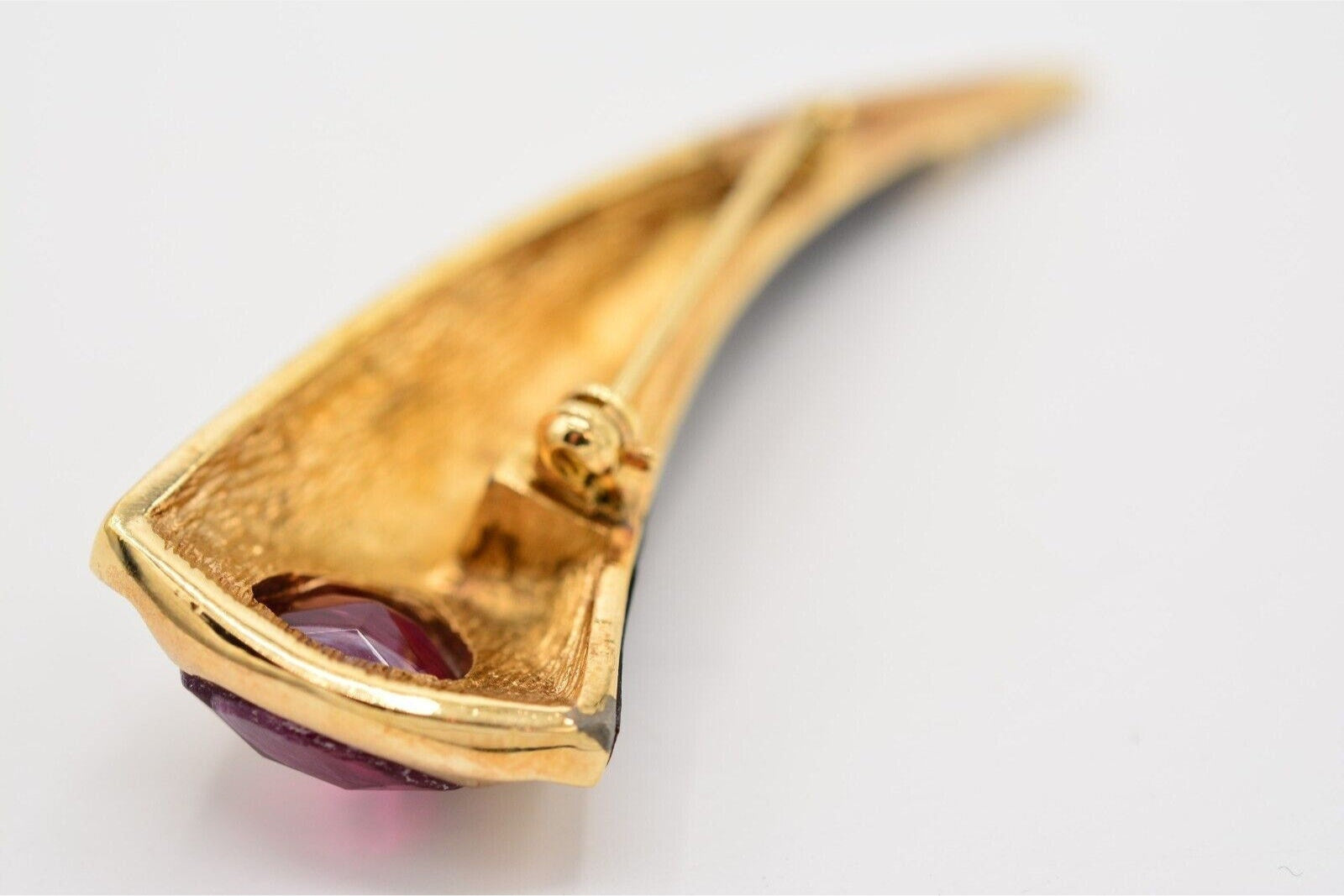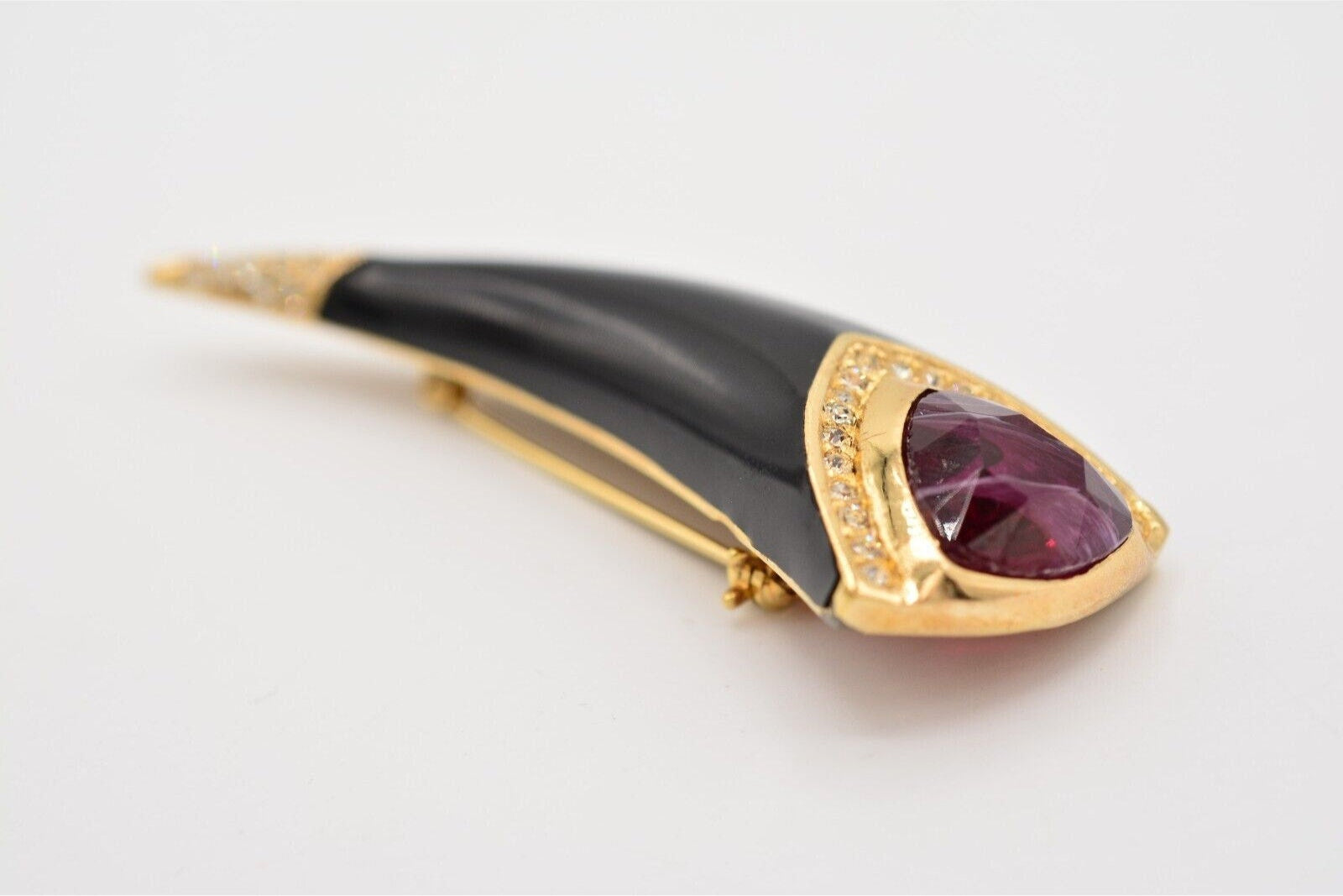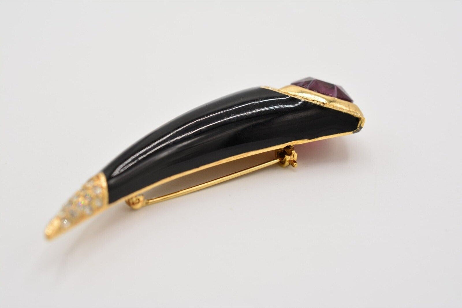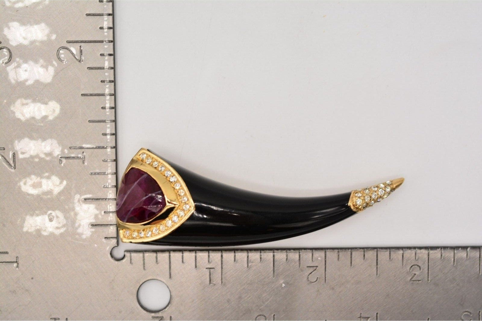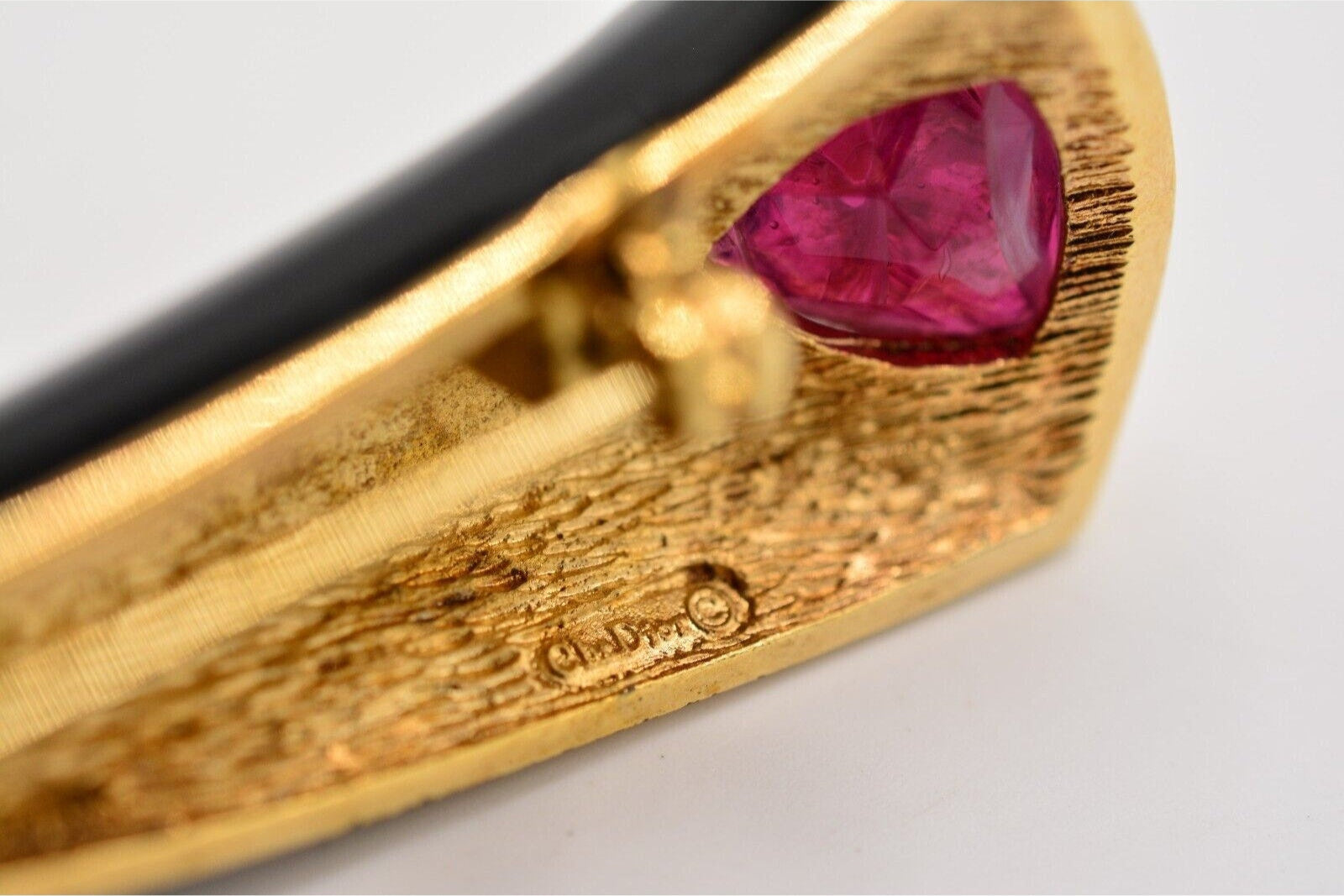 Vintage Christian Dior horn pin with vibrant red cat's eye cabochon and shiny black enamel.