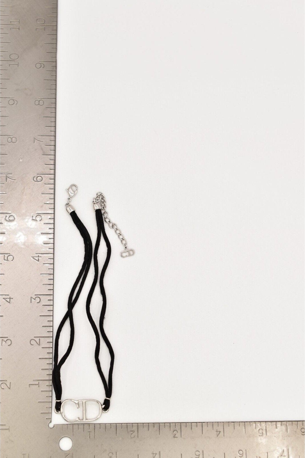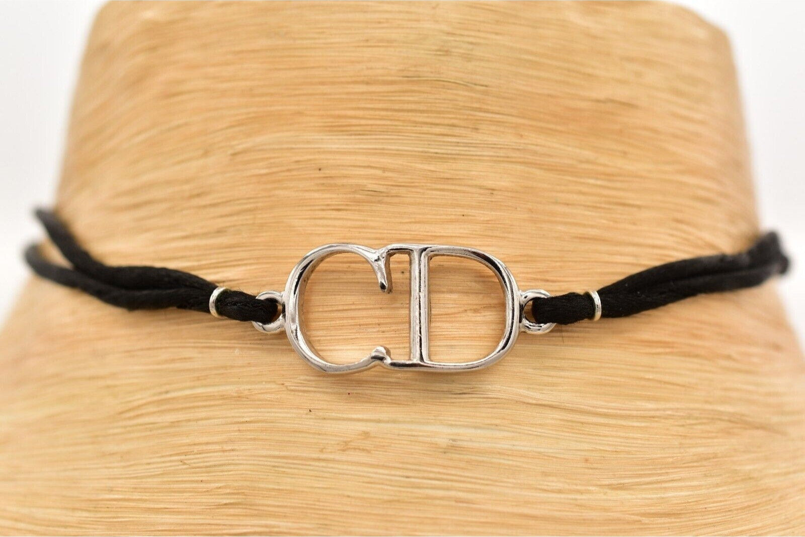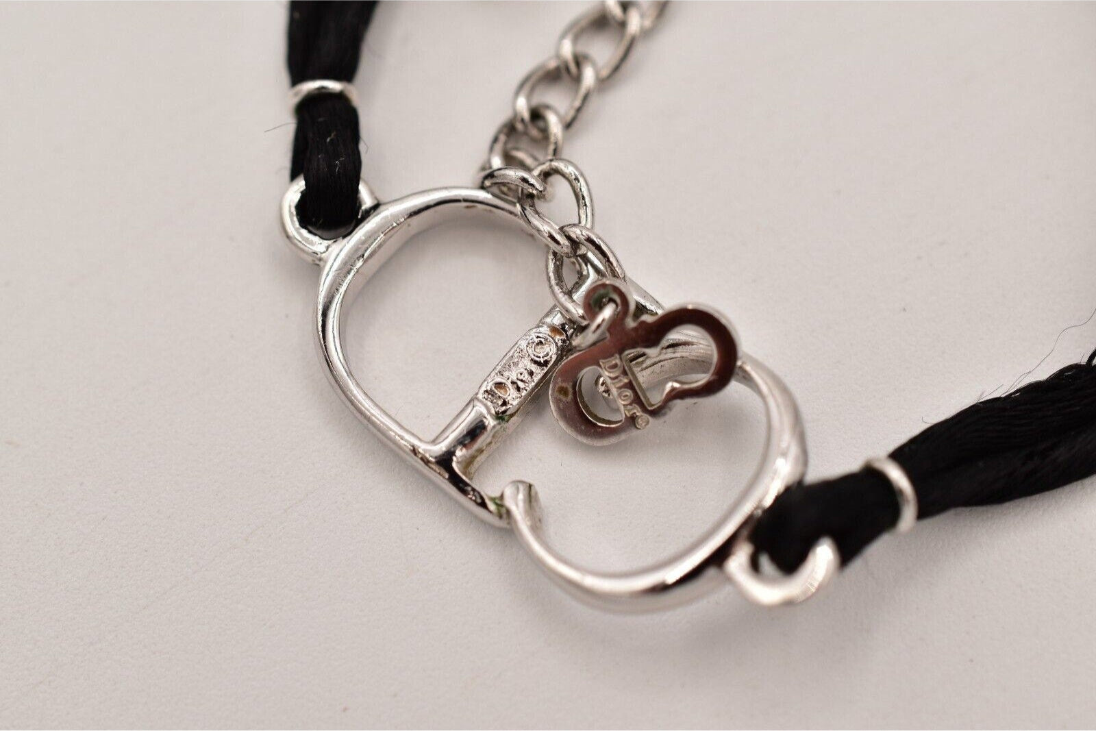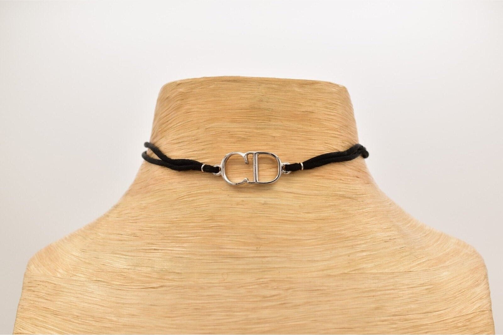 Christian Dior Y2K choker with silver CD logo center and black rope. Signed "Dior" on the CD tag and behind the logo.