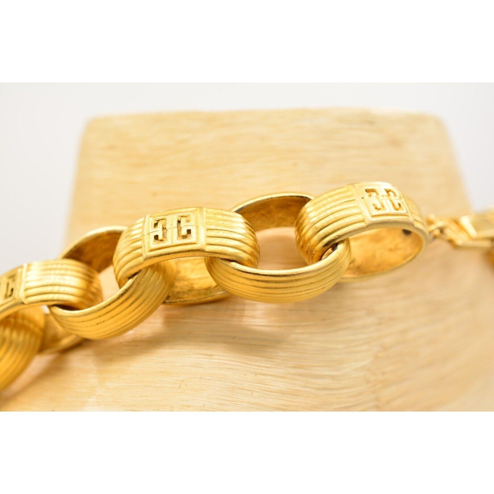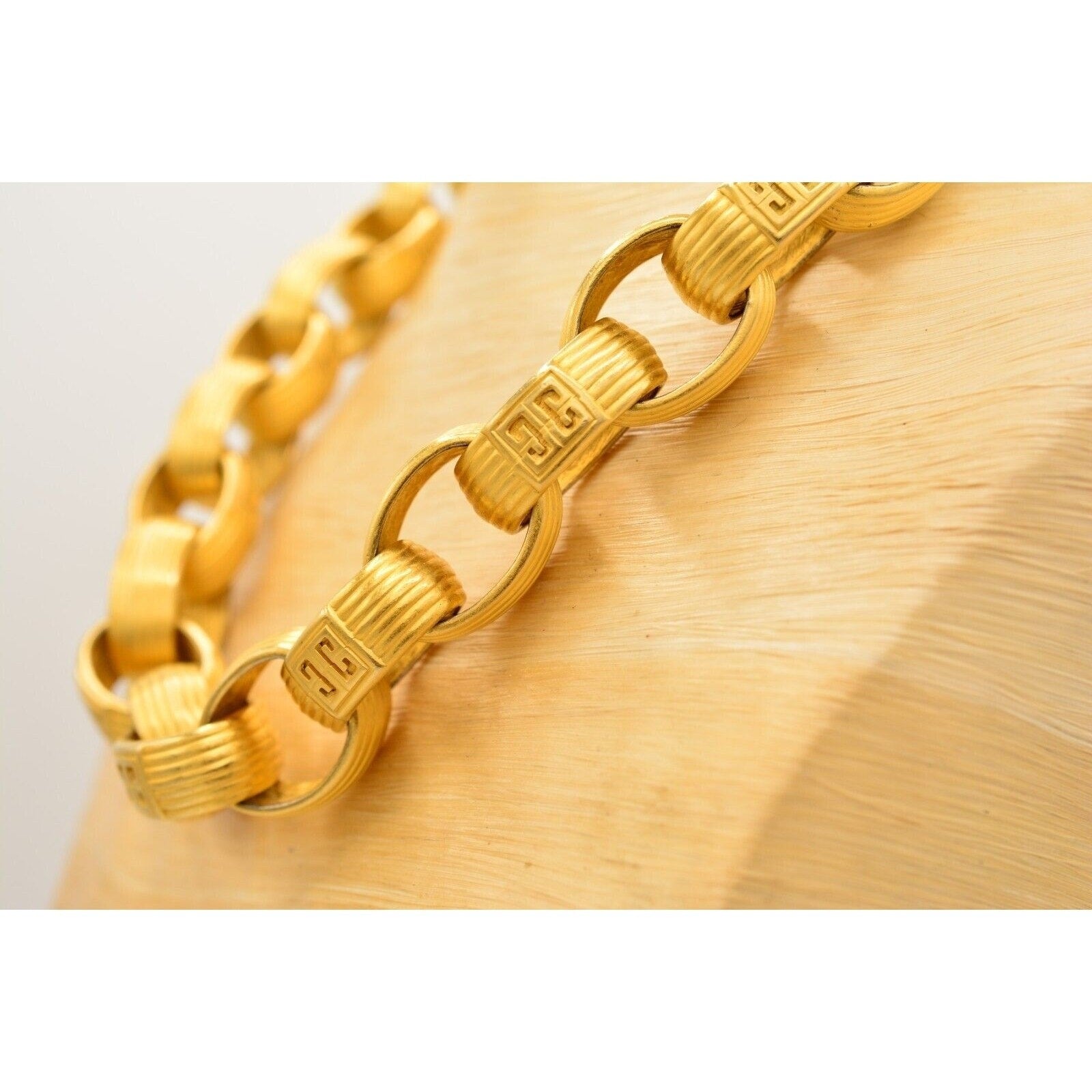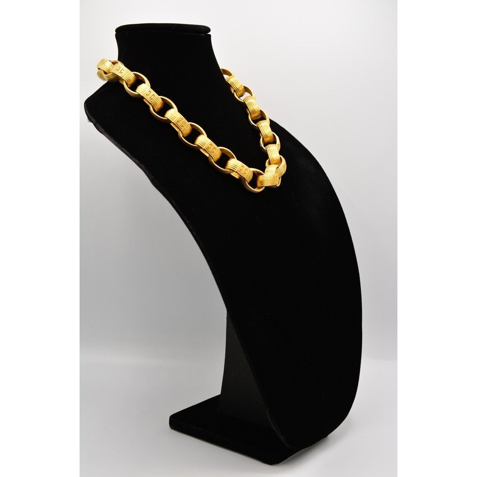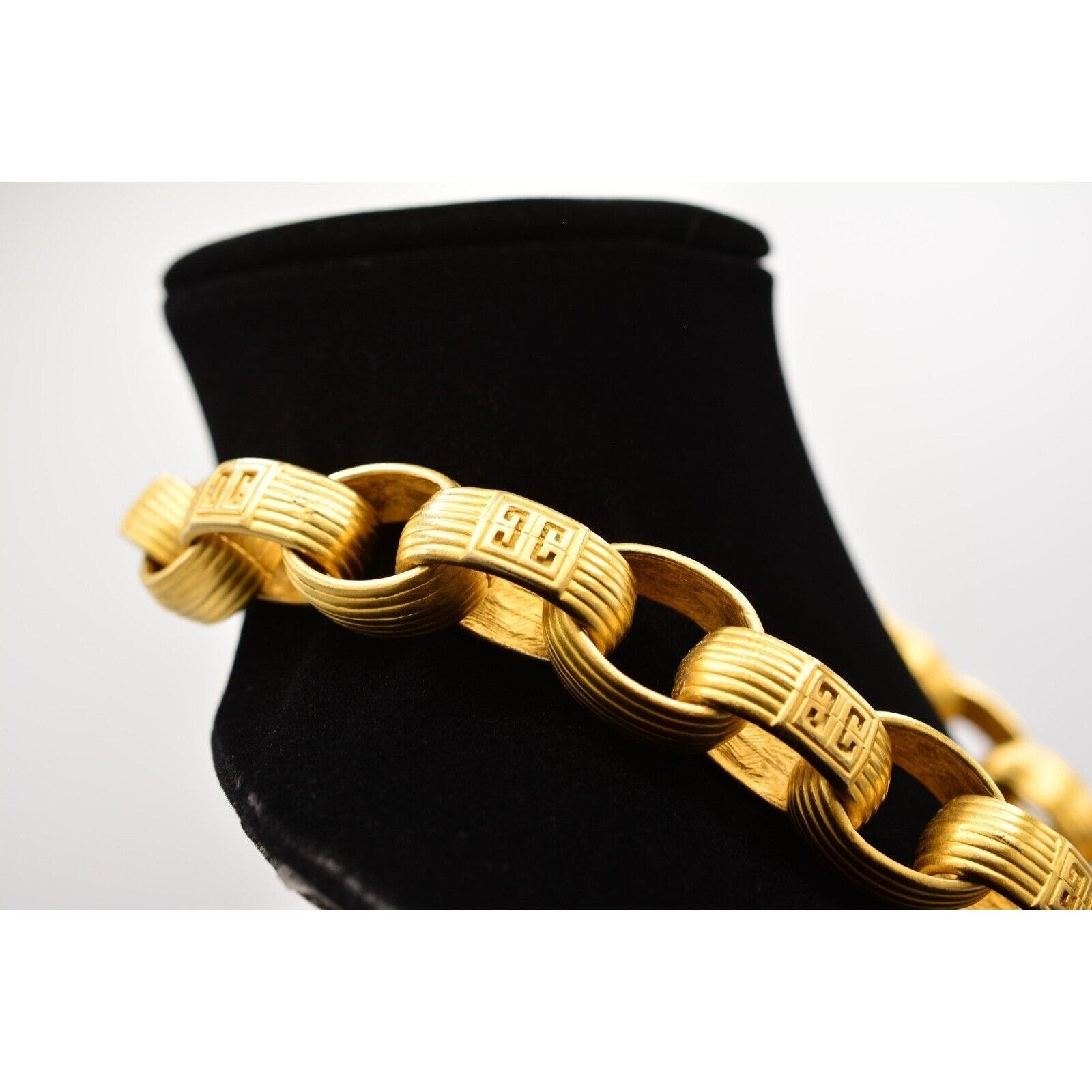 Iconic 80s Givenchy power jewelry—this vintage statement necklace features bold, weighted links with a luxe brushed/matte gold-tone finish and signature logo detailing. Substantial, runway-ready, and unmistakably designer.
