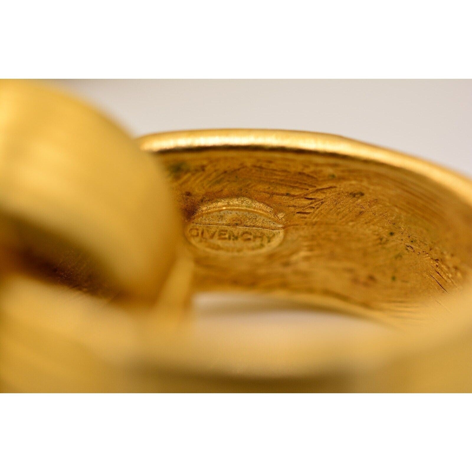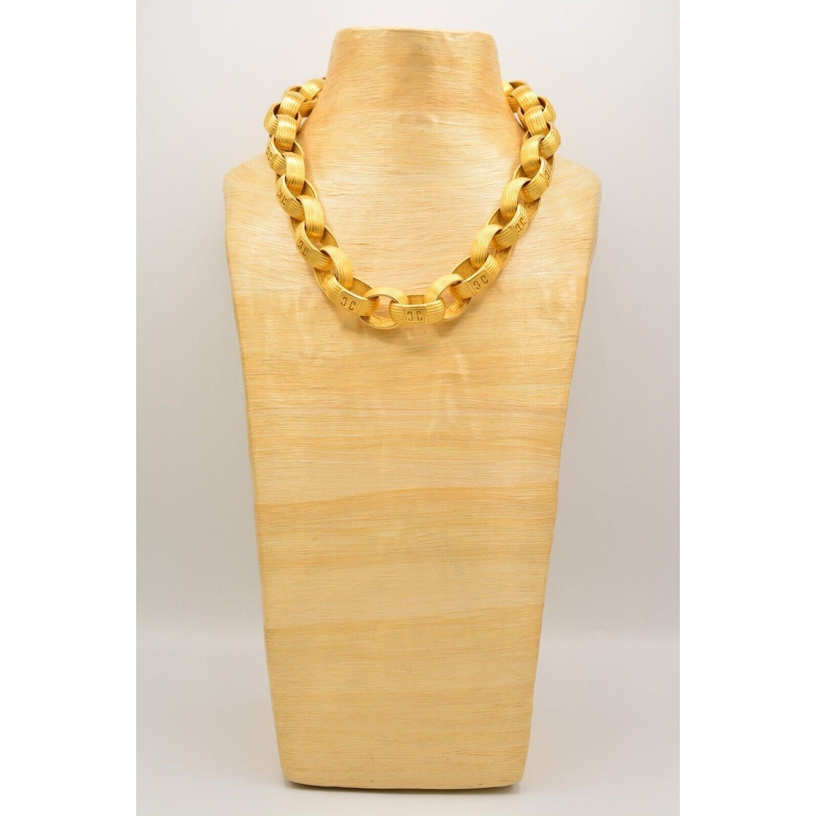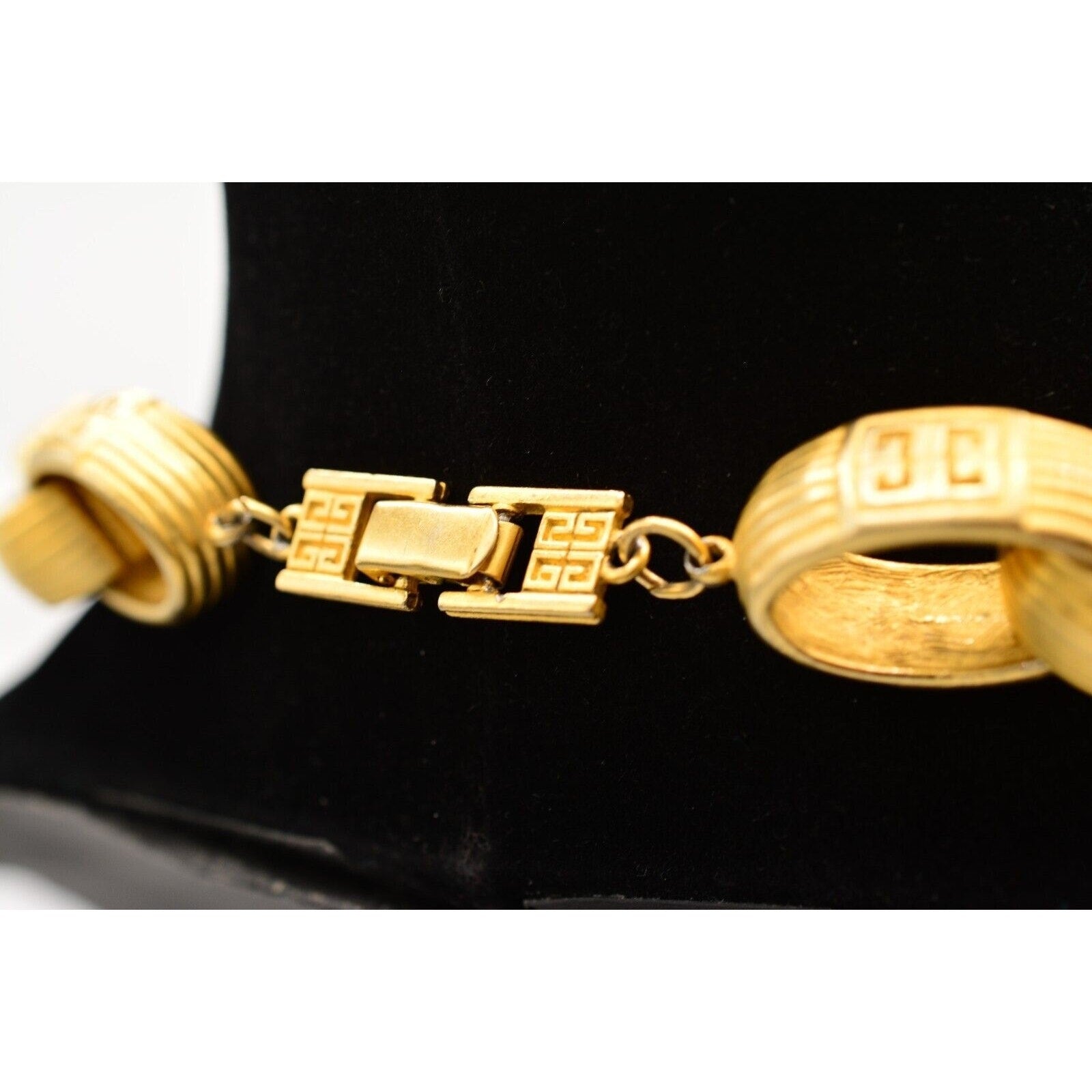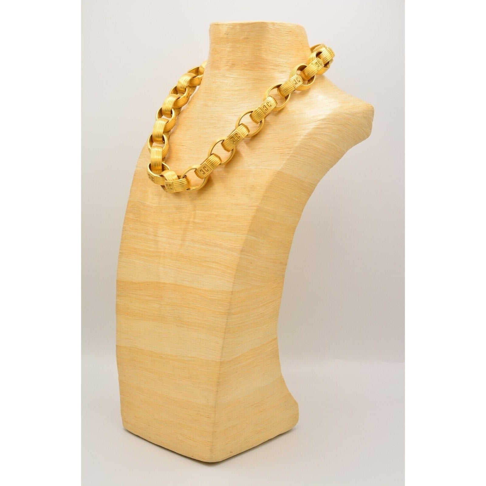 Iconic 80s Givenchy power jewelry—this vintage statement necklace features bold, weighted links with a luxe brushed/matte gold-tone finish and signature logo detailing. Substantial, runway-ready, and unmistakably designer.
