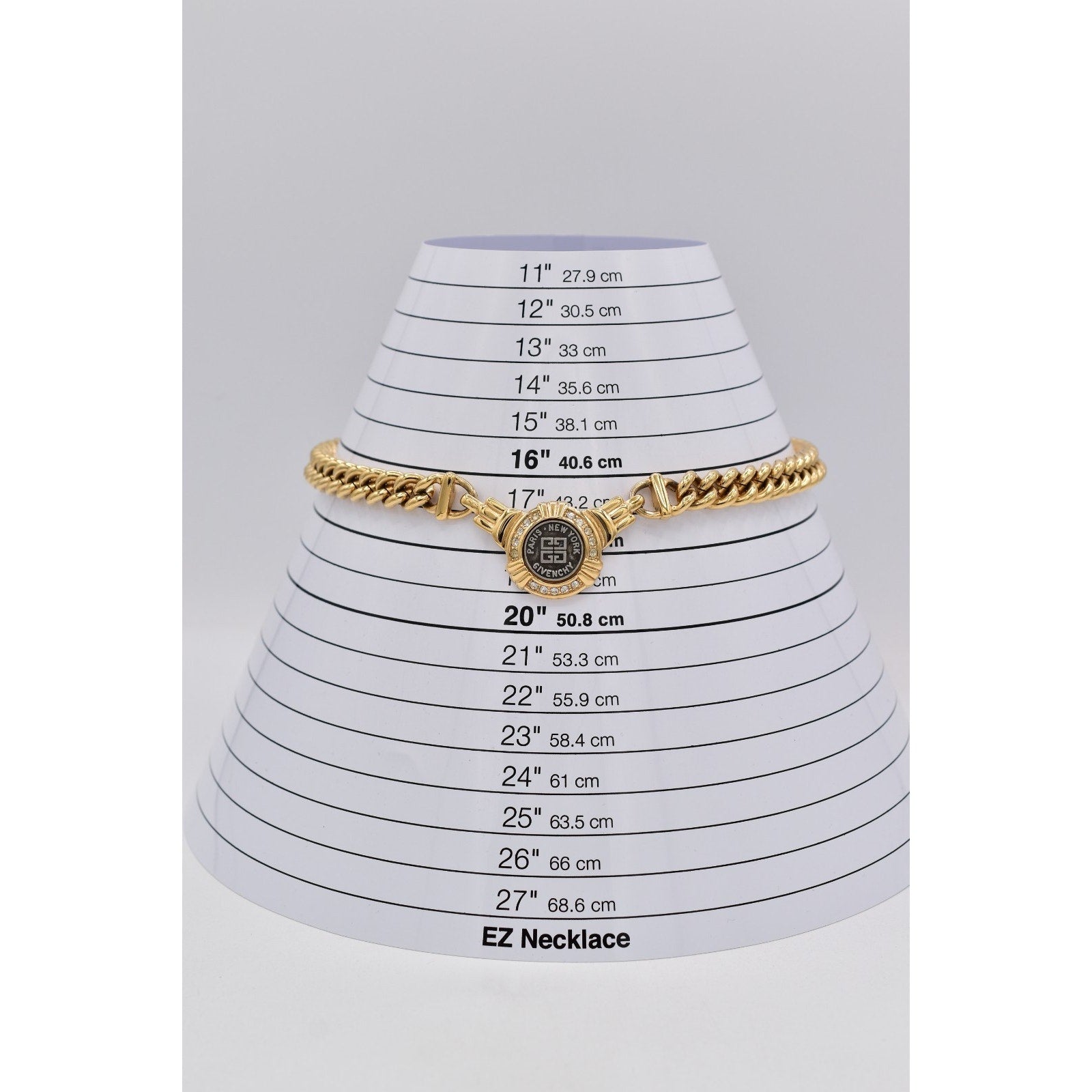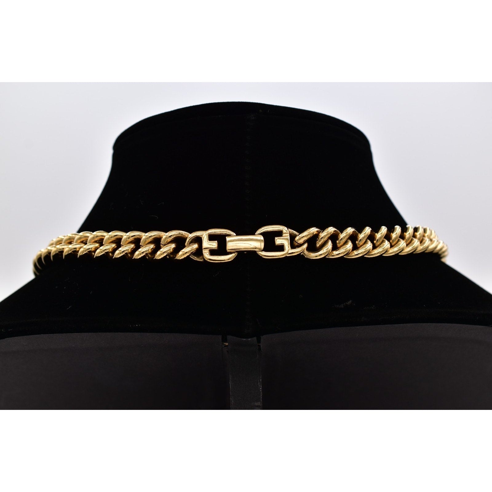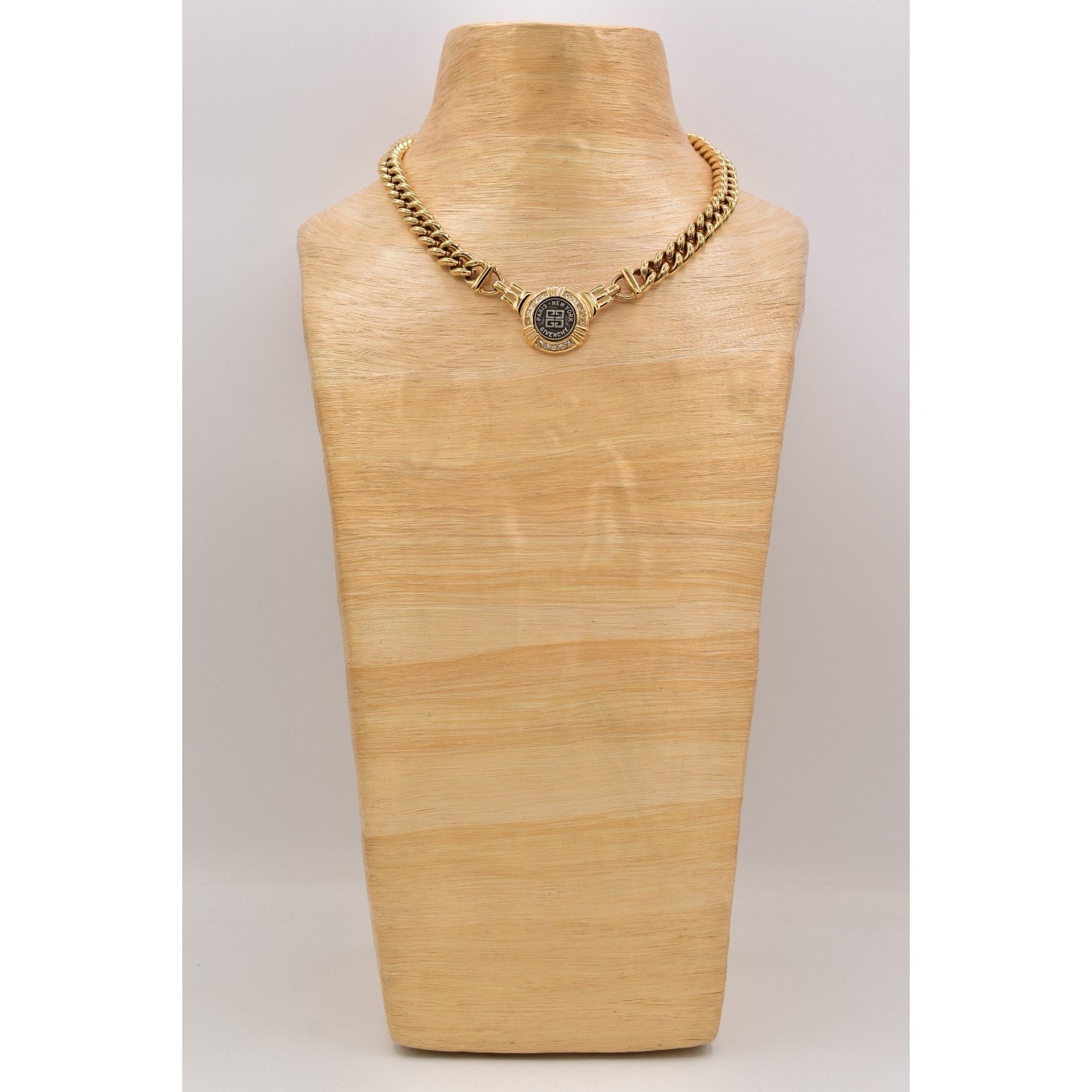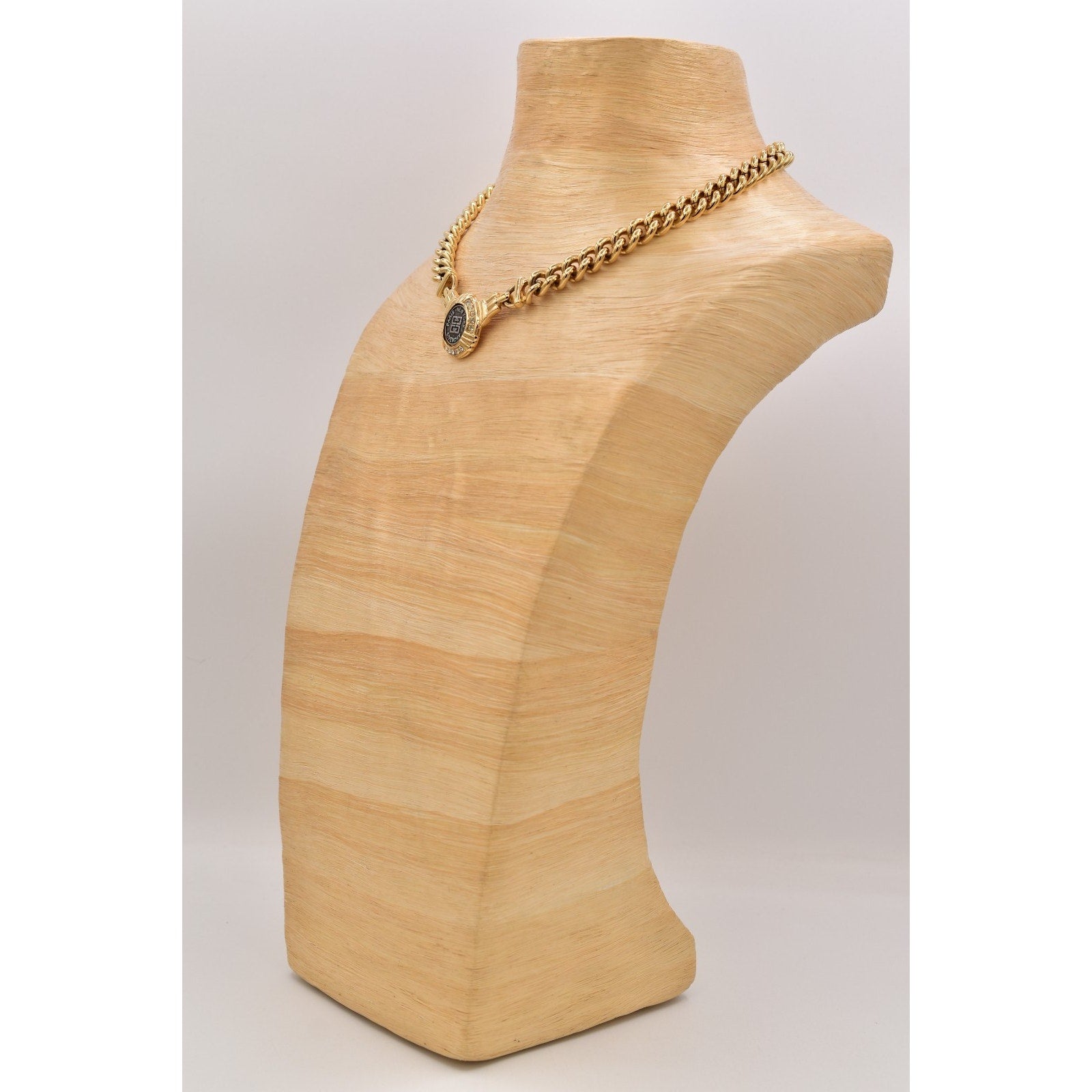 Iconic Givenchy vintage necklace featuring a bold gold-tone curb chain and signature medallion centerpiece accented with sparkling rhinestones. A timeless designer statement that sits perfectly at the collarbone.