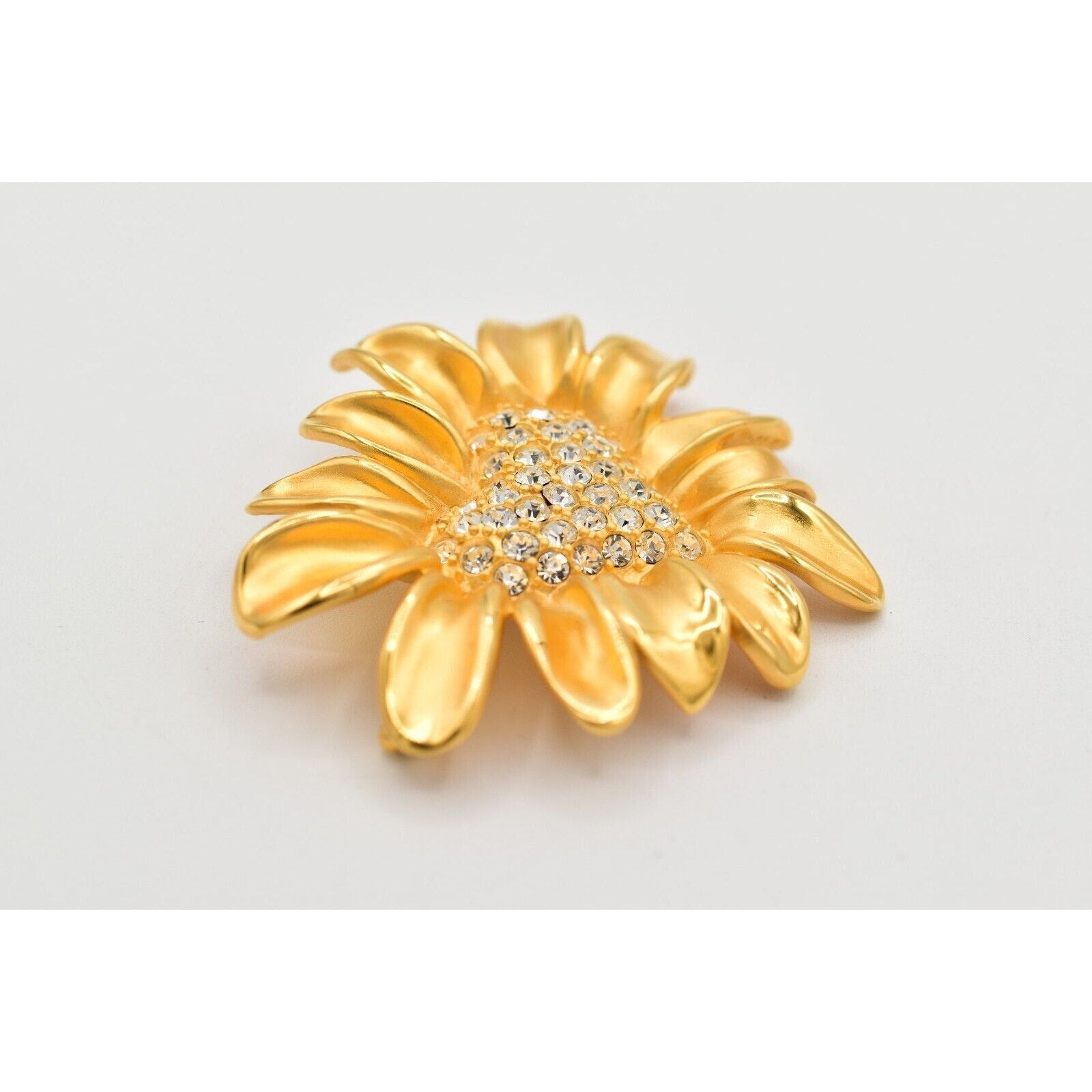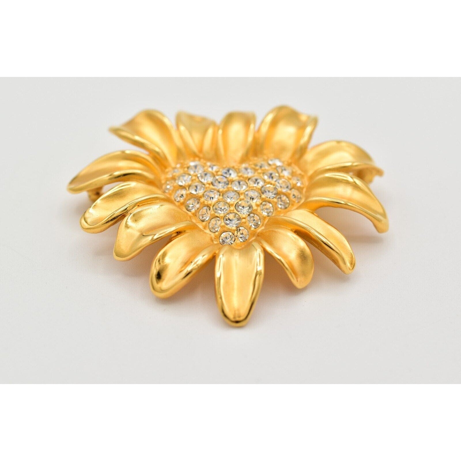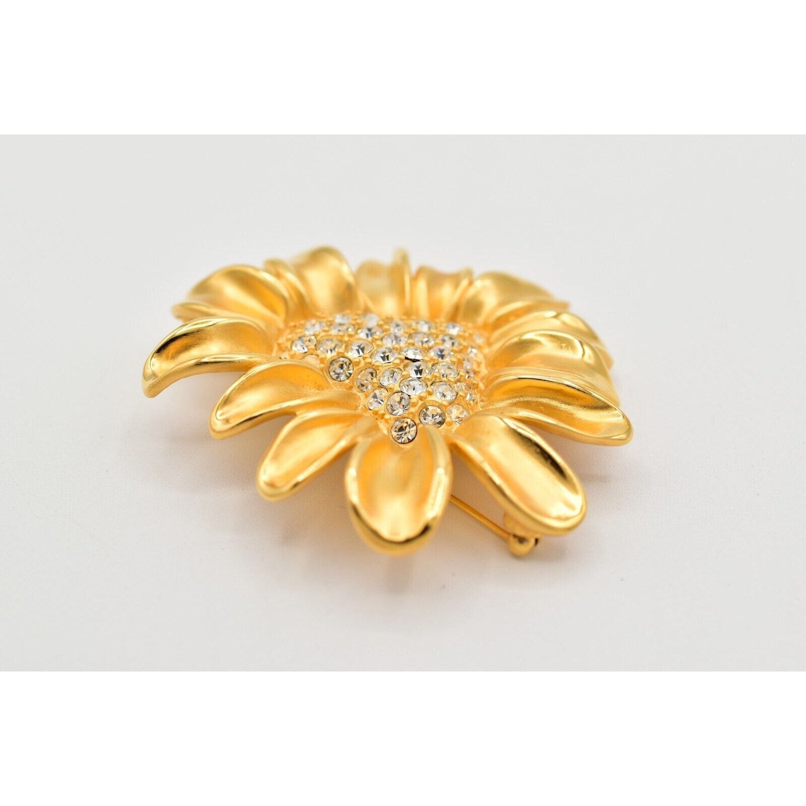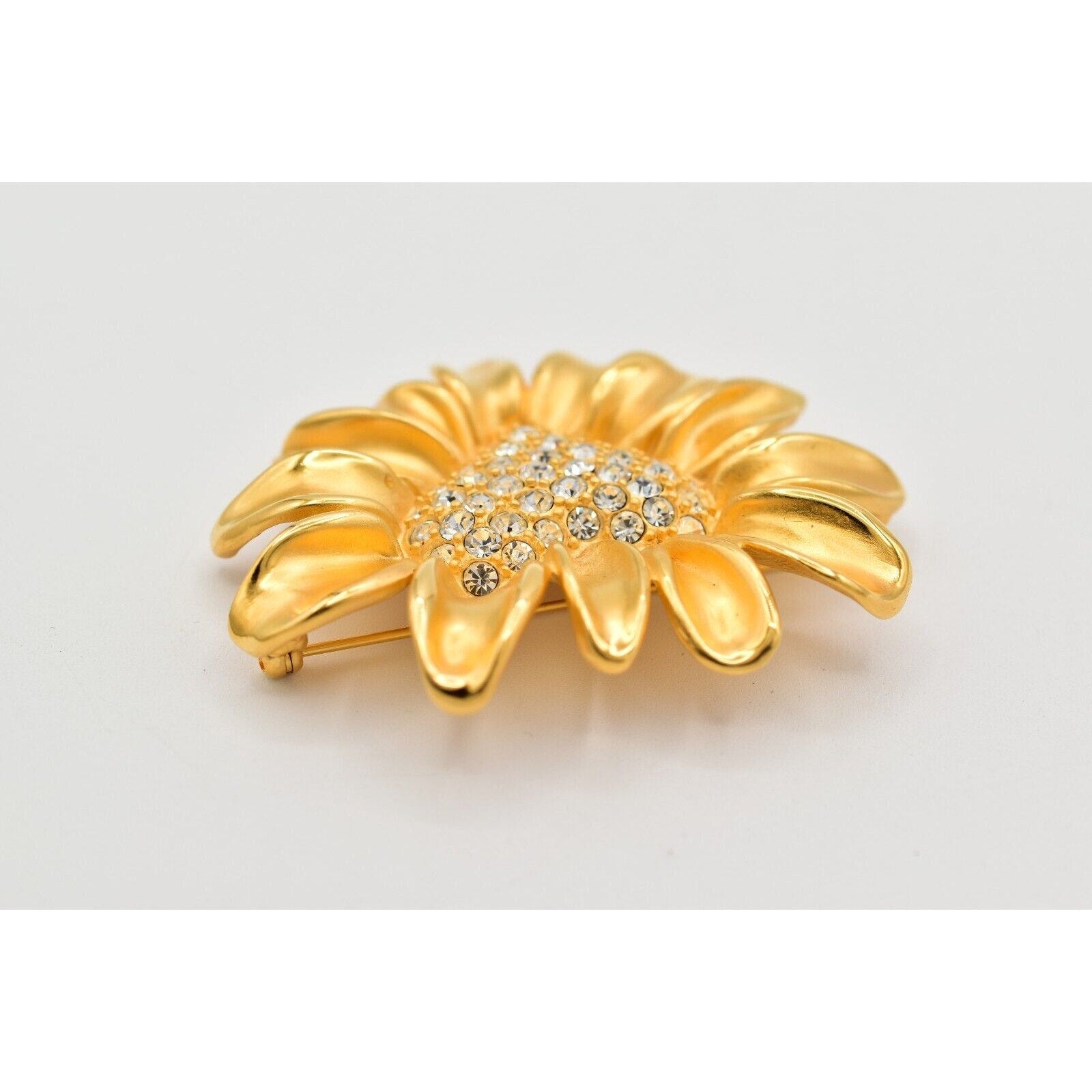 Givenchy floral statement brooch featuring a gleaming gold-tone daisy with a sparkling rhinestone heart center.