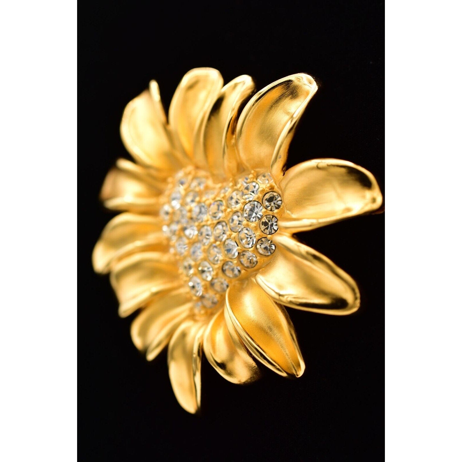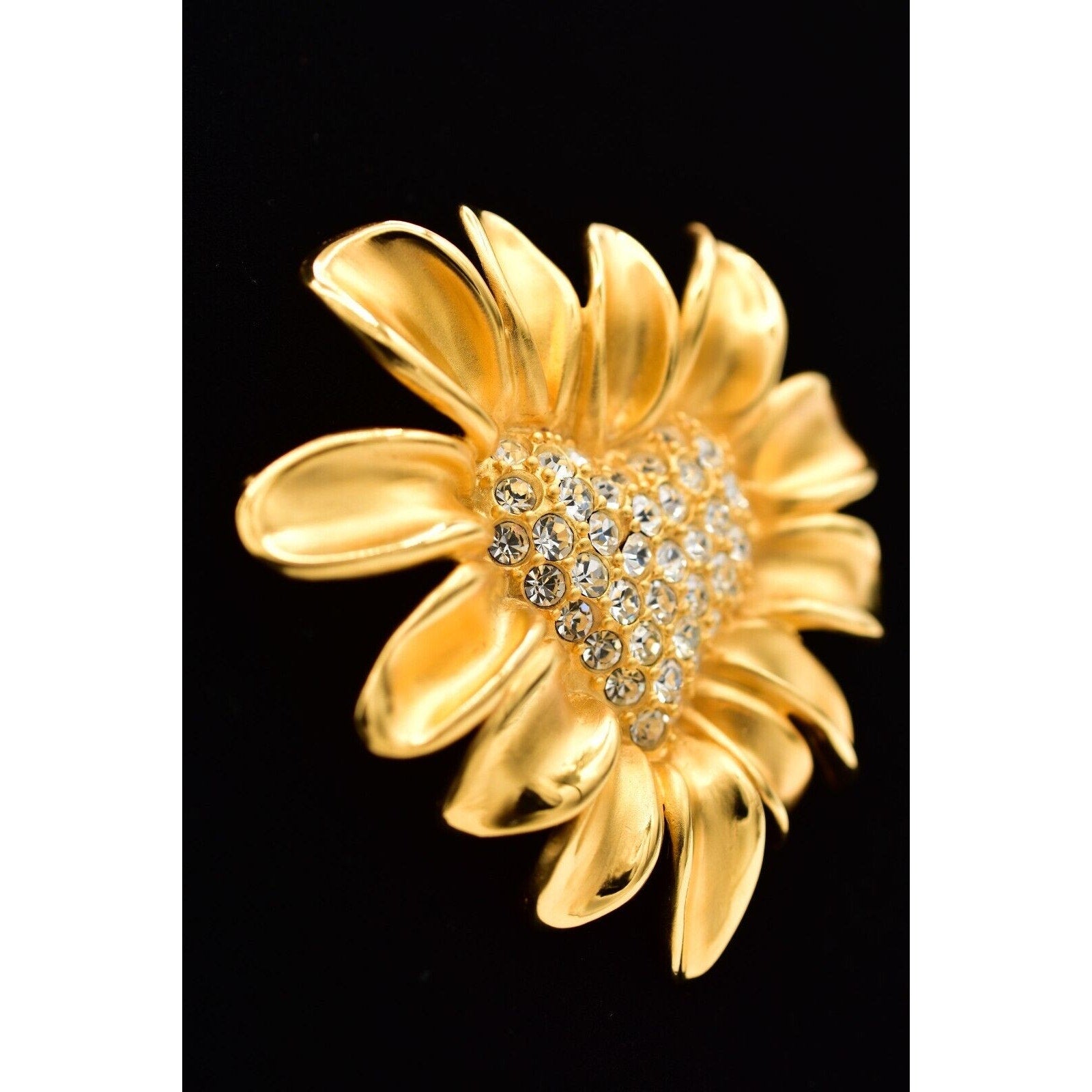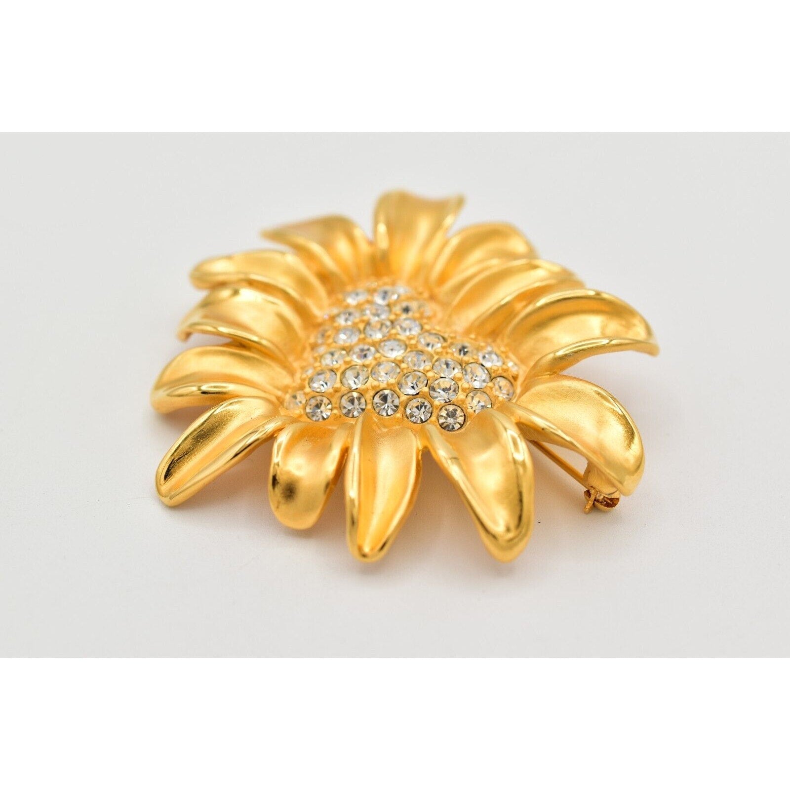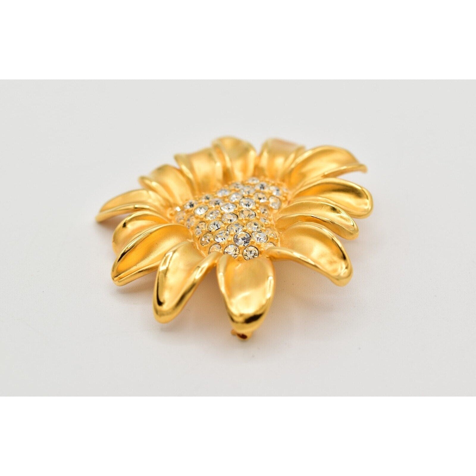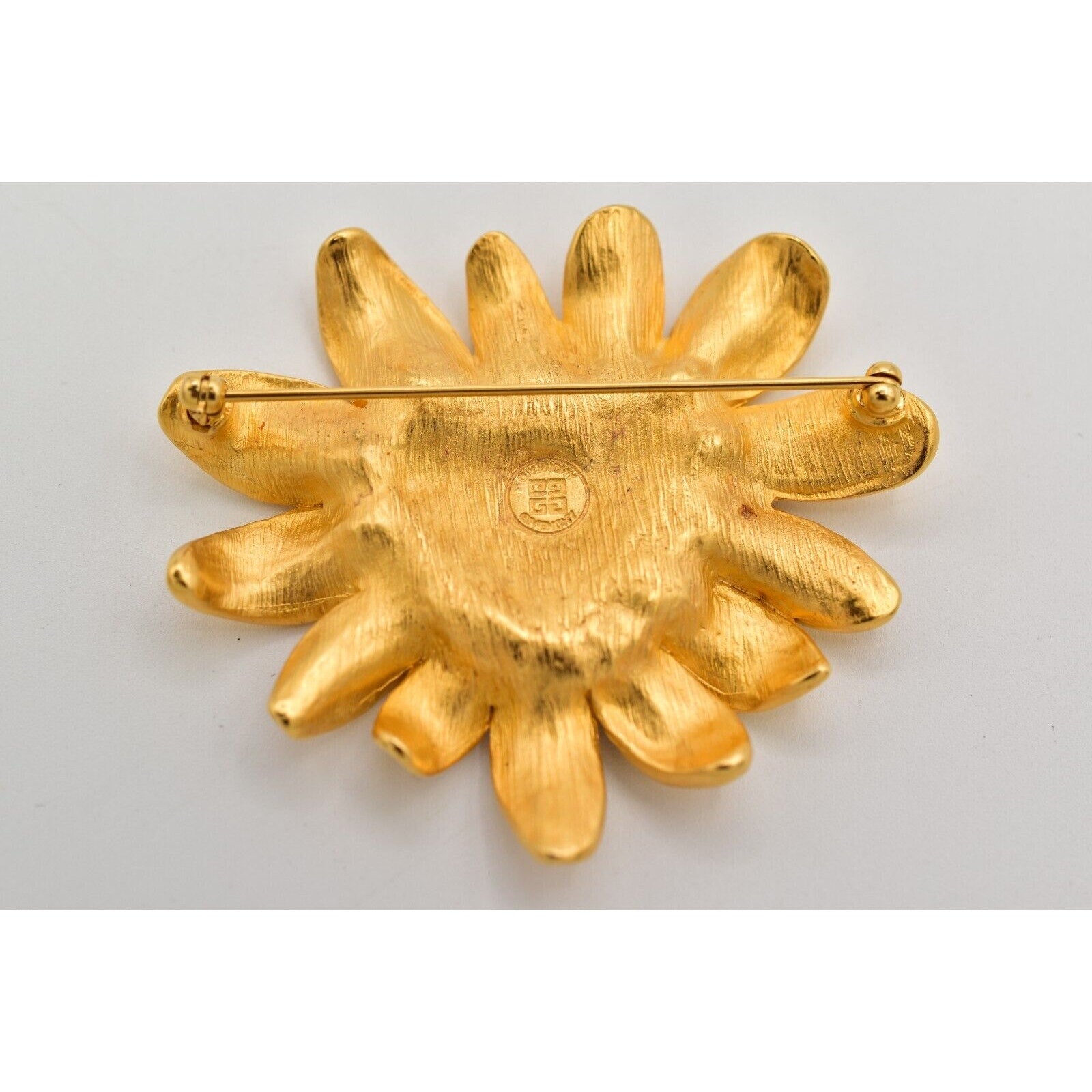 Givenchy floral statement brooch featuring a gleaming gold-tone daisy with a sparkling rhinestone heart center.
