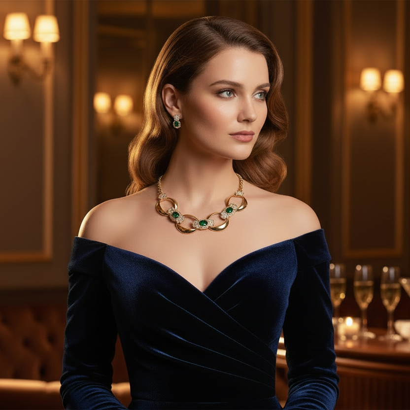 Vintage Givenchy collar featuring white baguette and oval green crystals.