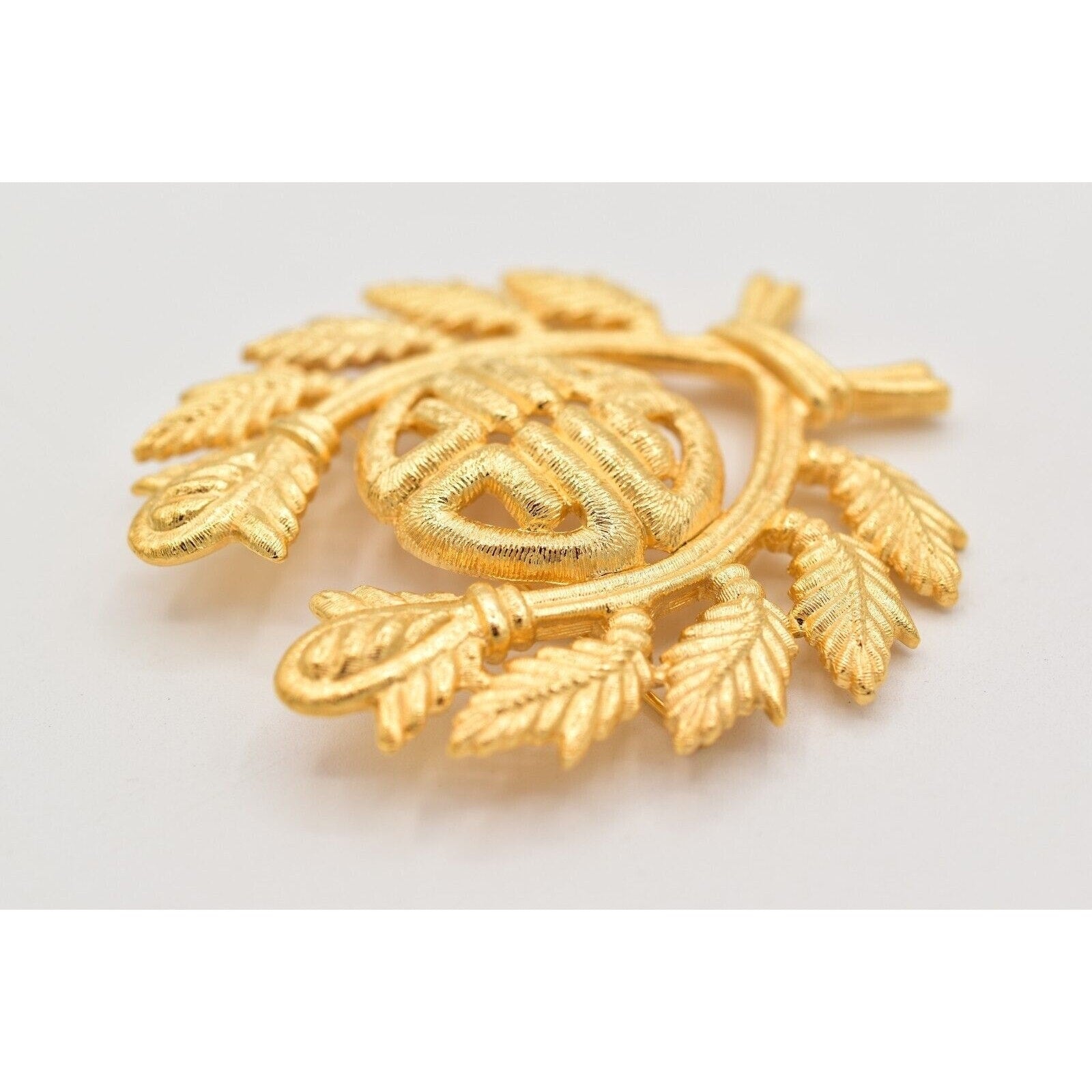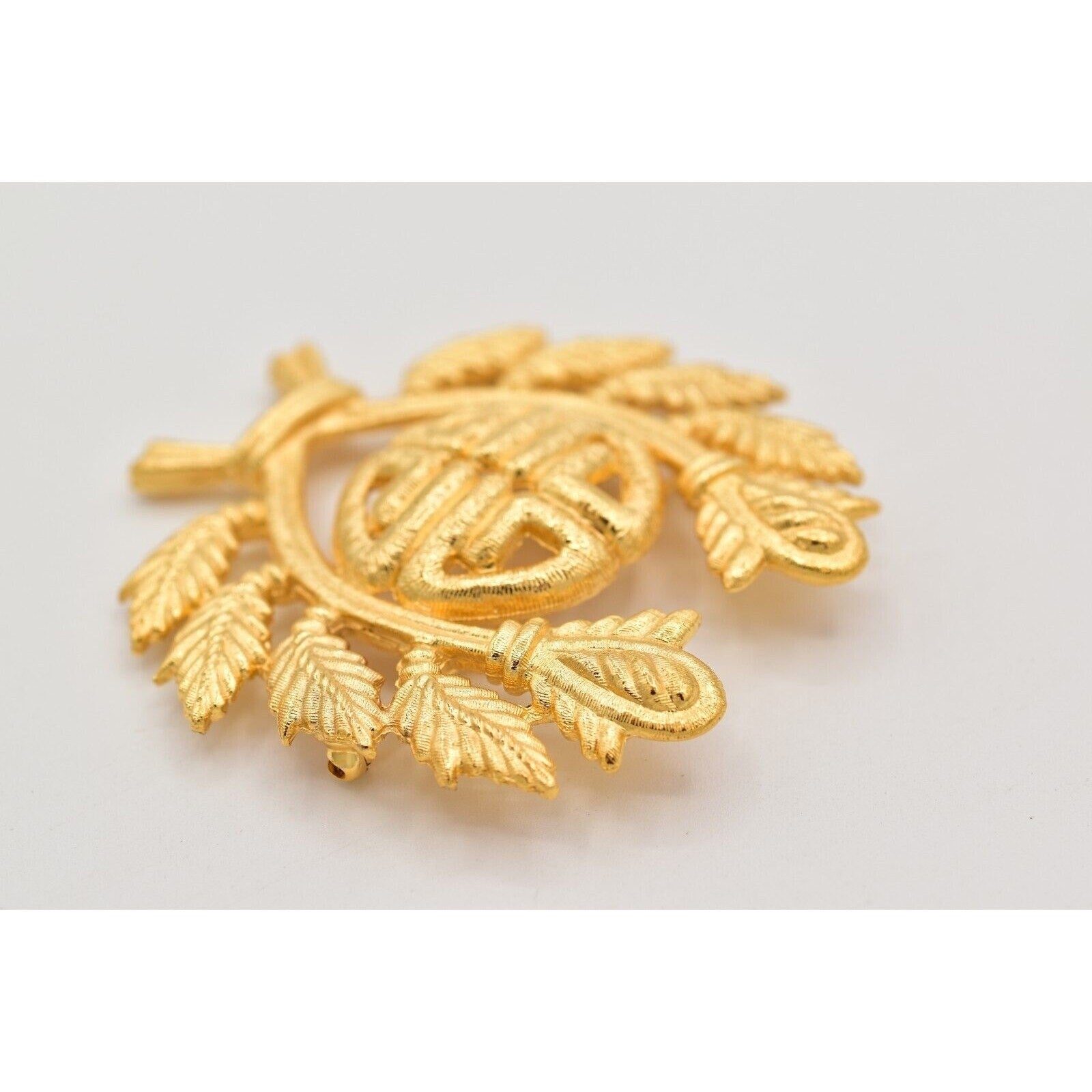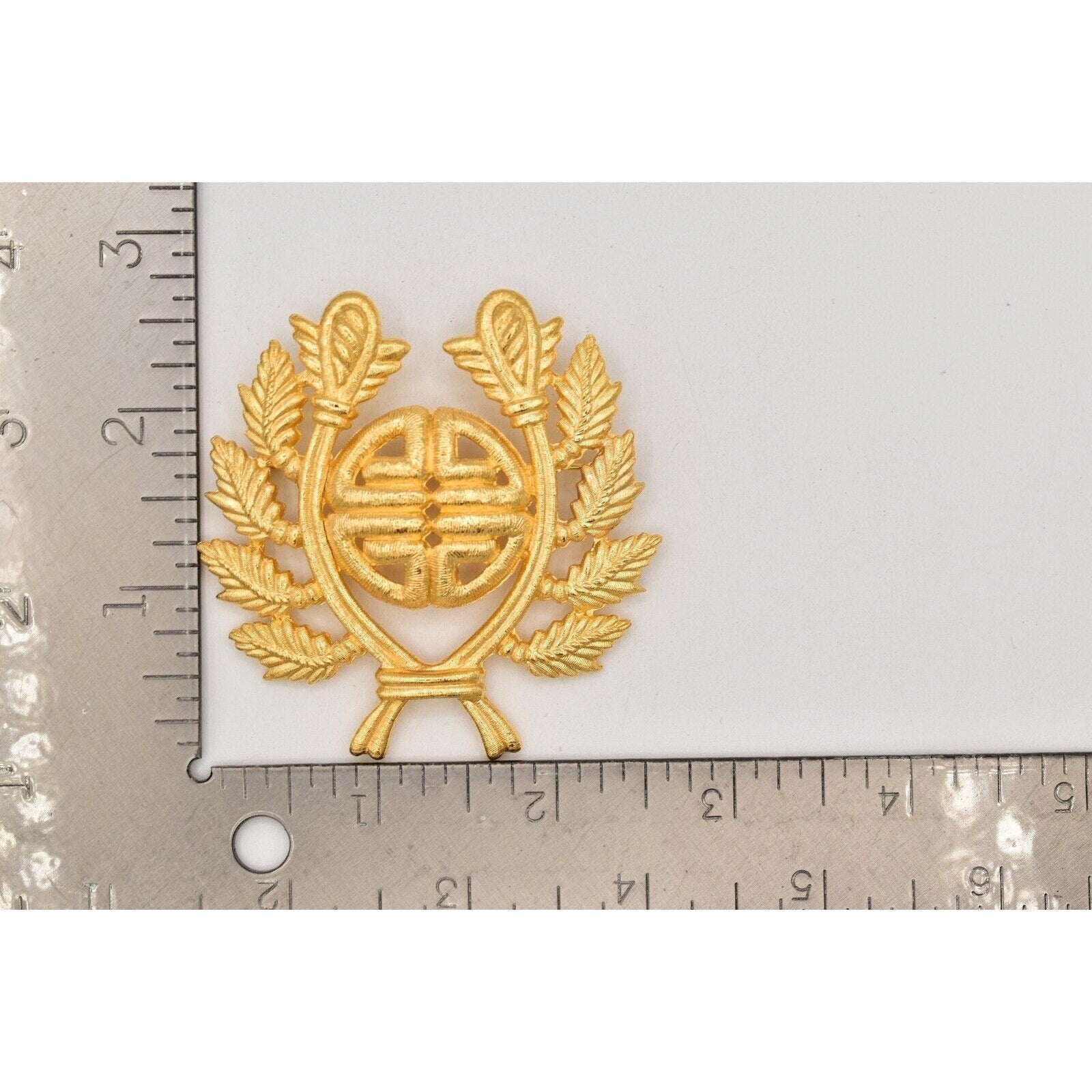 Iconic vintage Givenchy brooch featuring a gold-tone wreath/leaf crest design with a bold center emblem. Elegant, regal, and richly textured—perfect on a blazer lapel, coat, scarf, or handbag for instant designer polish.