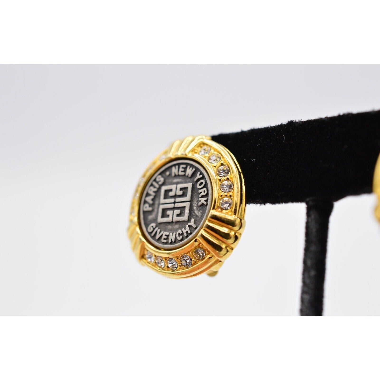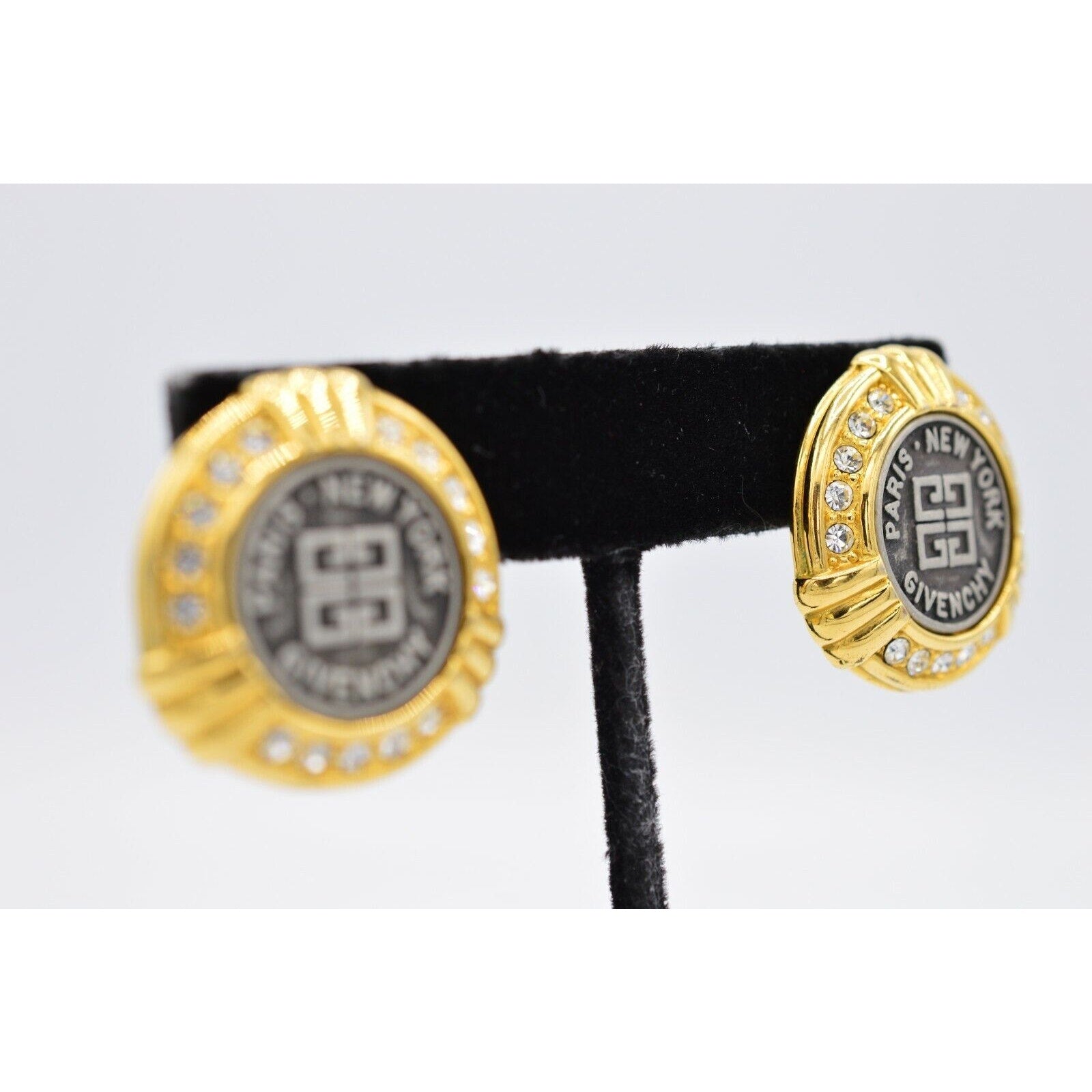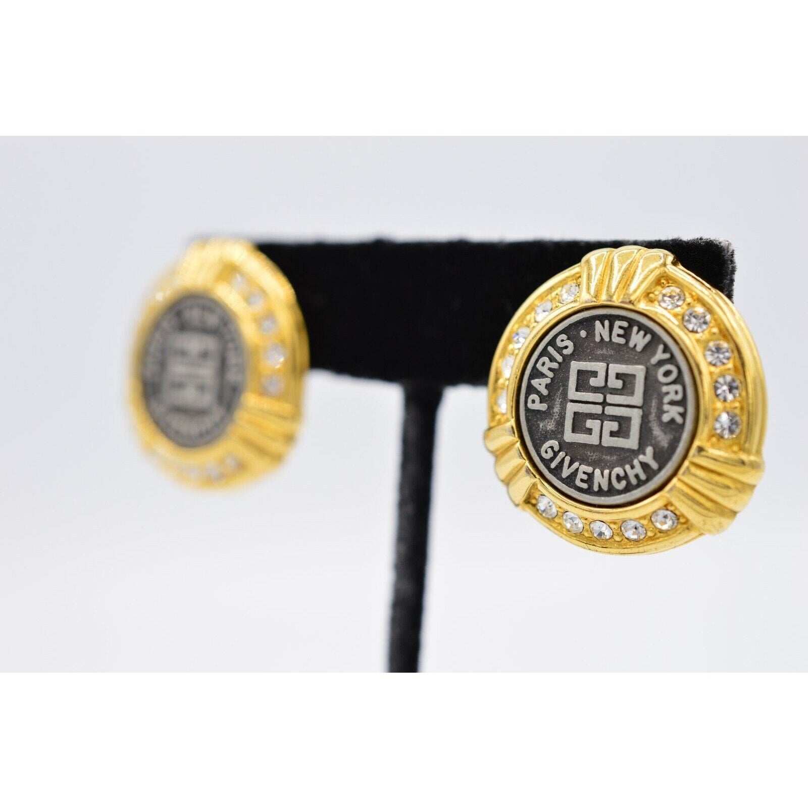 Iconic vintage Givenchy clip earrings featuring bold coin medallion designs with the Paris–New York logo. Finished in rich gold-tone with crystal accents, these statement earrings deliver classic 1980s runway glamour.