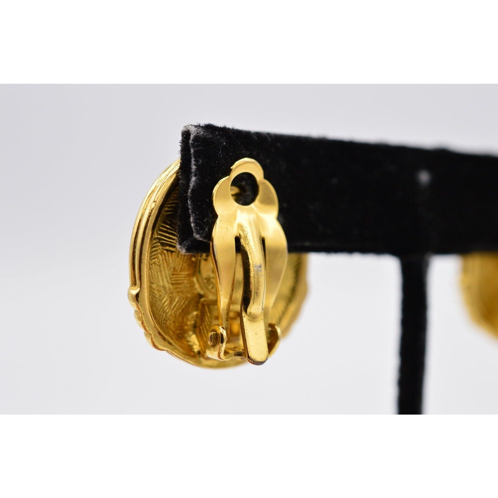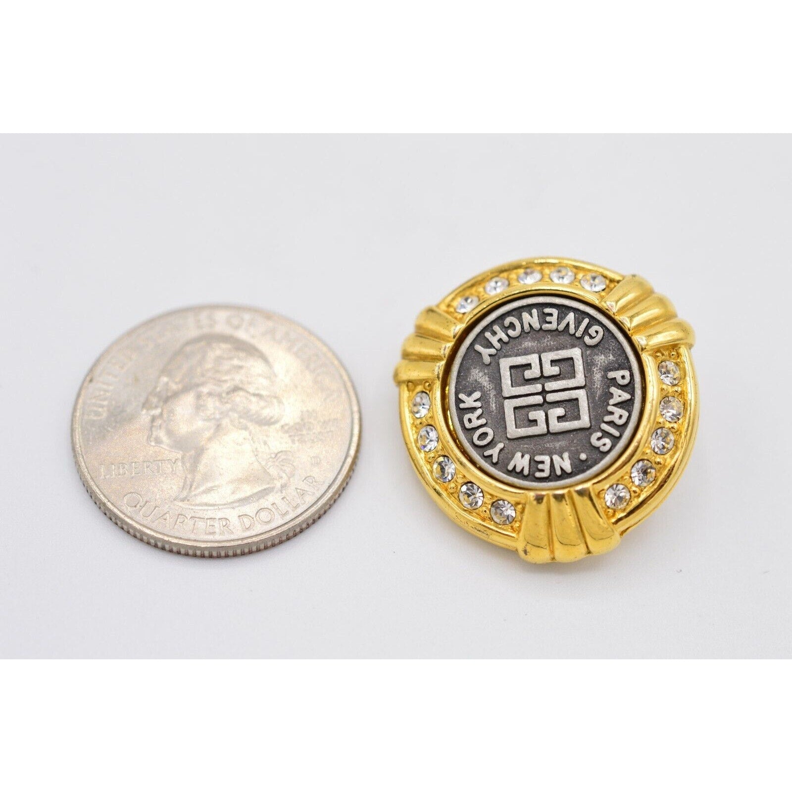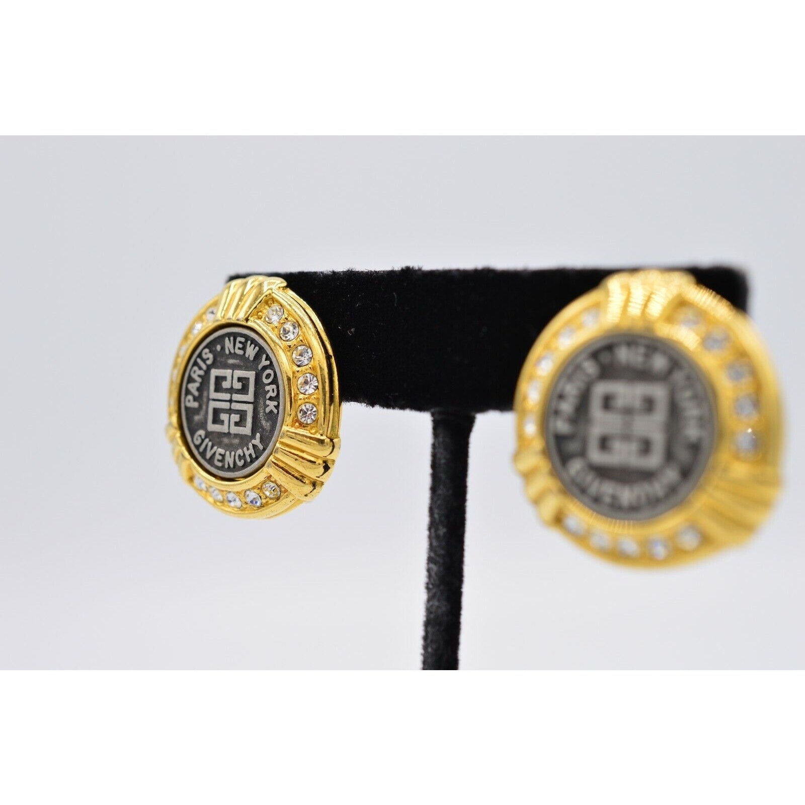 Iconic vintage Givenchy clip earrings featuring bold coin medallion designs with the Paris–New York logo. Finished in rich gold-tone with crystal accents, these statement earrings deliver classic 1980s runway glamour.