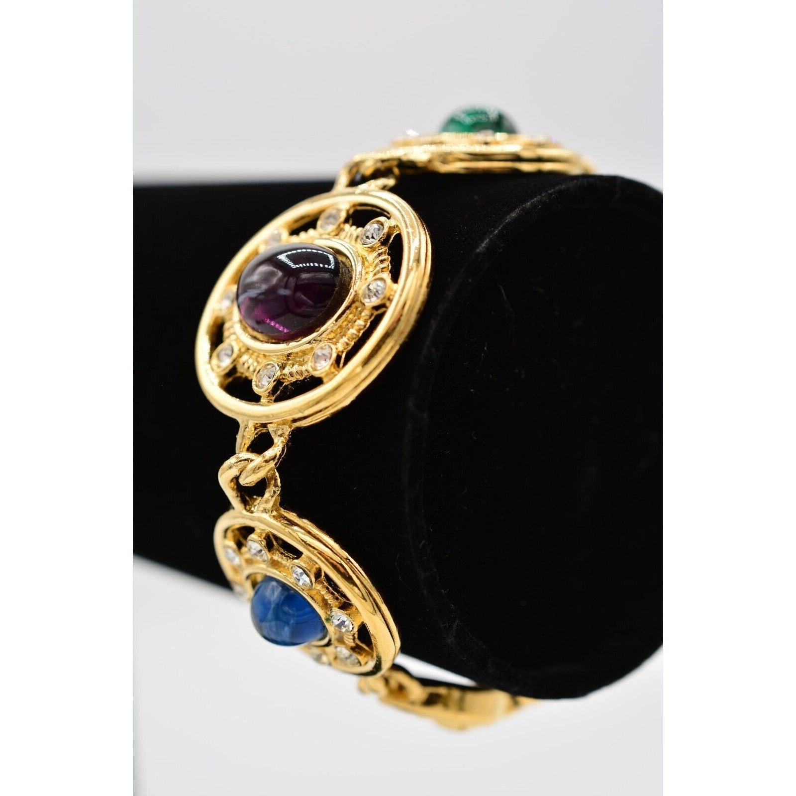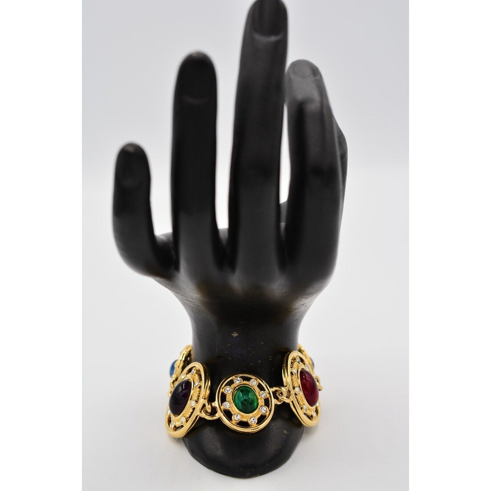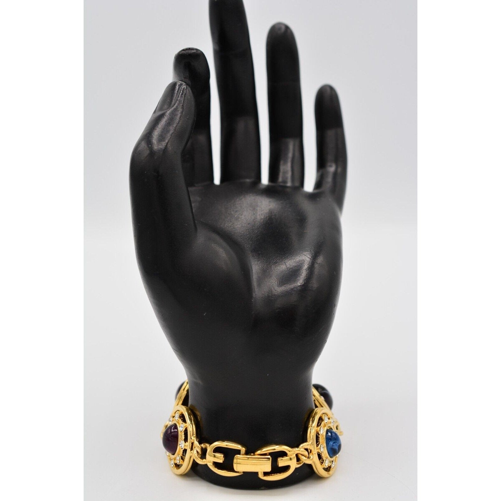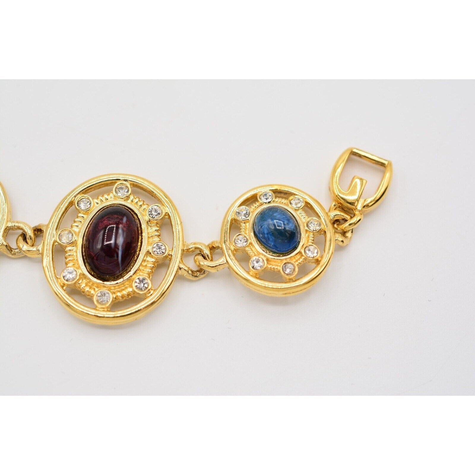 Bold and luxurious vintage Givenchy bracelet featuring rich multicolor cabochon stones framed by sparkling crystal halos. A substantial gold-tone link design with iconic designer presence and timeless elegance.