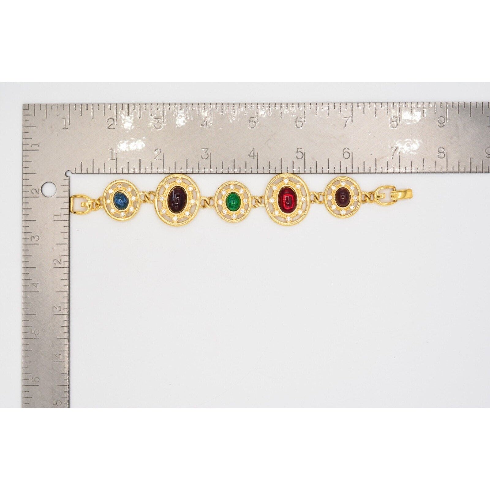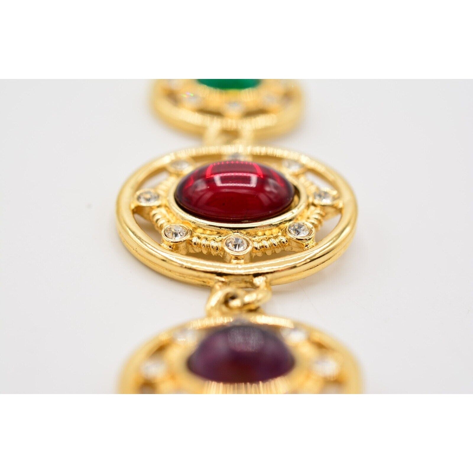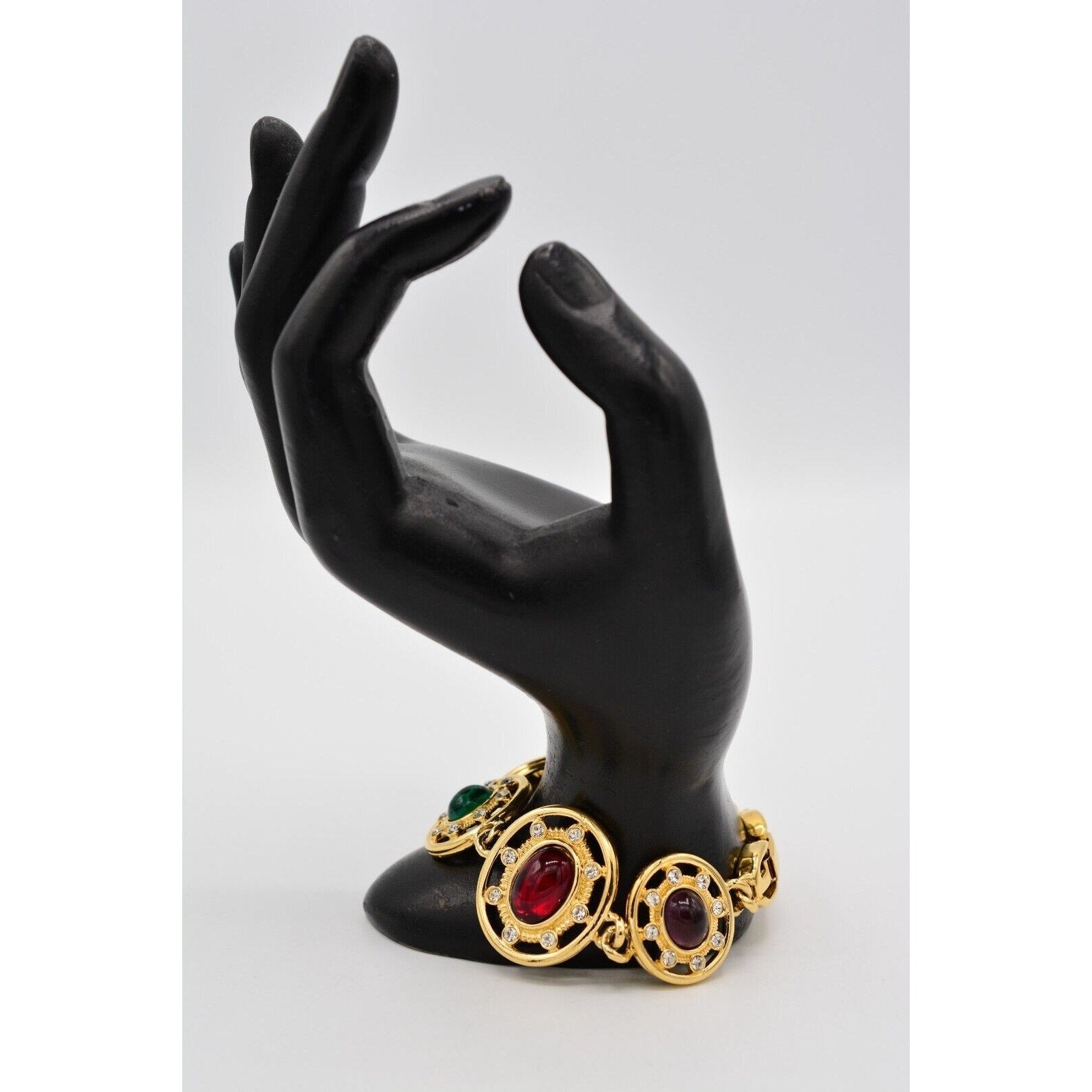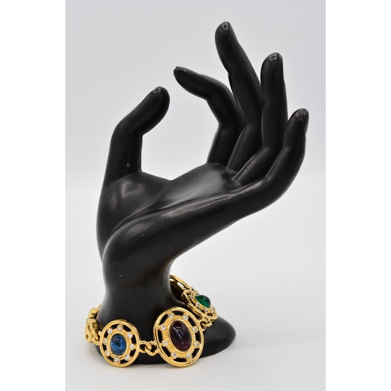 Bold and luxurious vintage Givenchy bracelet featuring rich multicolor cabochon stones framed by sparkling crystal halos. A substantial gold-tone link design with iconic designer presence and timeless elegance.