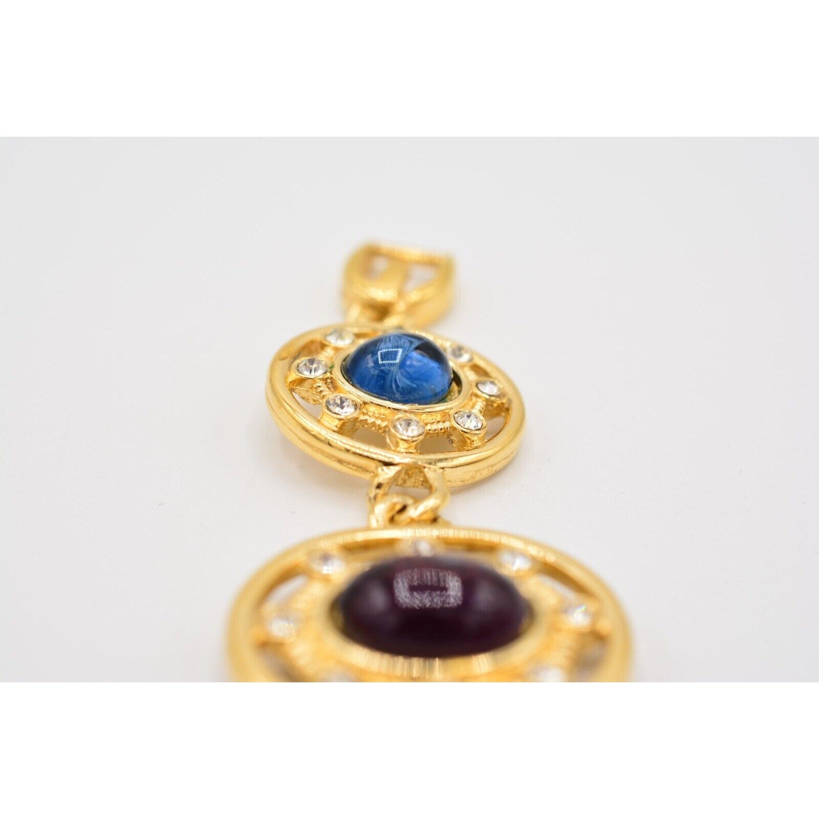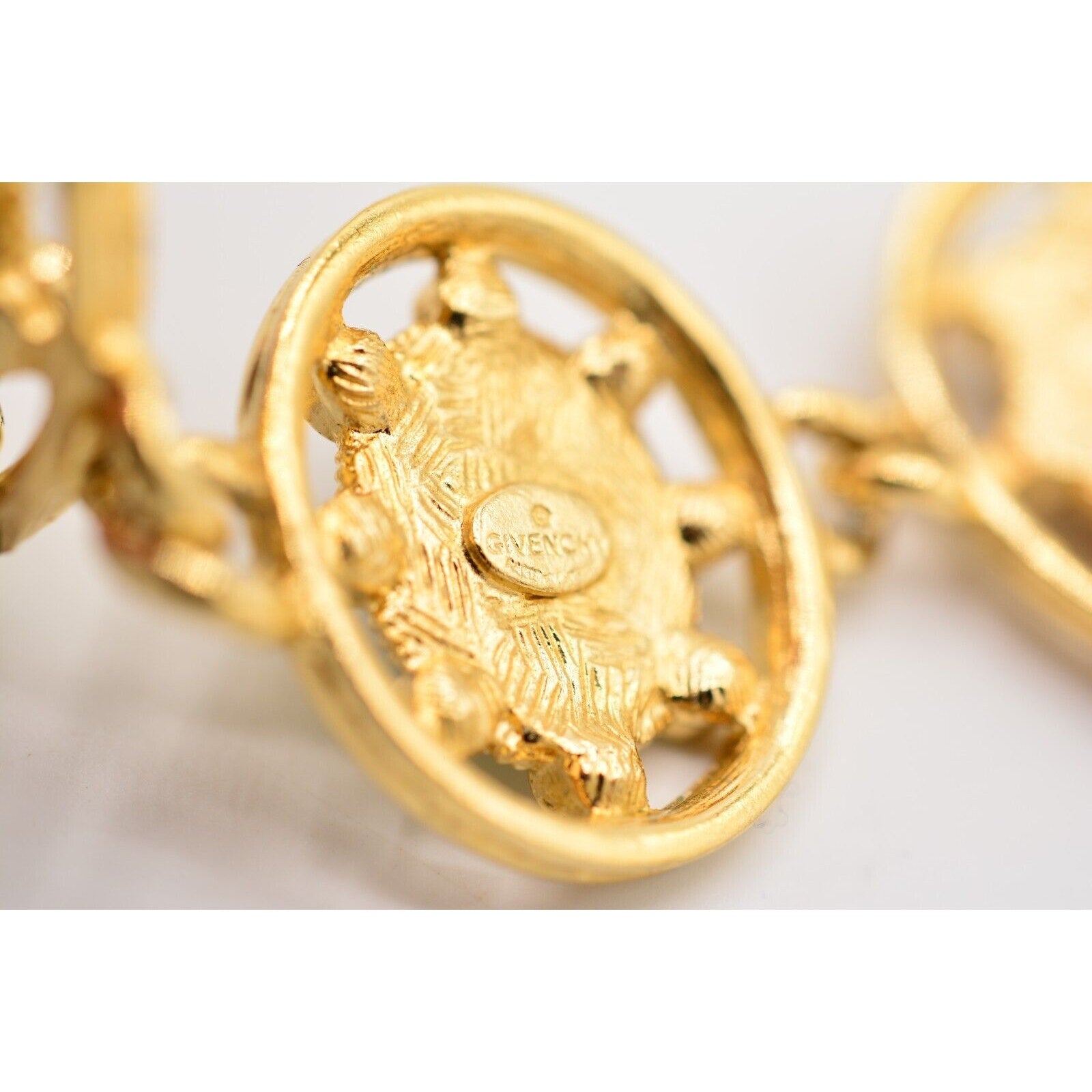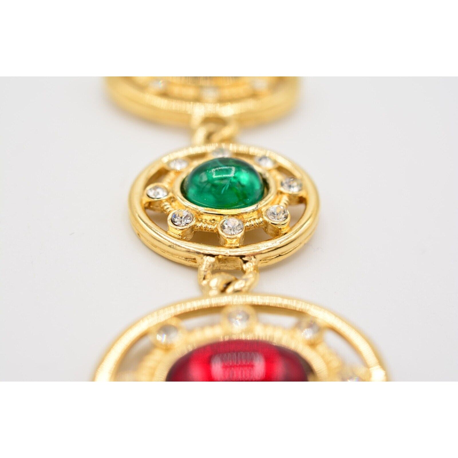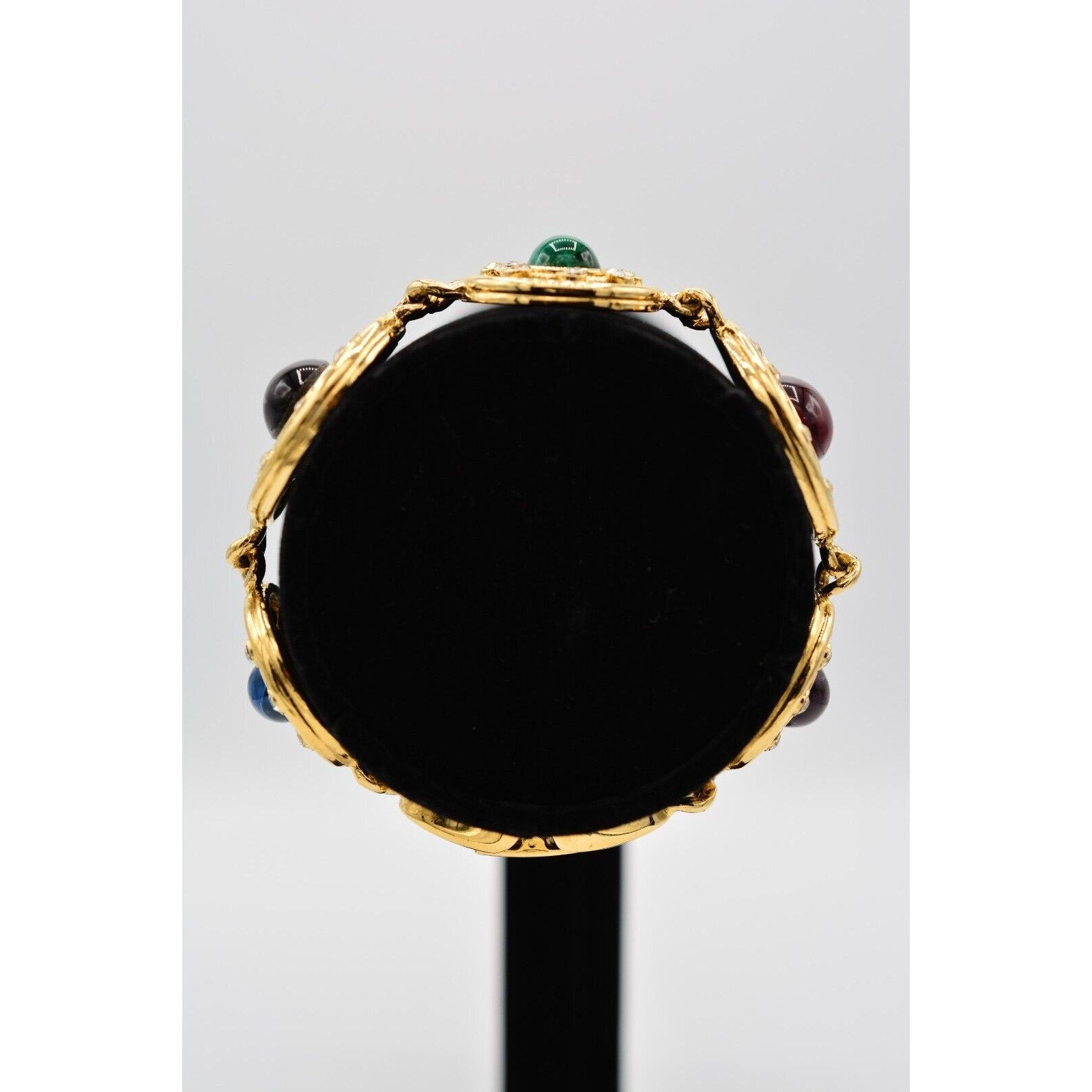 Bold and luxurious vintage Givenchy bracelet featuring rich multicolor cabochon stones framed by sparkling crystal halos. A substantial gold-tone link design with iconic designer presence and timeless elegance.