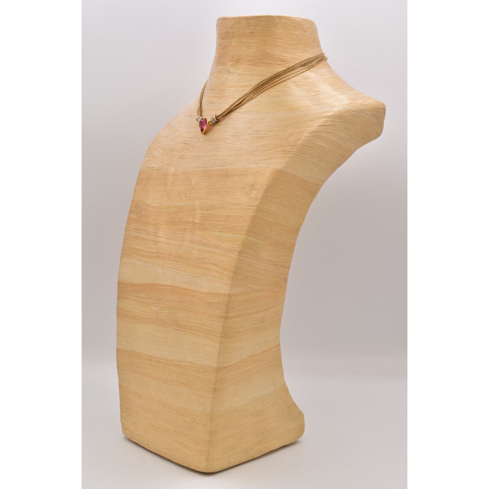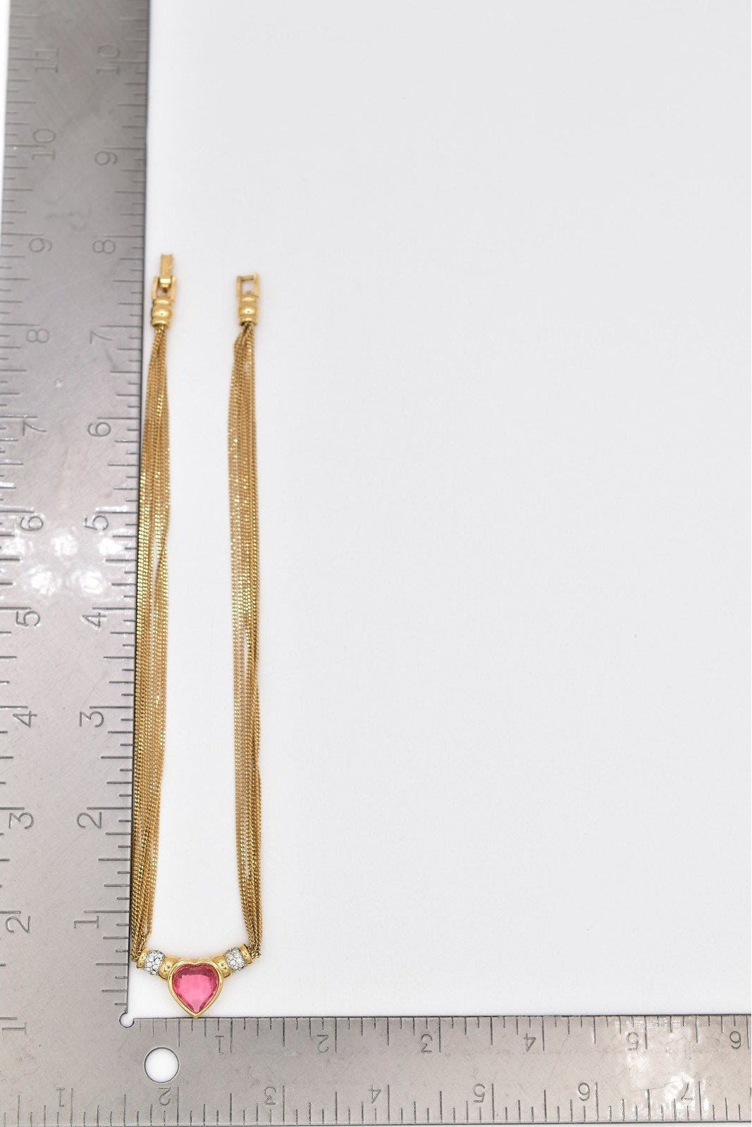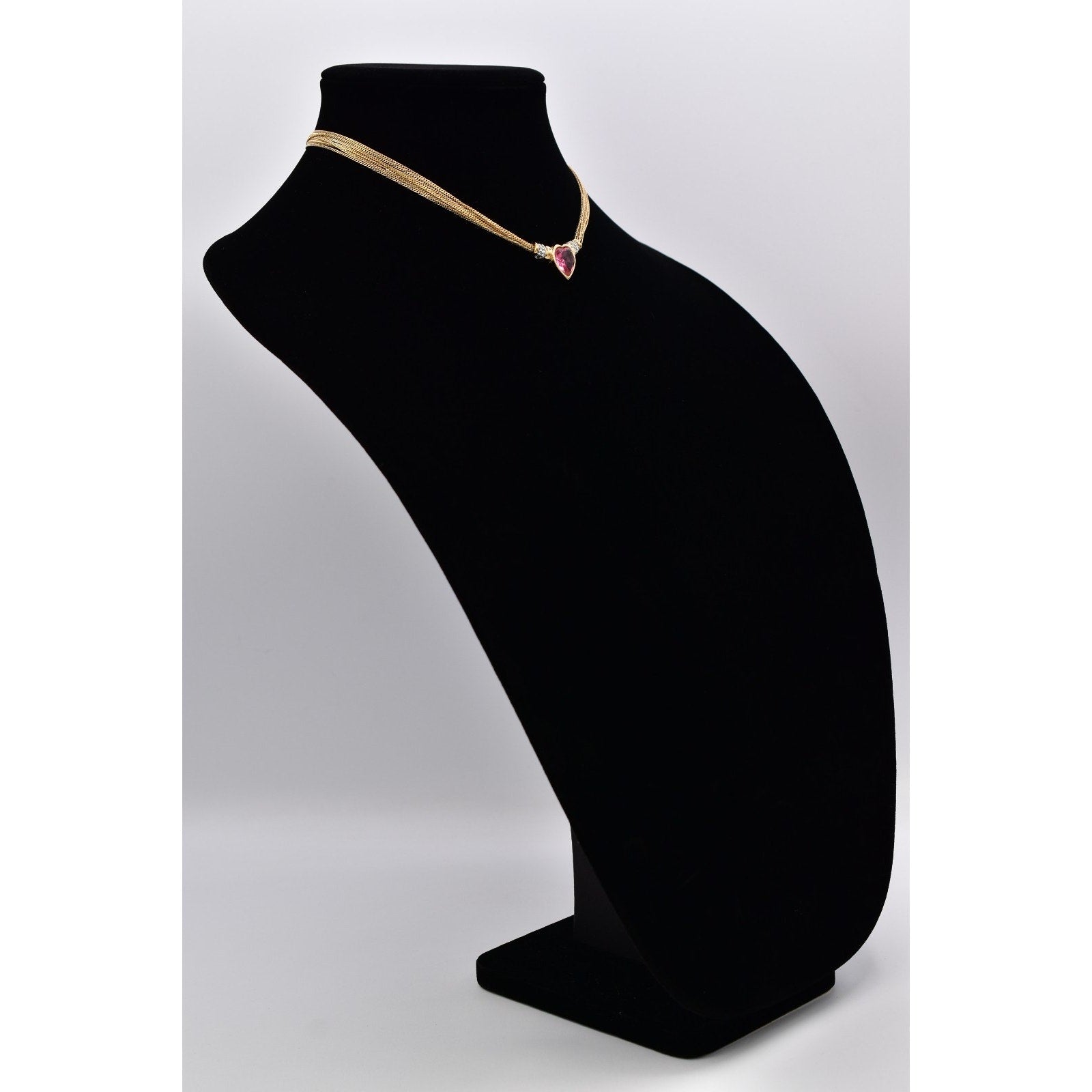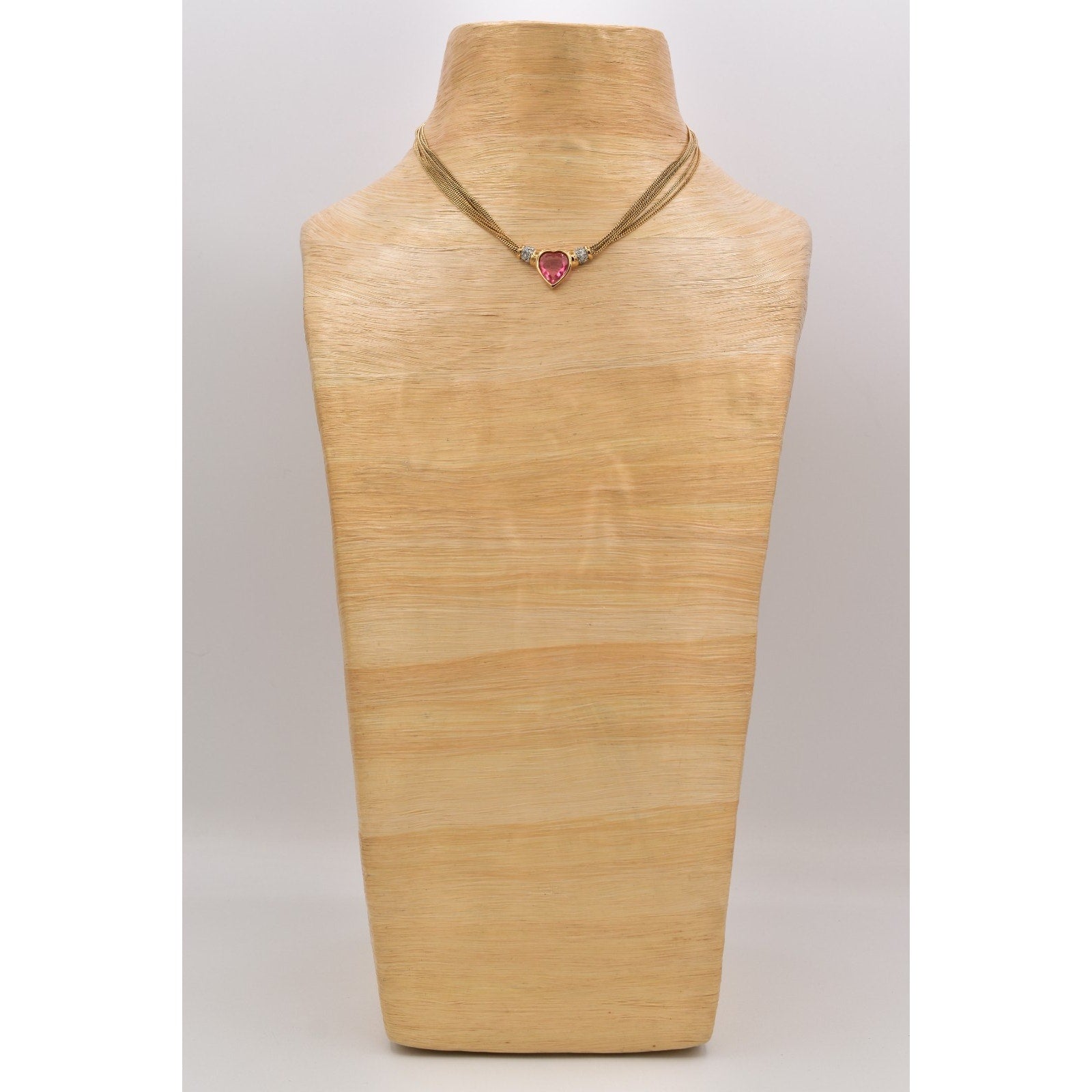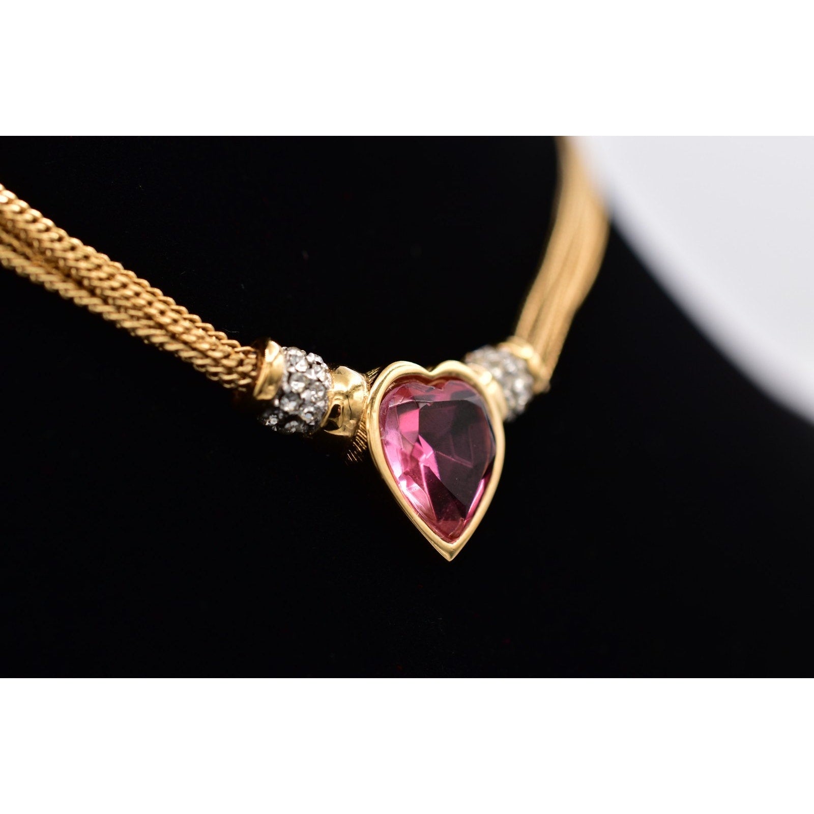 This authentic vintage Givenchy necklace showcases a striking pink heart stone framed in gold tone metal with shimmering rhinestone accents. The heart centerpiece is beautifully balanced by a sleek, multi-strand mesh chain that sits gracefully along the neckline. A classic designer piece perfect for collectors, gifting, or adding refined glamour to any look.
