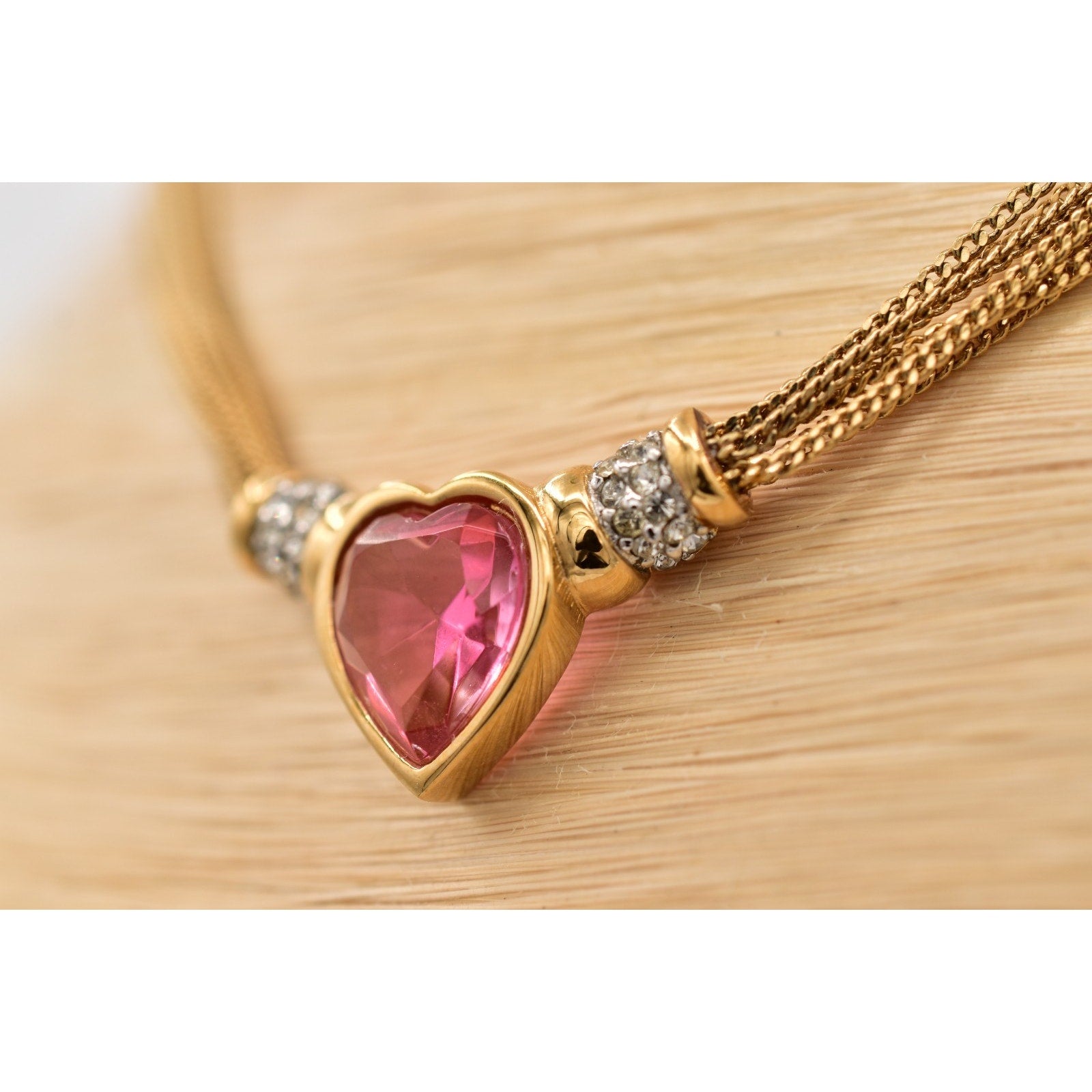A romantic vintage Givenchy necklace featuring a faceted pink heart centerpiece set in gold tone metal, accented with sparkling rhinestones and finished with a multi-strand mesh chain.