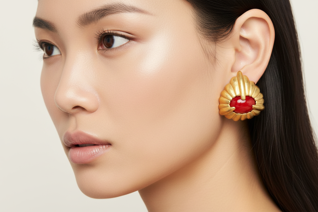 Vintage Givenchy earrings with red cabochon center in matte gold setting.