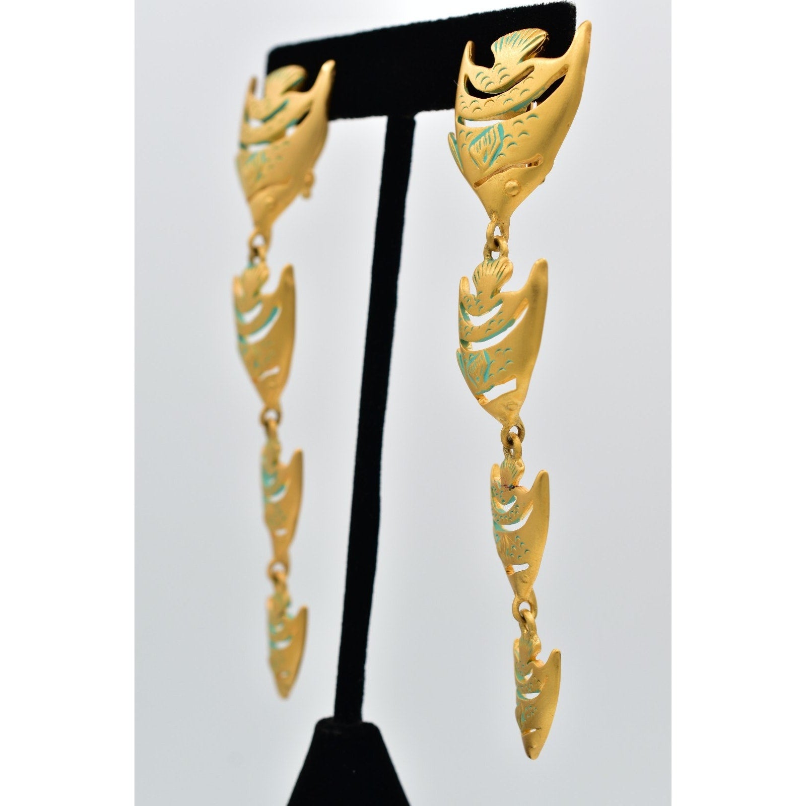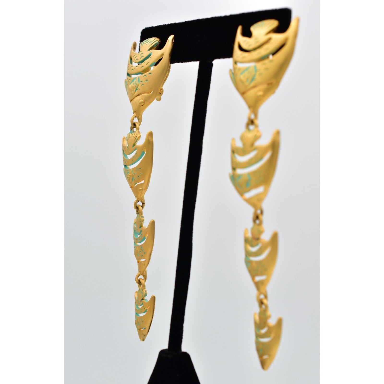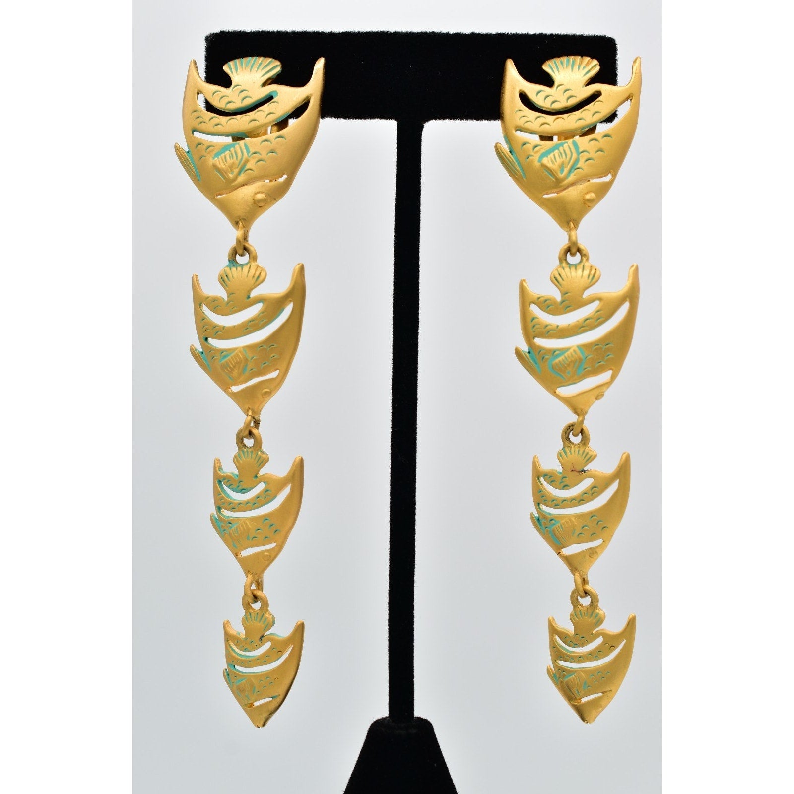 Bold and sculptural vintage clip-on earrings featuring a cascading fish motif in brushed gold-tone metal with turquoise enamel accents. A striking 1980s statement design with fabulous movement and iconic designer flair.