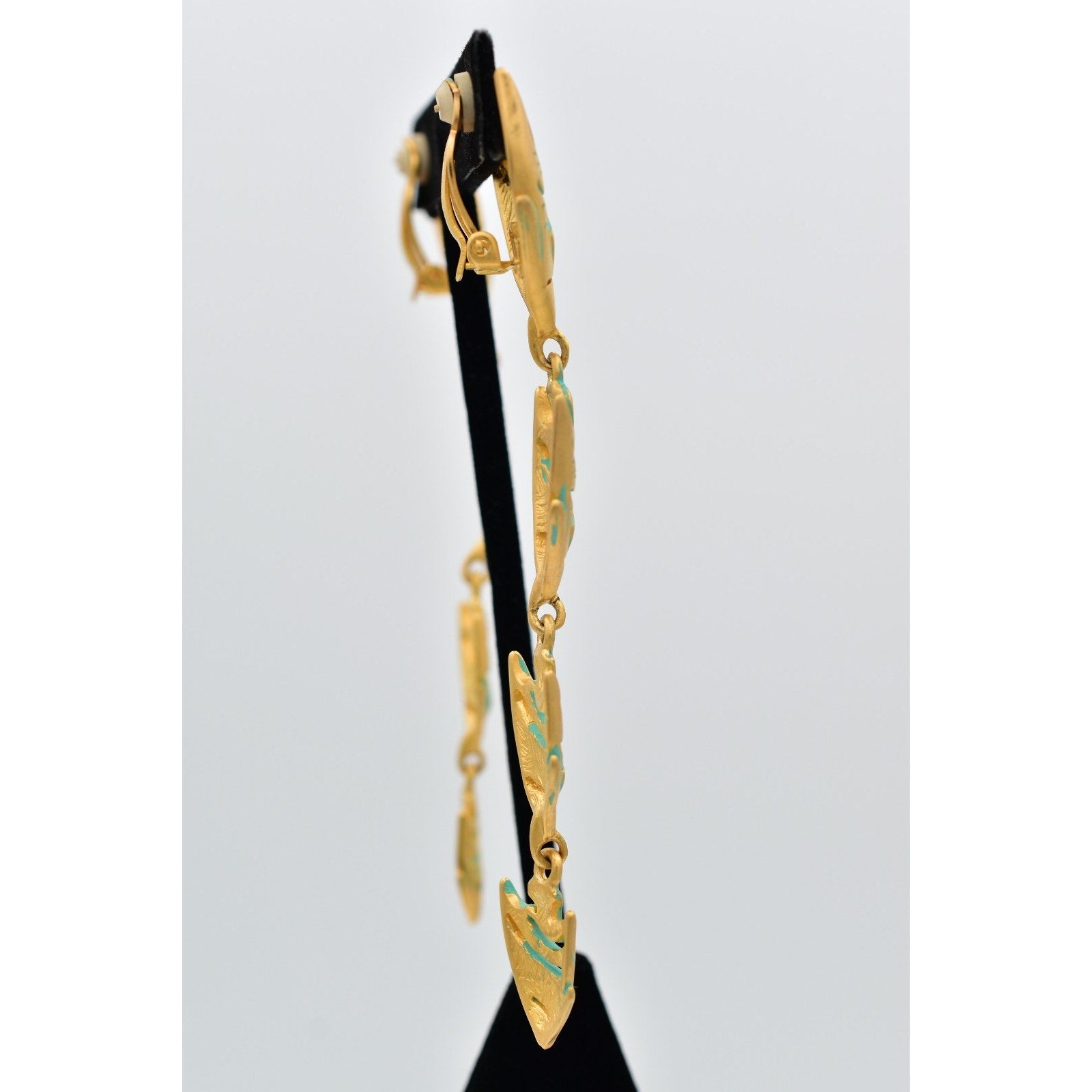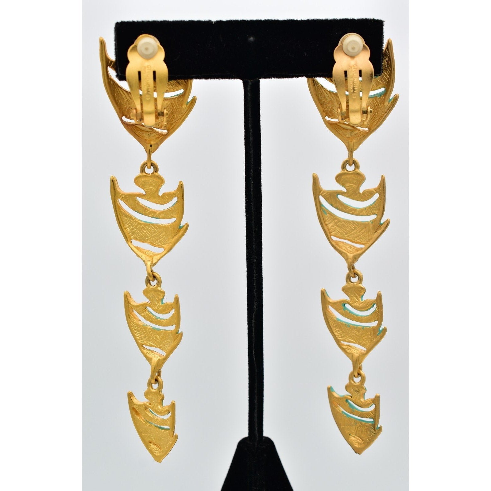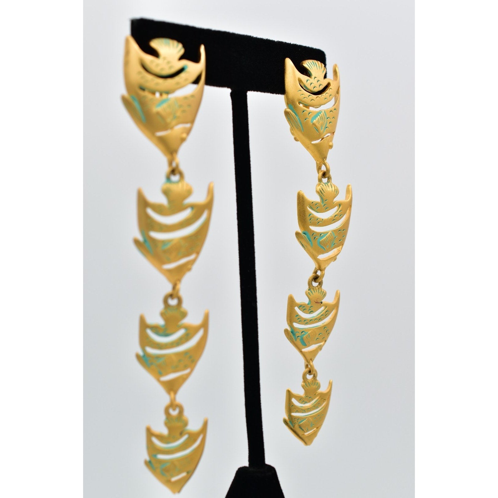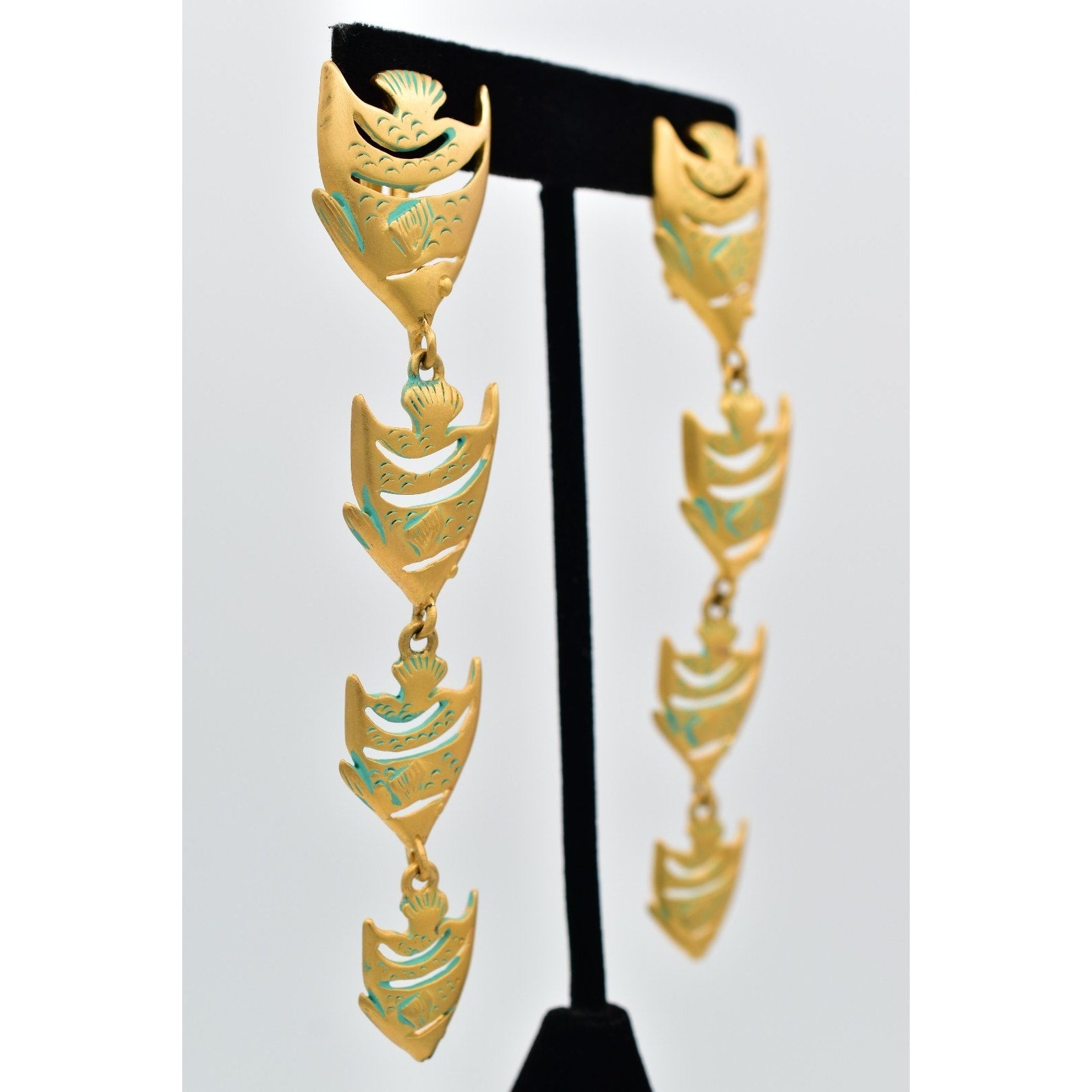 Bold and sculptural vintage clip-on earrings featuring a cascading fish motif in brushed gold-tone metal with turquoise enamel accents. A striking 1980s statement design with fabulous movement and iconic designer flair.
