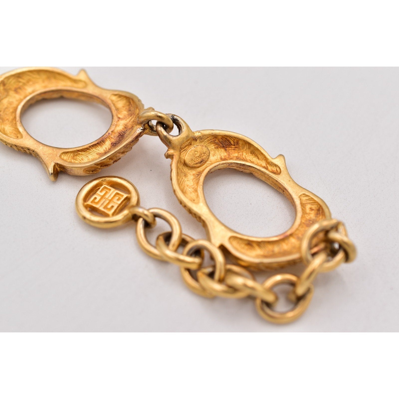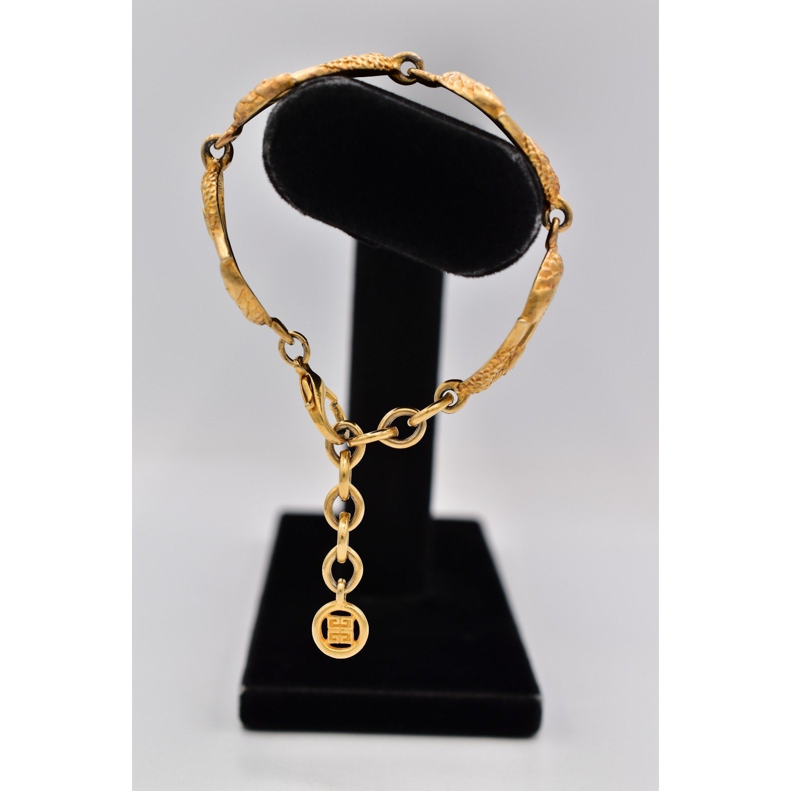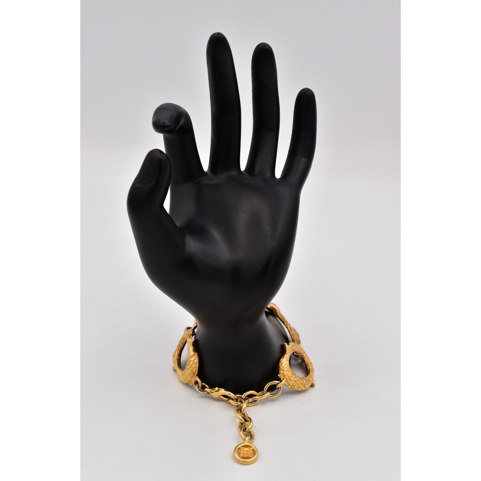 Whimsical vintage Givenchy gold-tone bracelet featuring textured fish links and a signature logo medallion—rare, playful, and very collectible.
