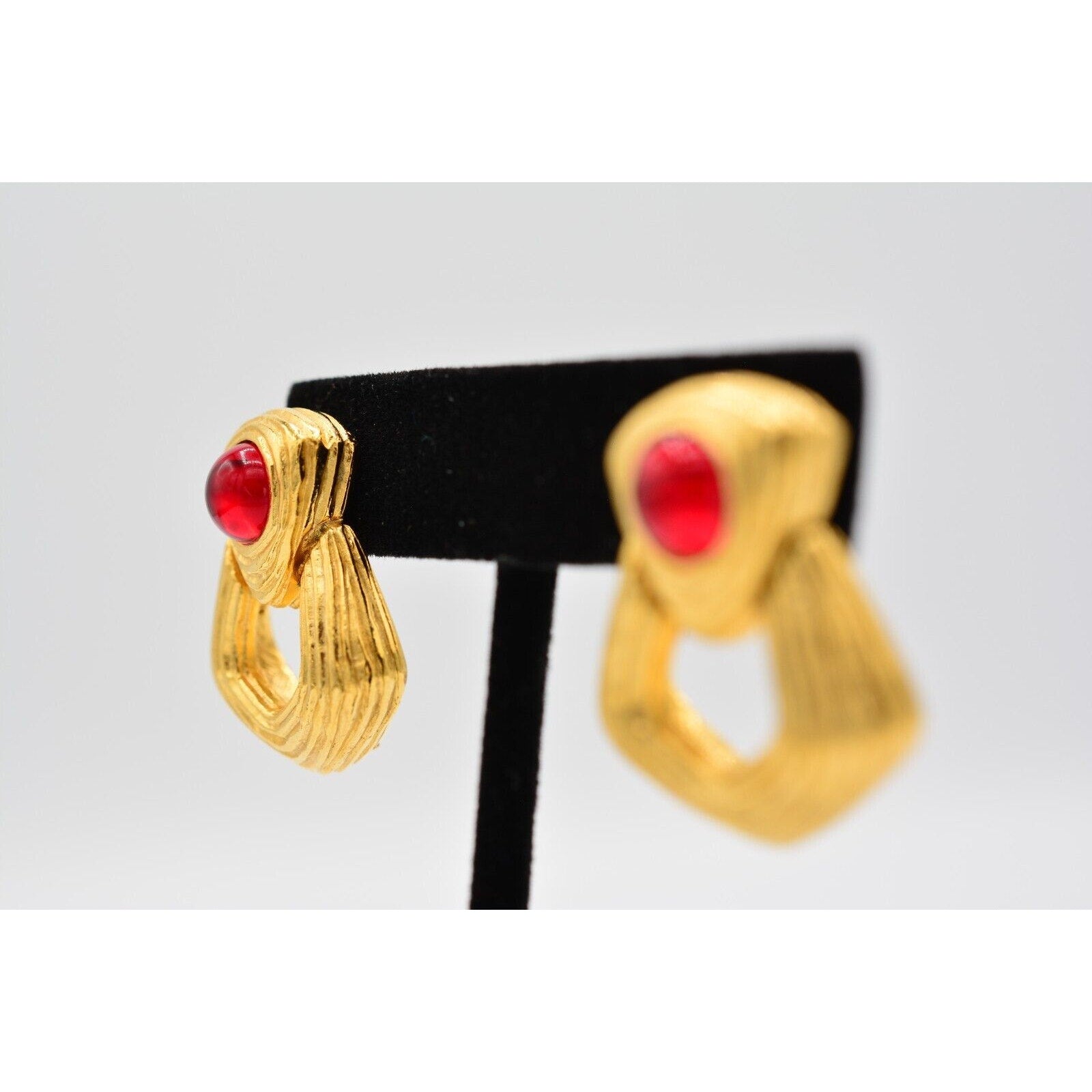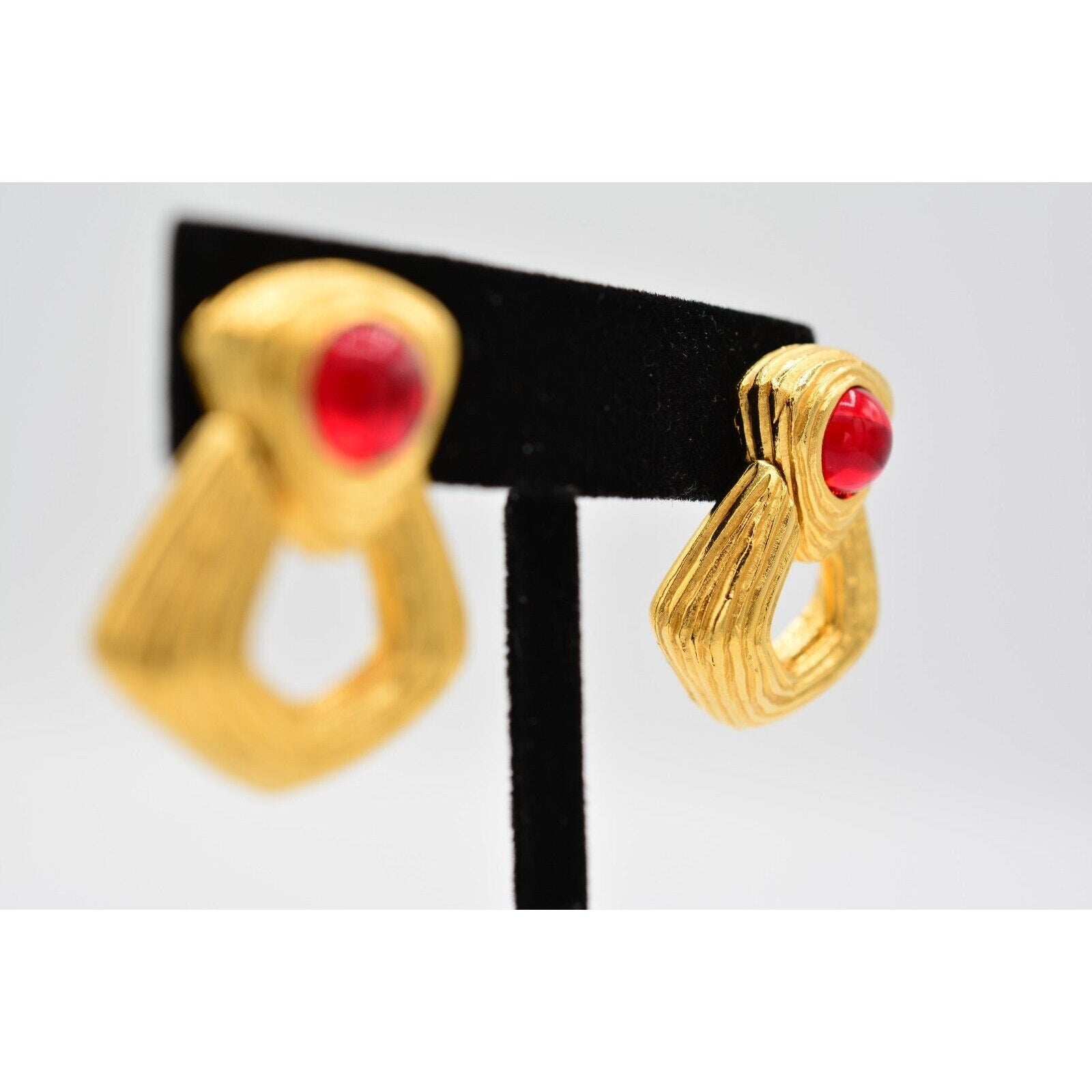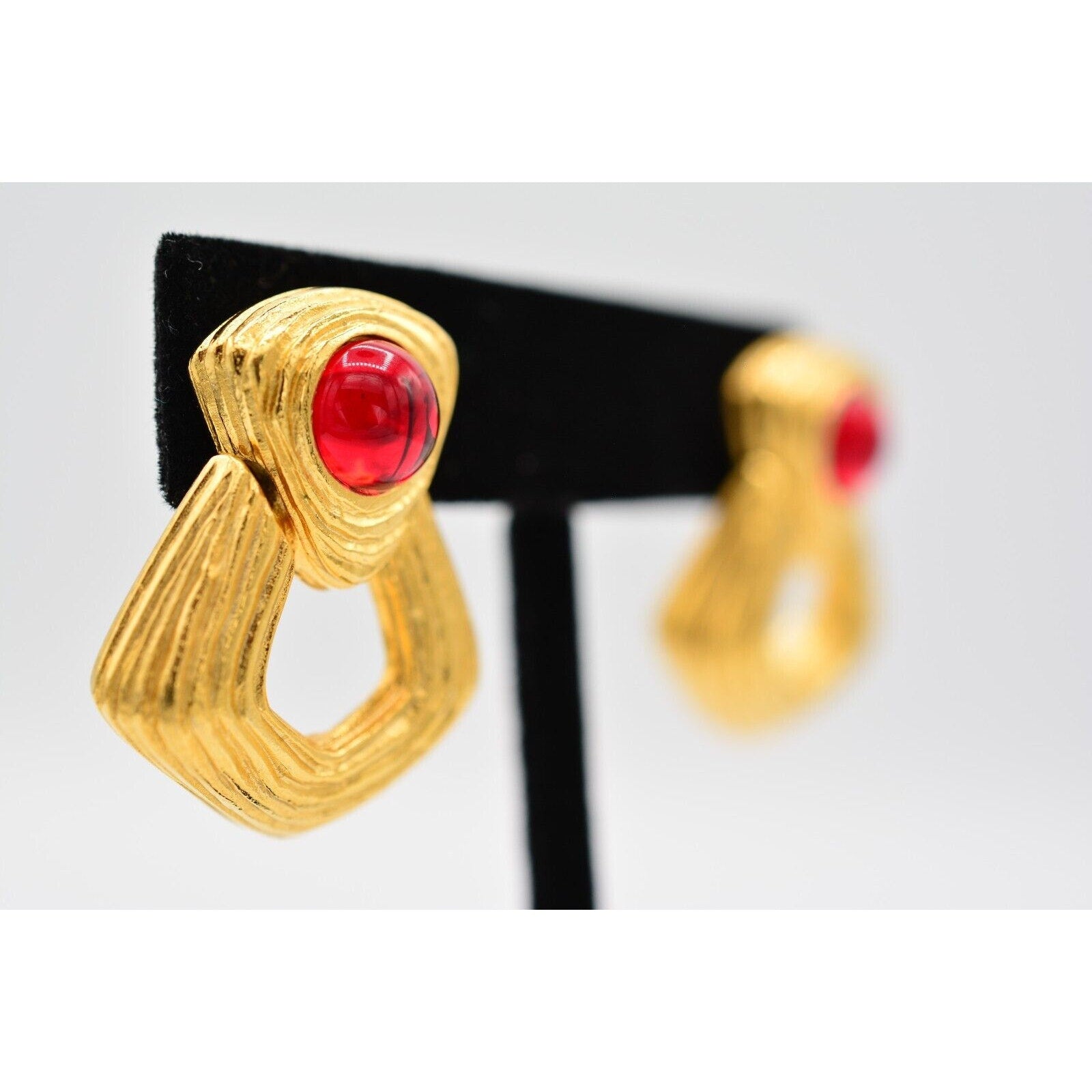 • Design: Sculptural geometric drop earrings with textured gold-tone finish and bold red center stones