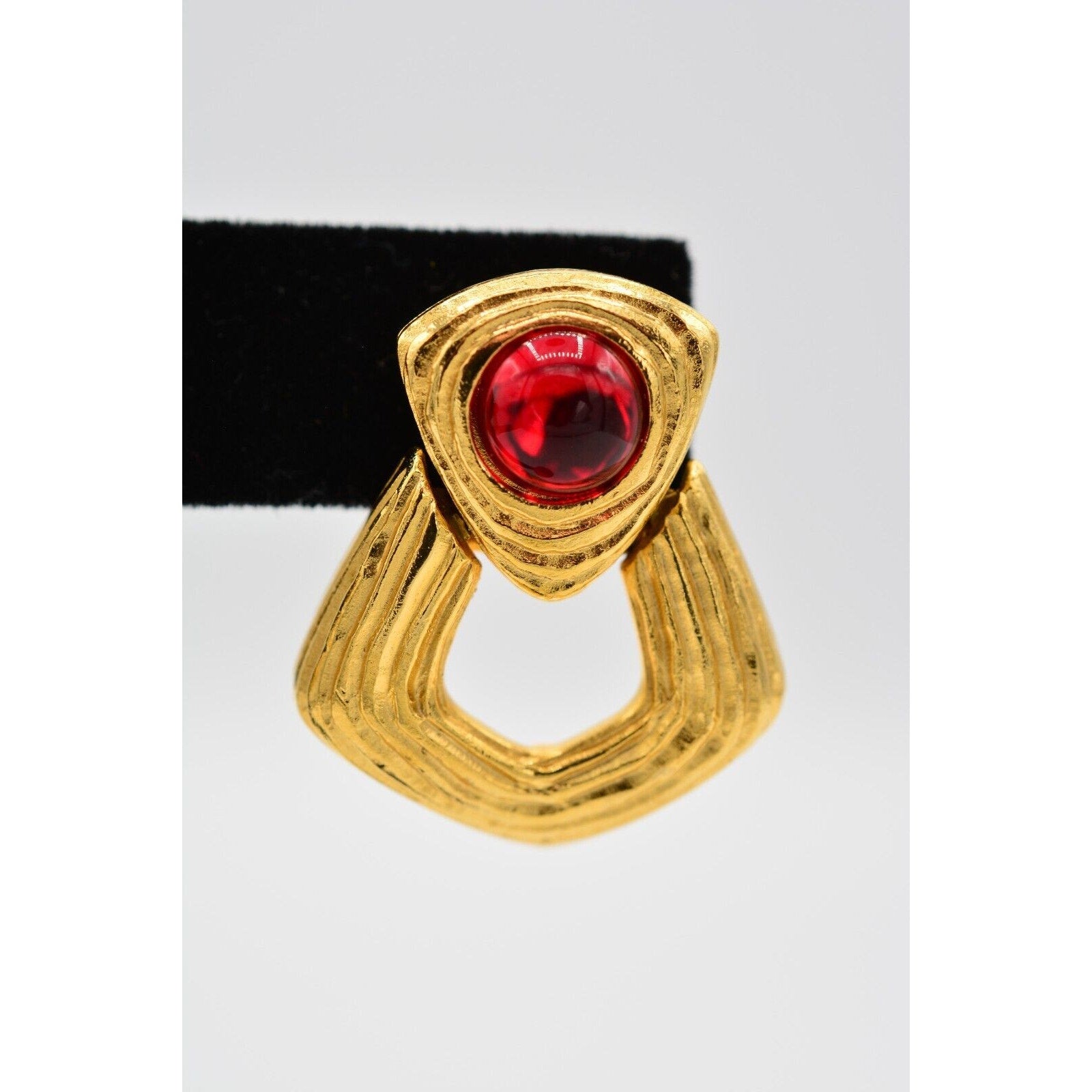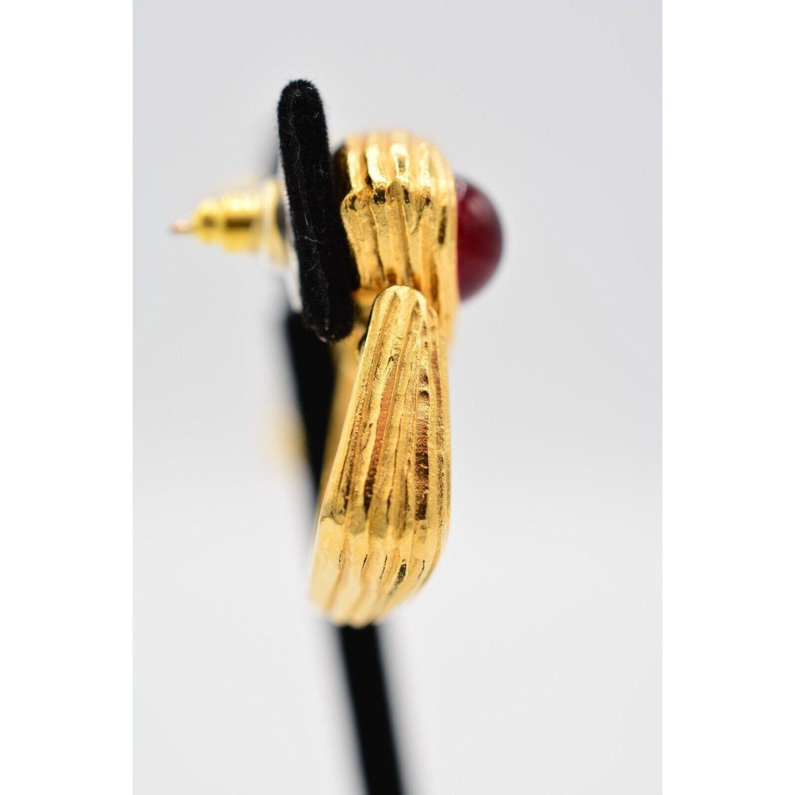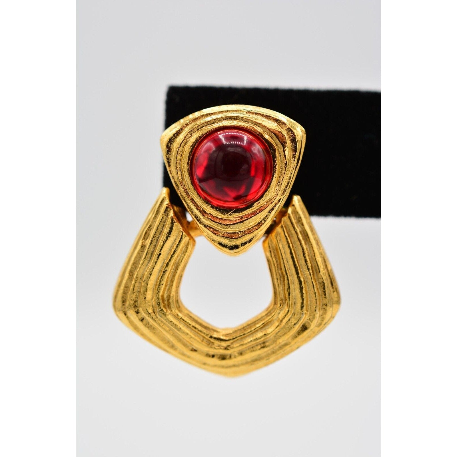 • Design: Sculptural geometric drop earrings with textured gold-tone finish and bold red center stones