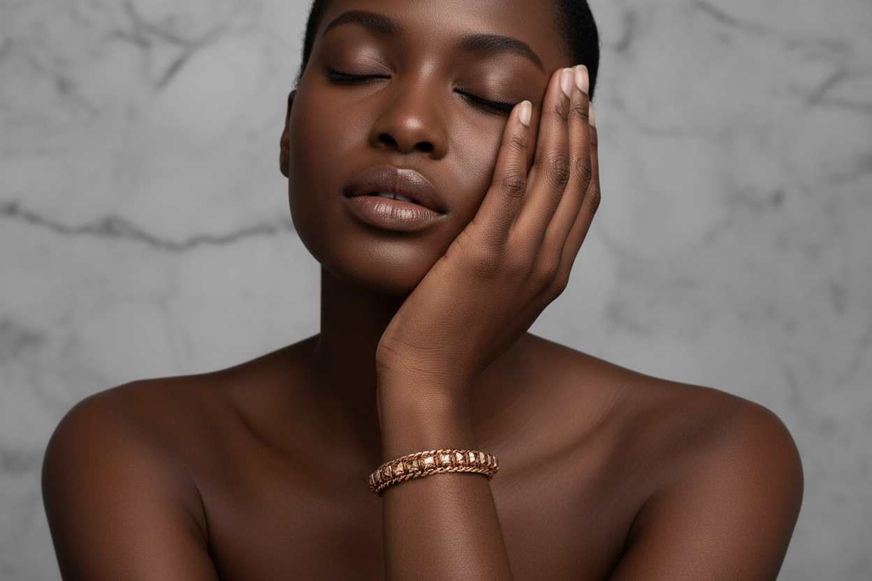 Chic and modern Henri Bendel bracelet featuring sparkling champagne-tone crystals set in a rose gold chain design. A polished and timeless Bendel statement piece with a luxurious finish.