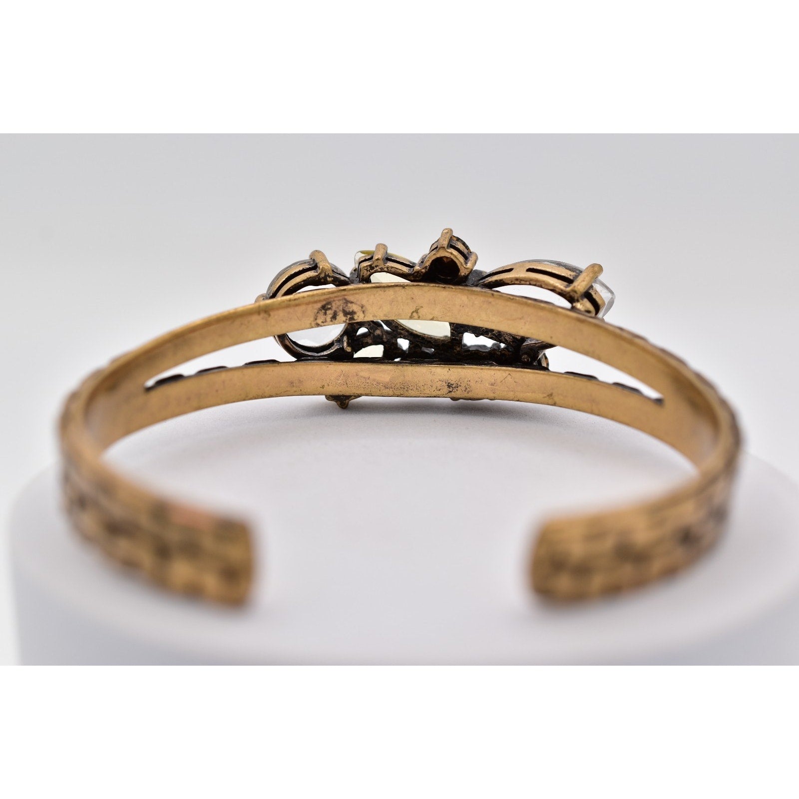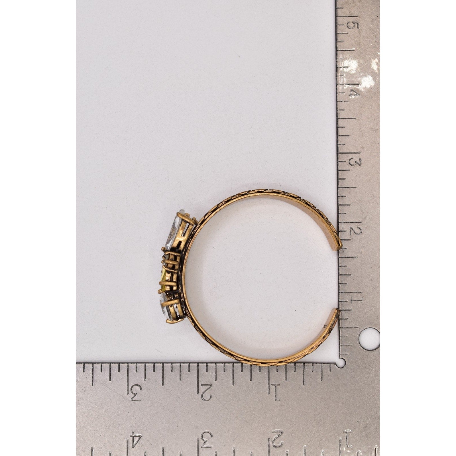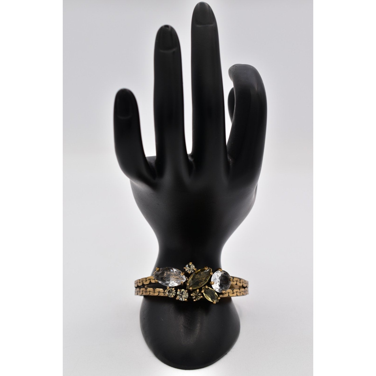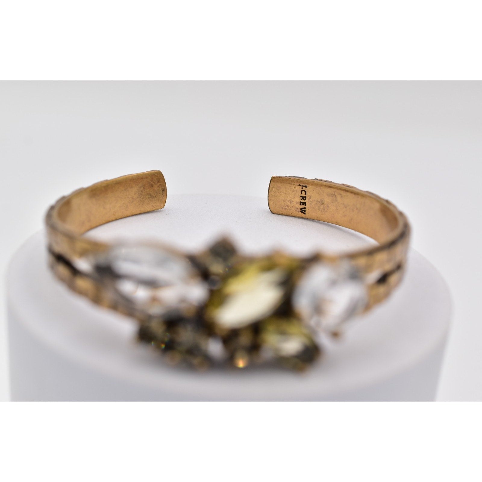 Sparkly J.Crew open cuff bracelet with a bold crystal cluster centerpiece—mixing clear, olive, and smoky gray faceted stones on an antique gold-tone band with blackened detail. Instant statement piece.