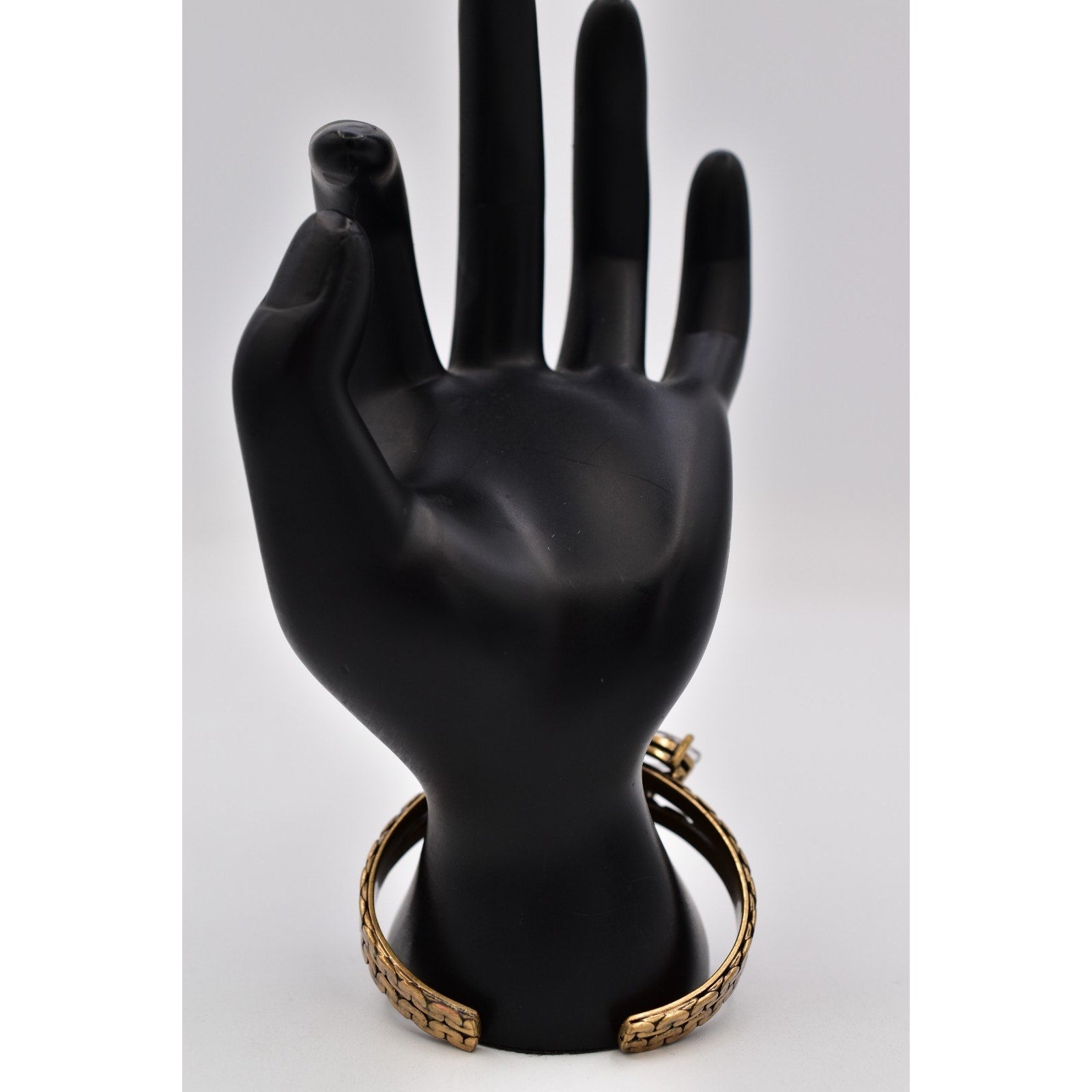 * Metal/Color: Antique gold-tone with blackened/etched accents on the band