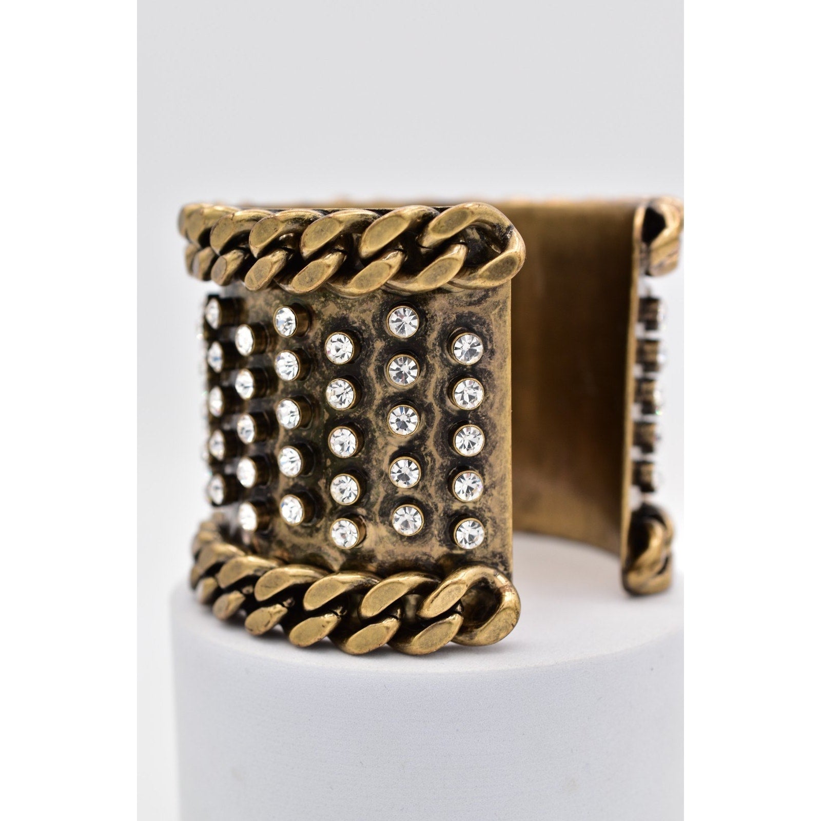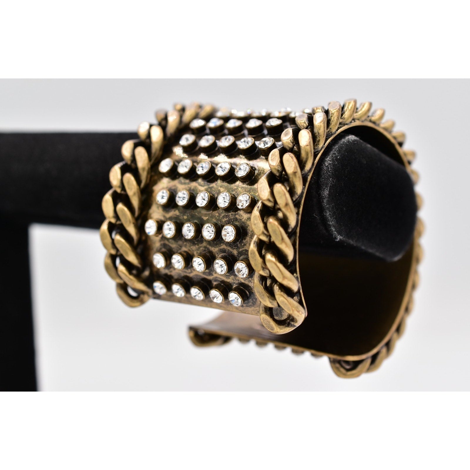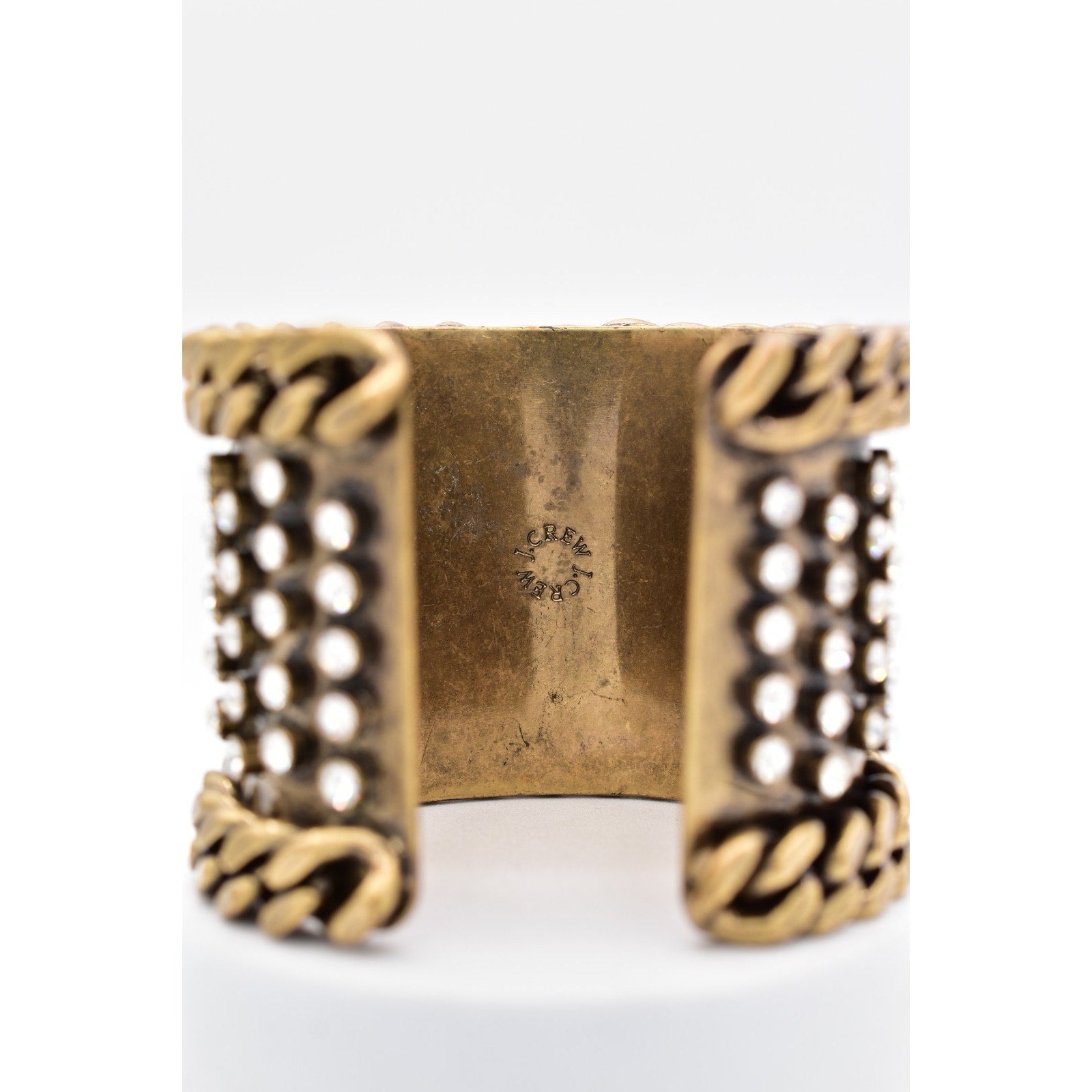 Bold J.Crew statement cuff featuring an antique gold-tone hammered center panel paved with rows of clear crystal studs, framed by chunky curb-chain edges. Edgy glam and super eye-catching.