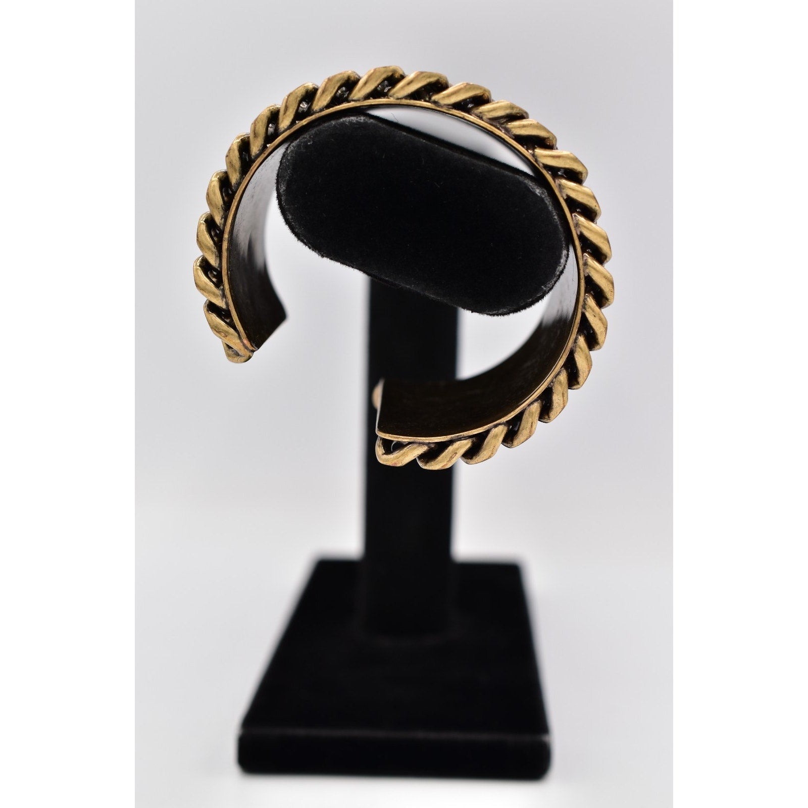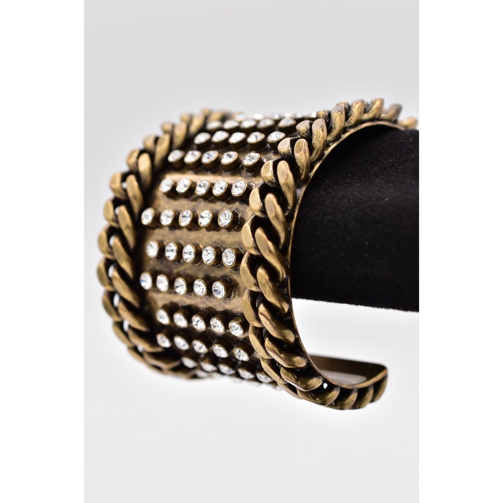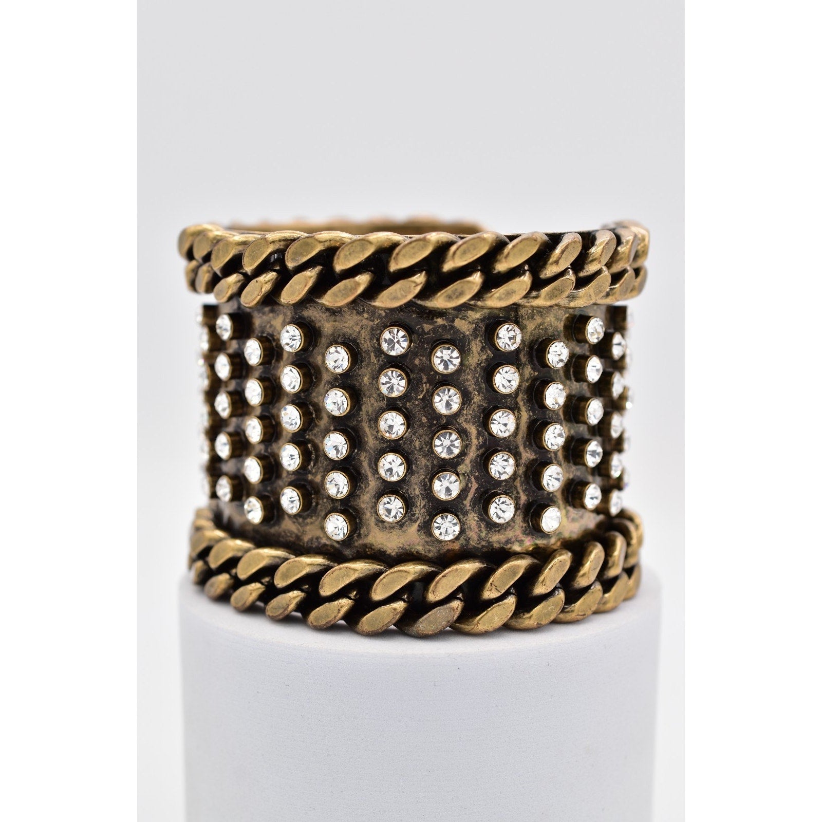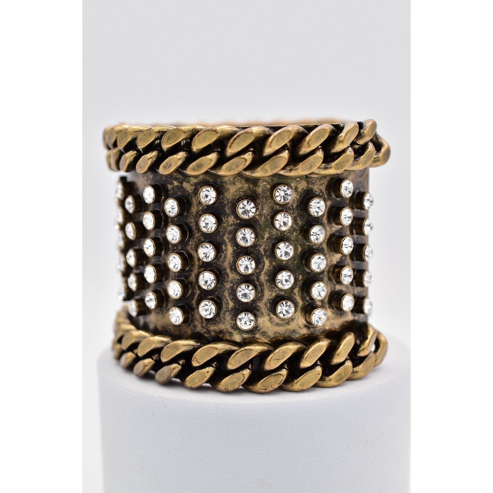 Bold J.Crew statement cuff featuring an antique gold-tone hammered center panel paved with rows of clear crystal studs, framed by chunky curb-chain edges. Edgy glam and super eye-catching.