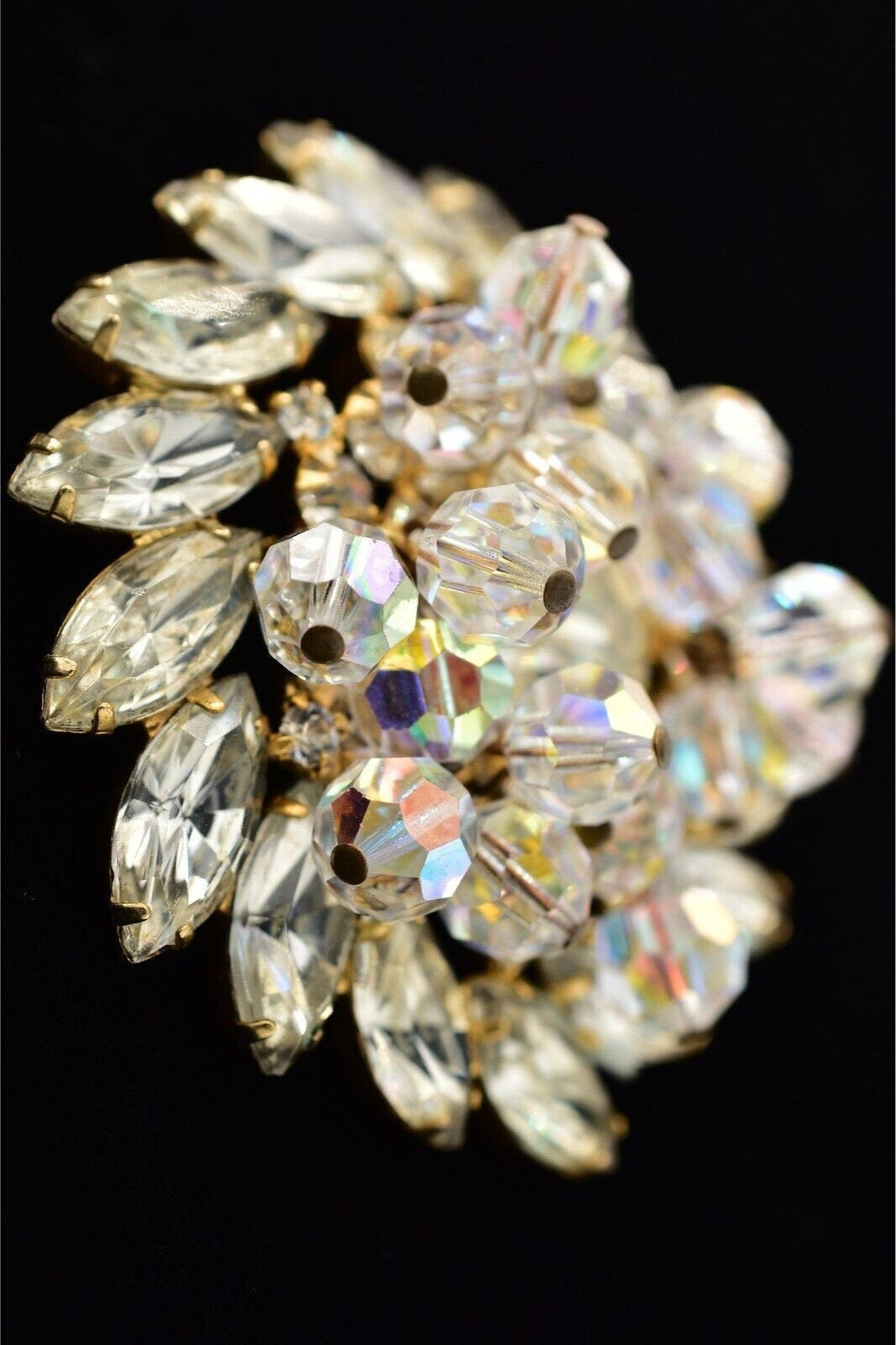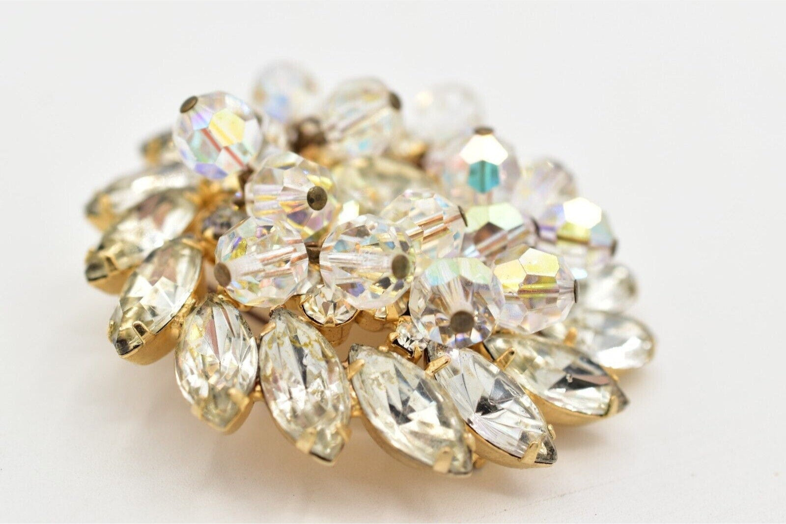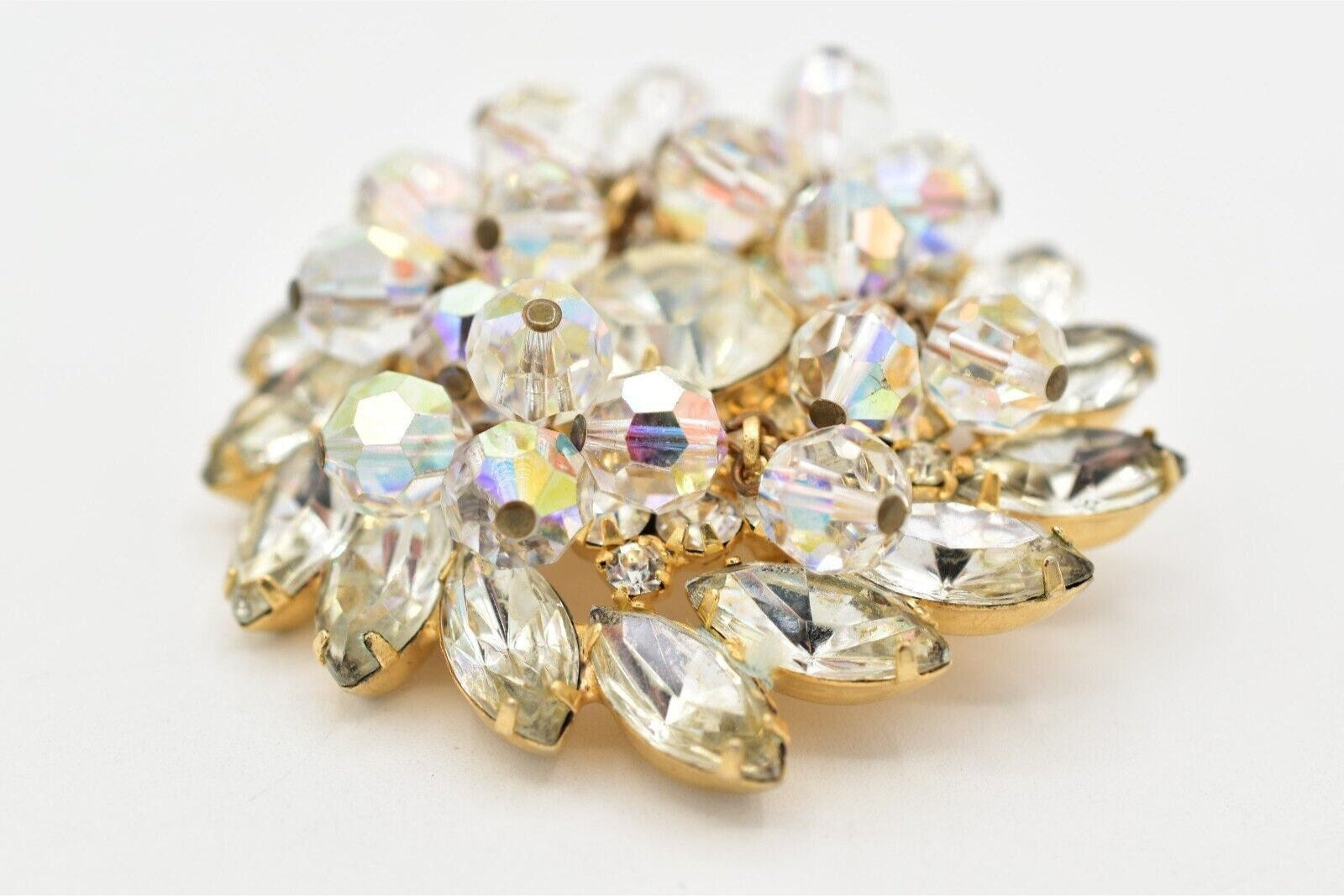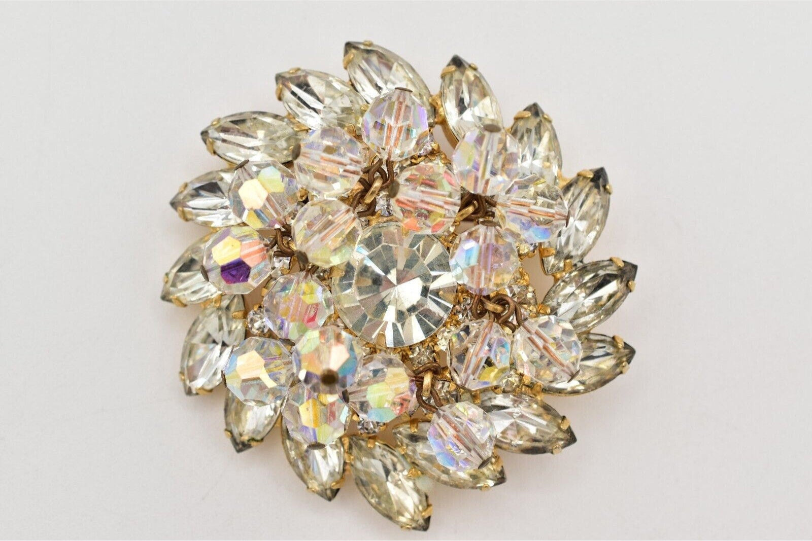 Vintage Juliana pin with prong set marquise clear crystals and dangling aurora borealis clusters.
