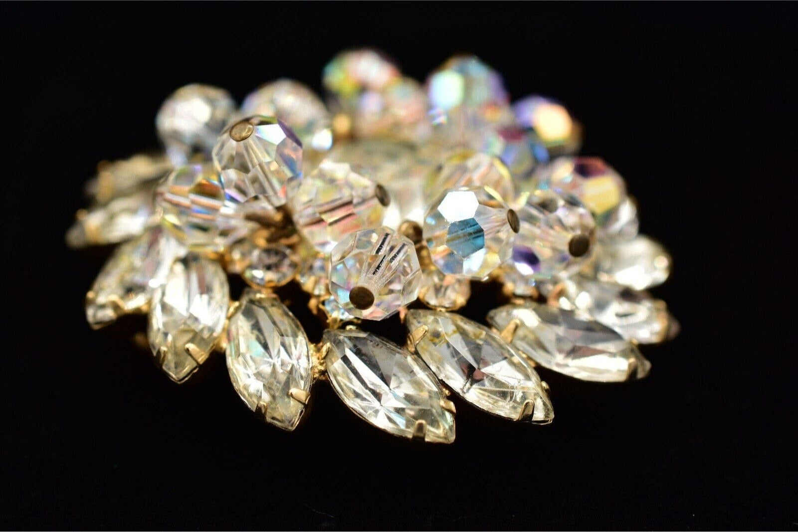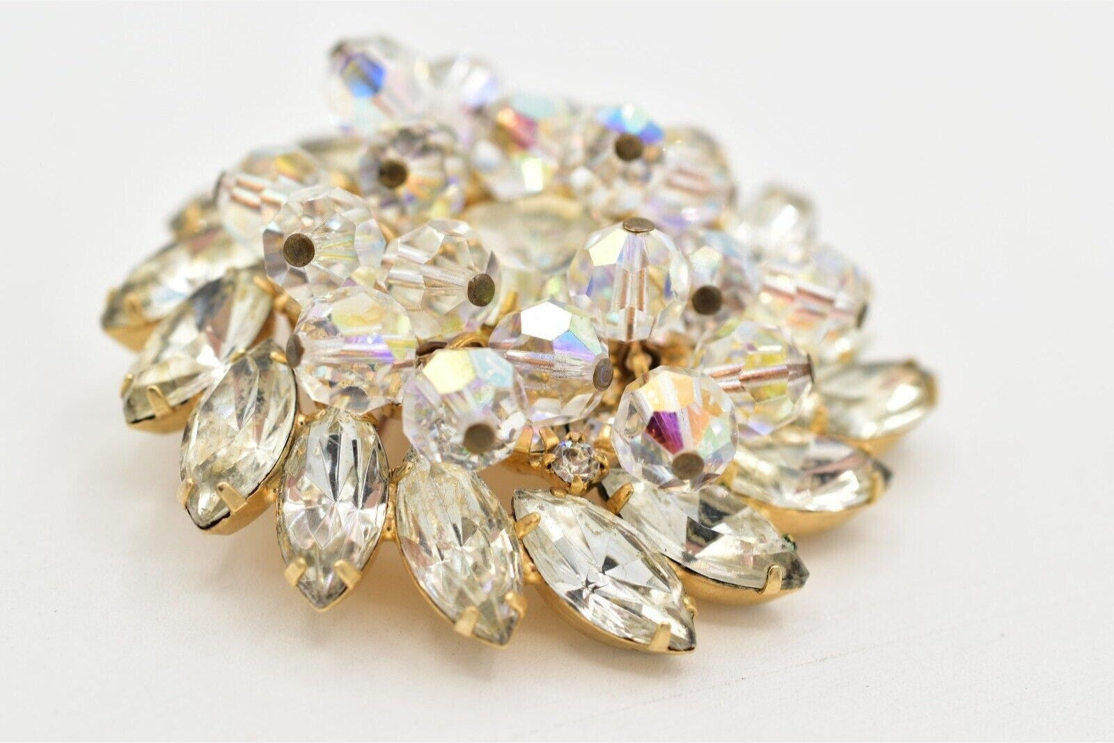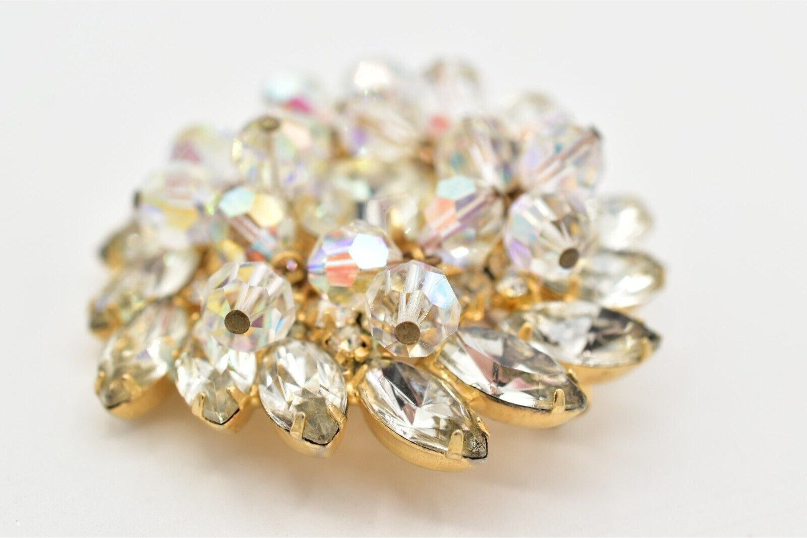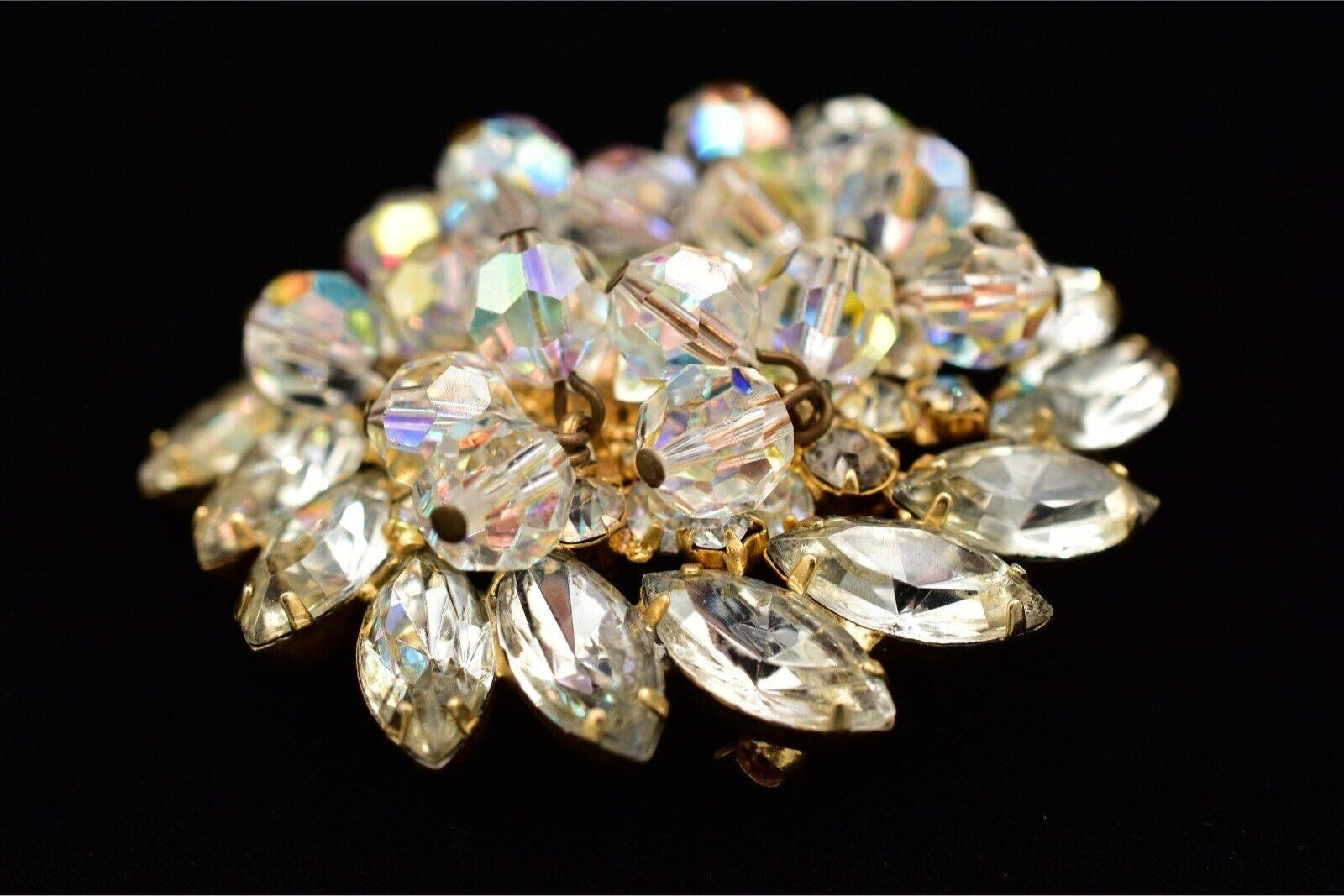 Vintage Juliana pin with prong set marquise clear crystals and dangling aurora borealis clusters.