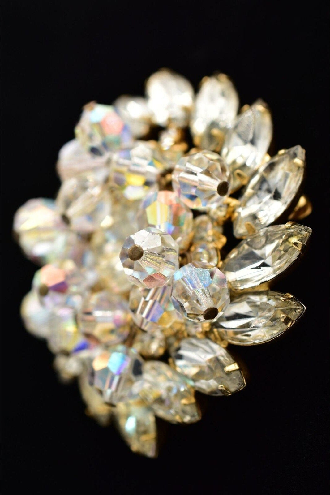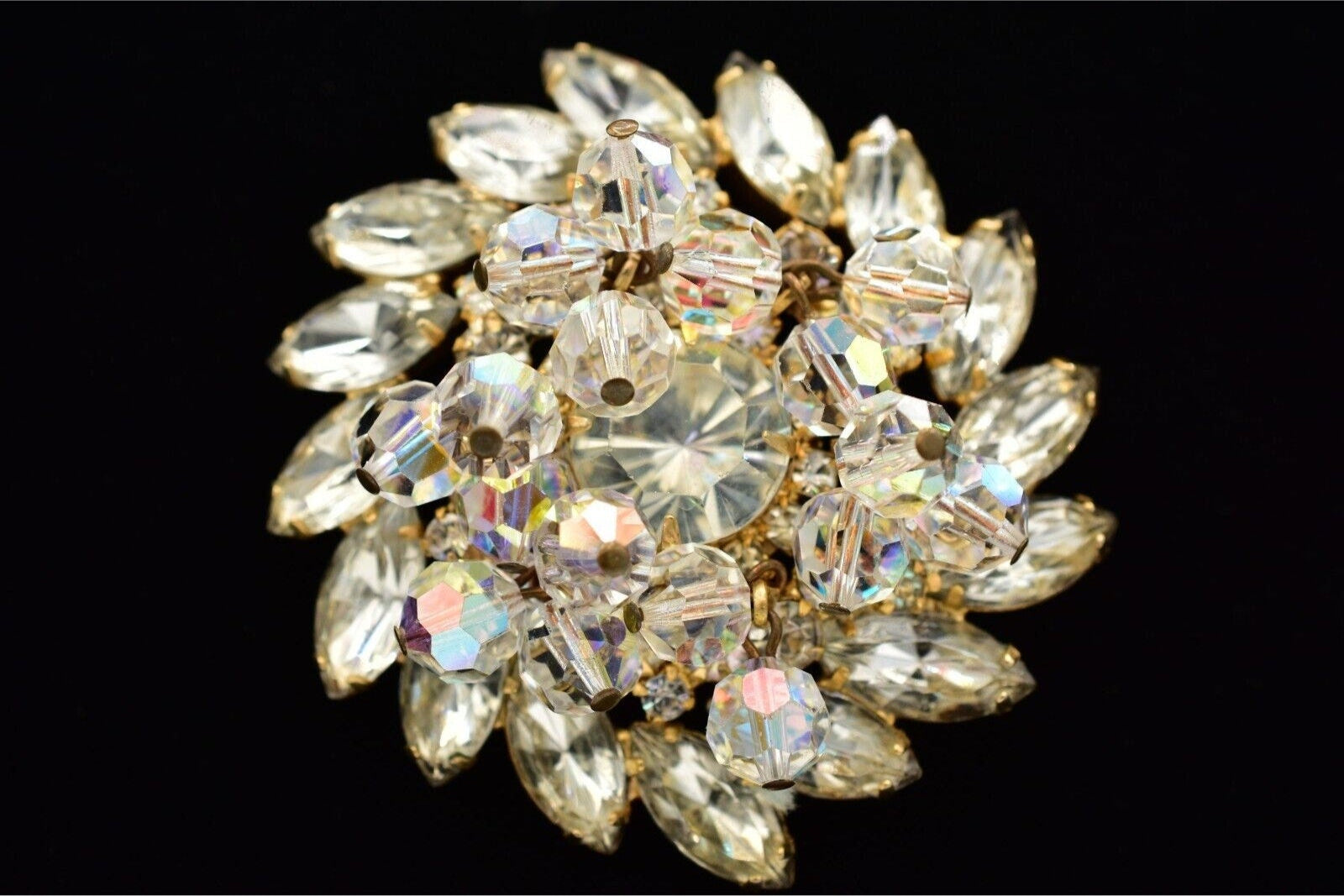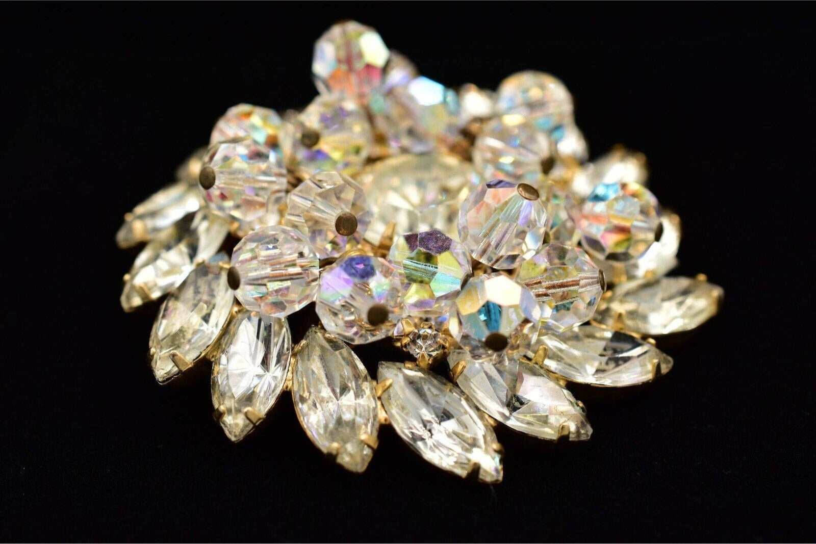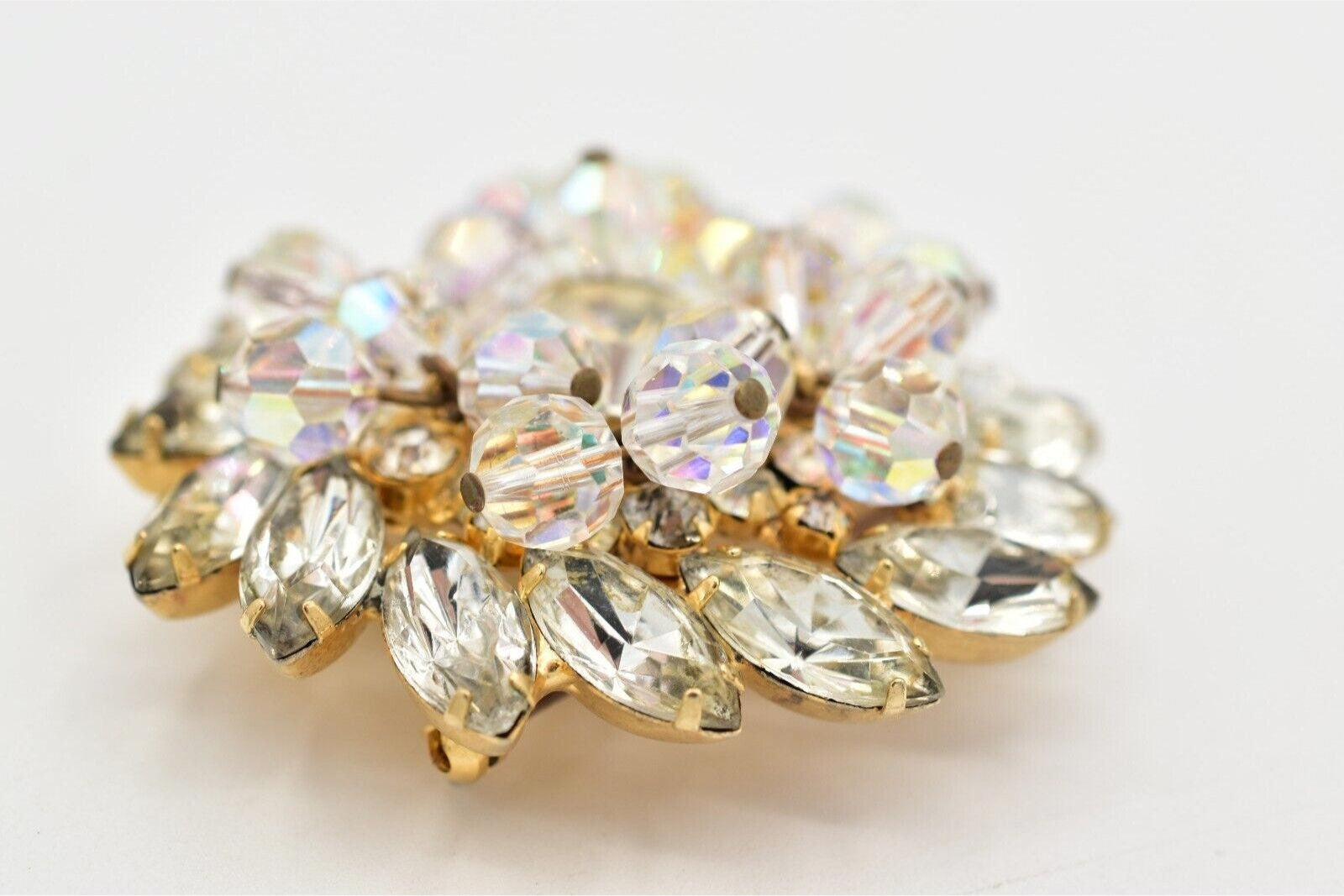 Vintage Juliana pin with prong set marquise clear crystals and dangling aurora borealis clusters.