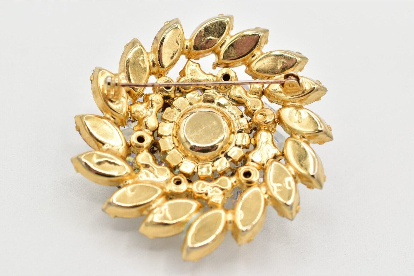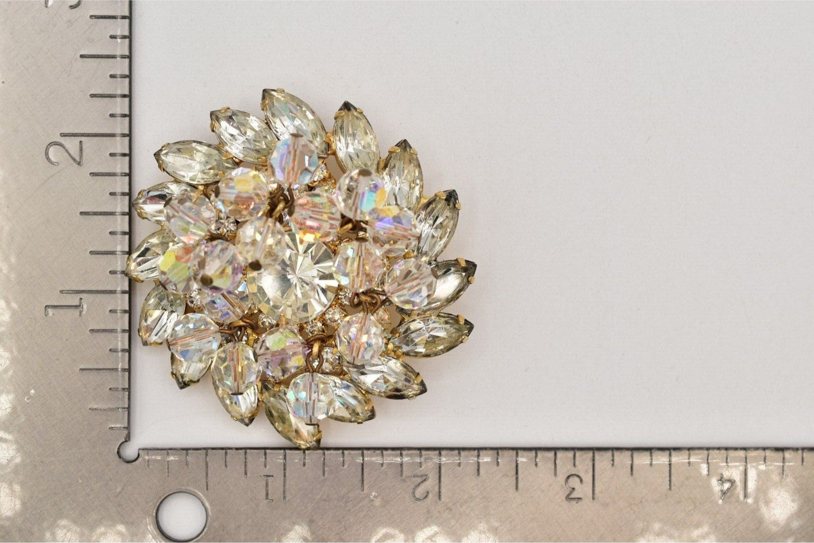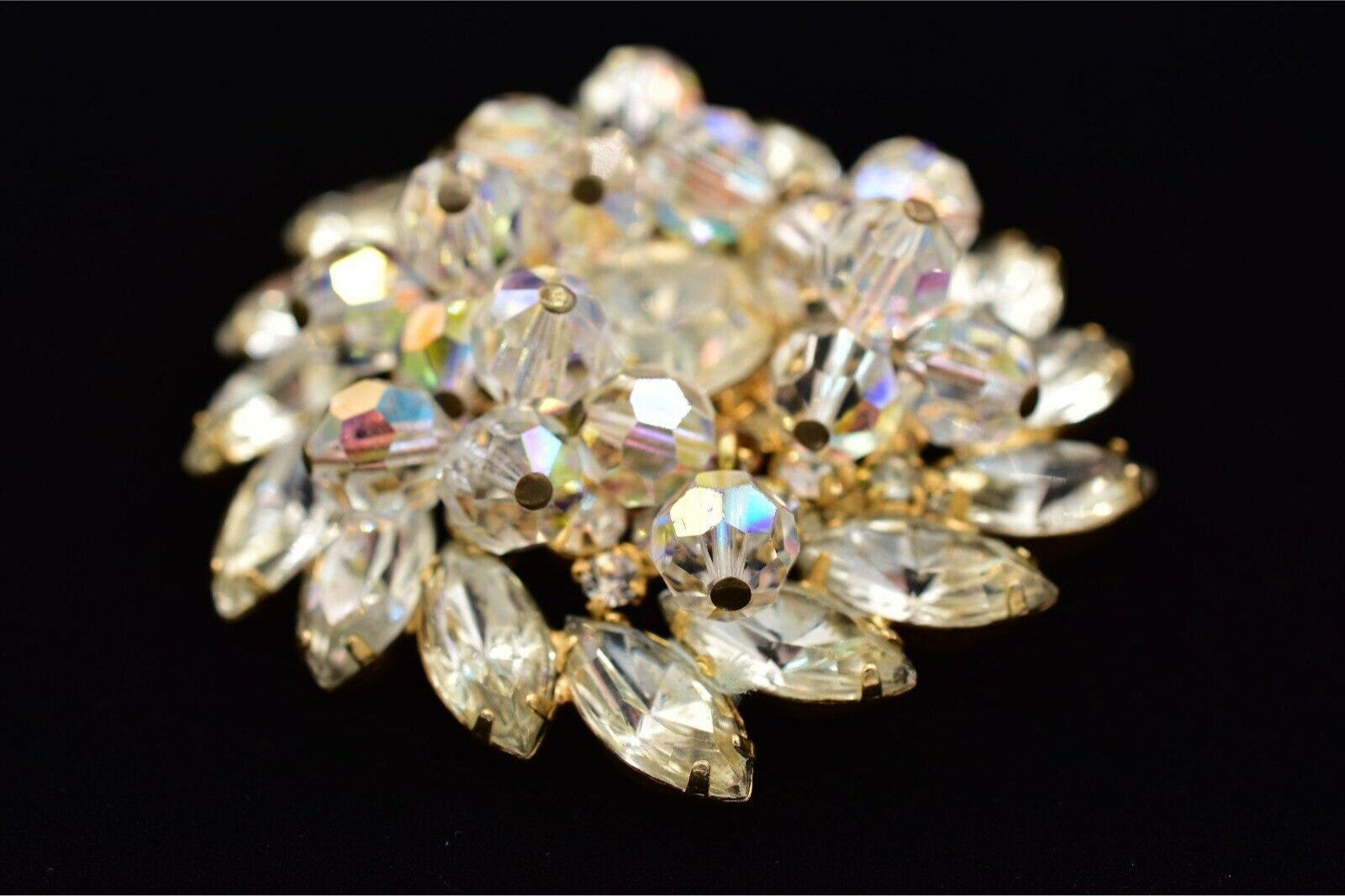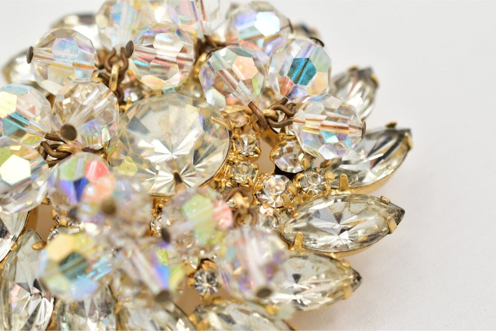 Vintage Juliana pin with prong set marquise clear crystals and dangling aurora borealis clusters.