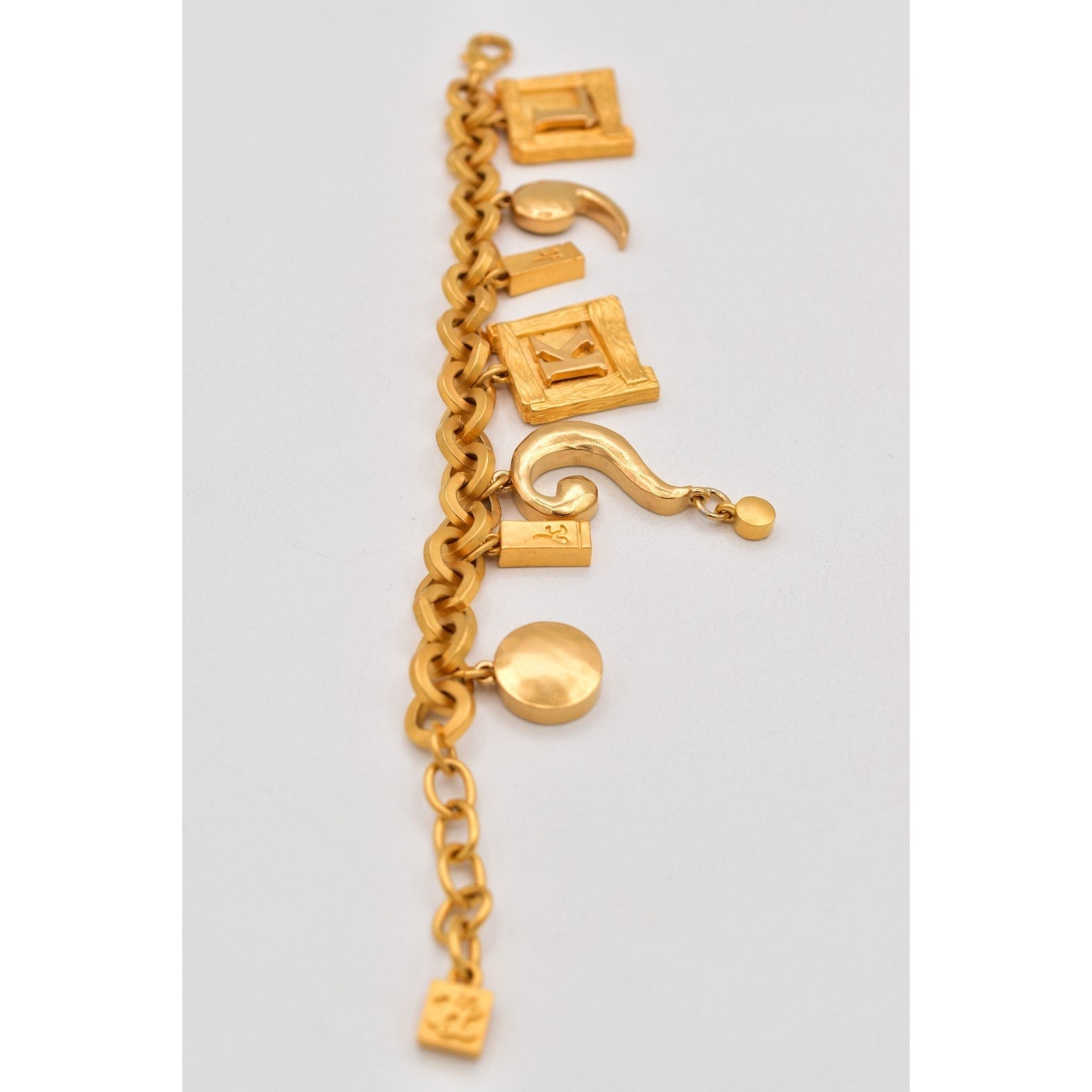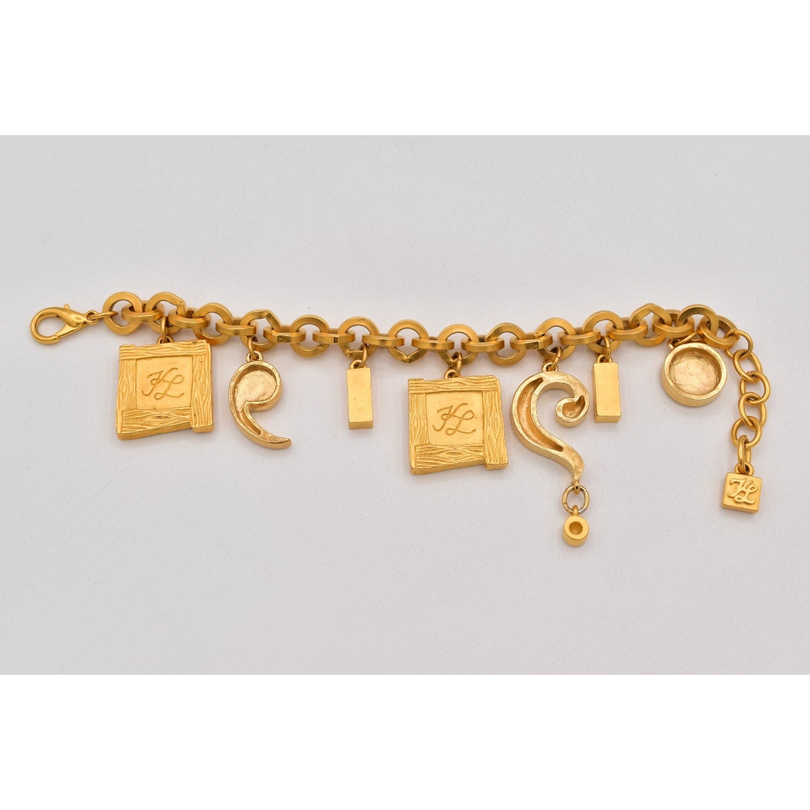 Bold Karl Lagerfeld matte gold-tone charm bracelet with chunky links and signature KL/logo details—an instant statement piece.
