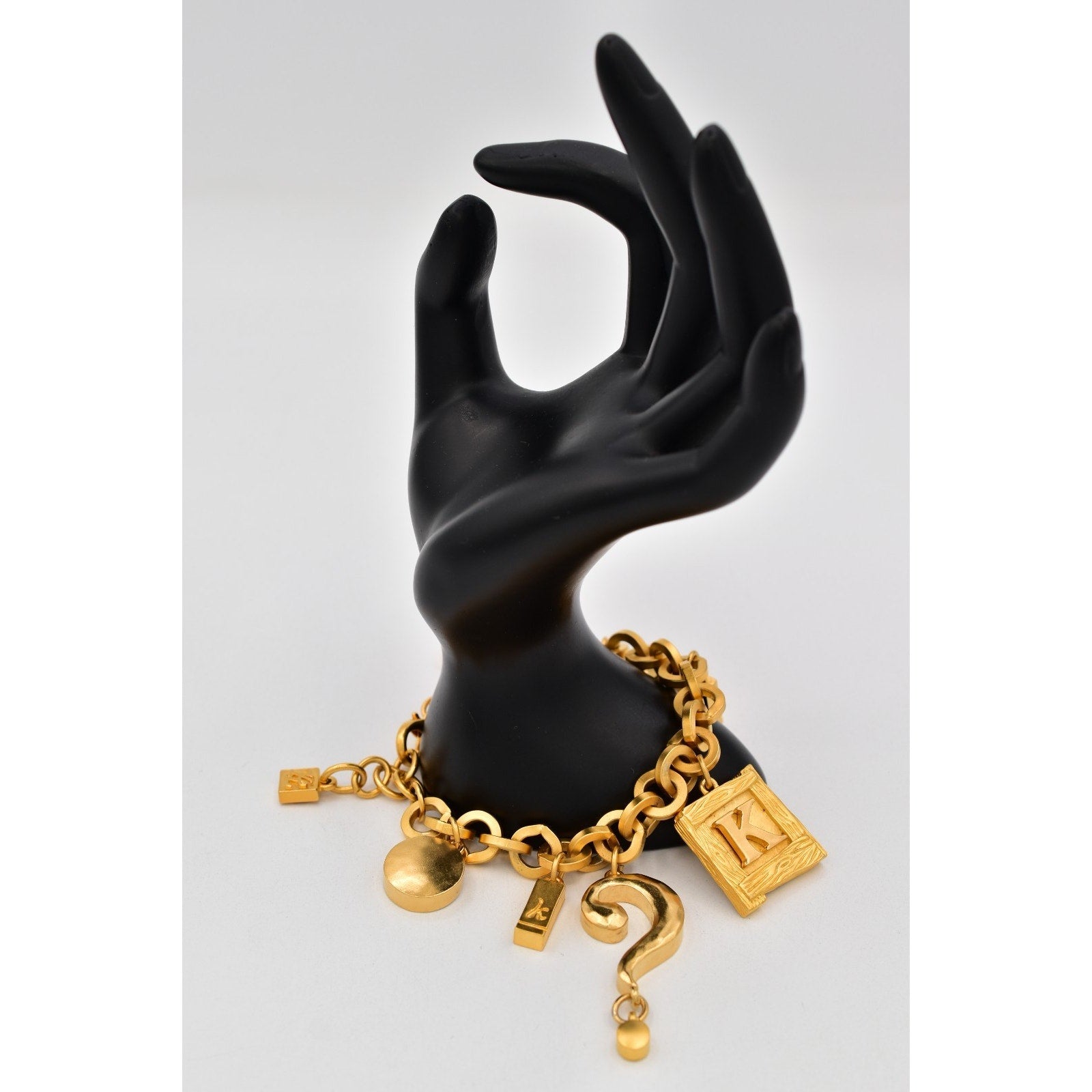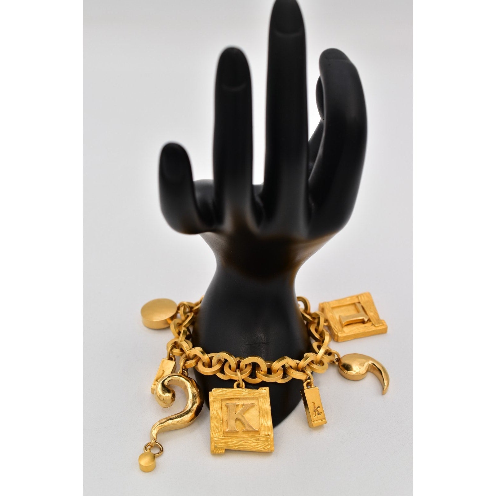 • Charms: Framed K + L letter charms, KL padlock charms, heart, round disc, sculptural swirl + crescent style charms