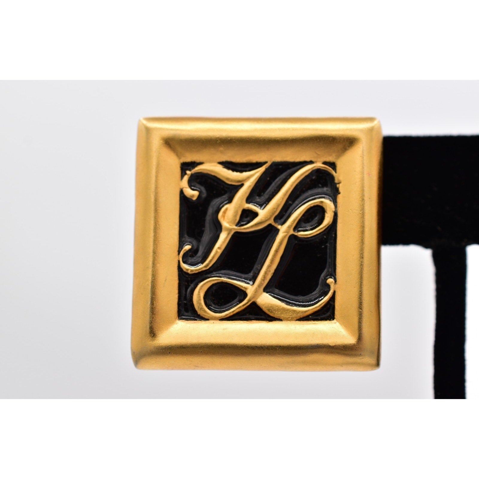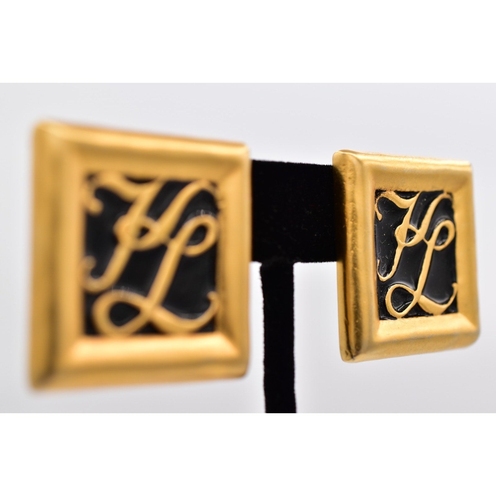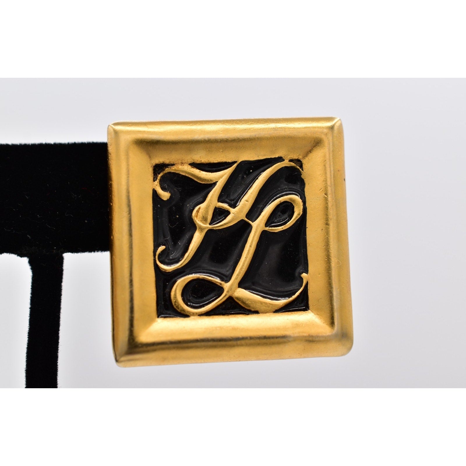Bold vintage Karl Lagerfeld clip earrings featuring a sculptural square design with black enamel centers and raised gold-tone script logo — timeless, graphic, and unmistakably Lagerfeld.