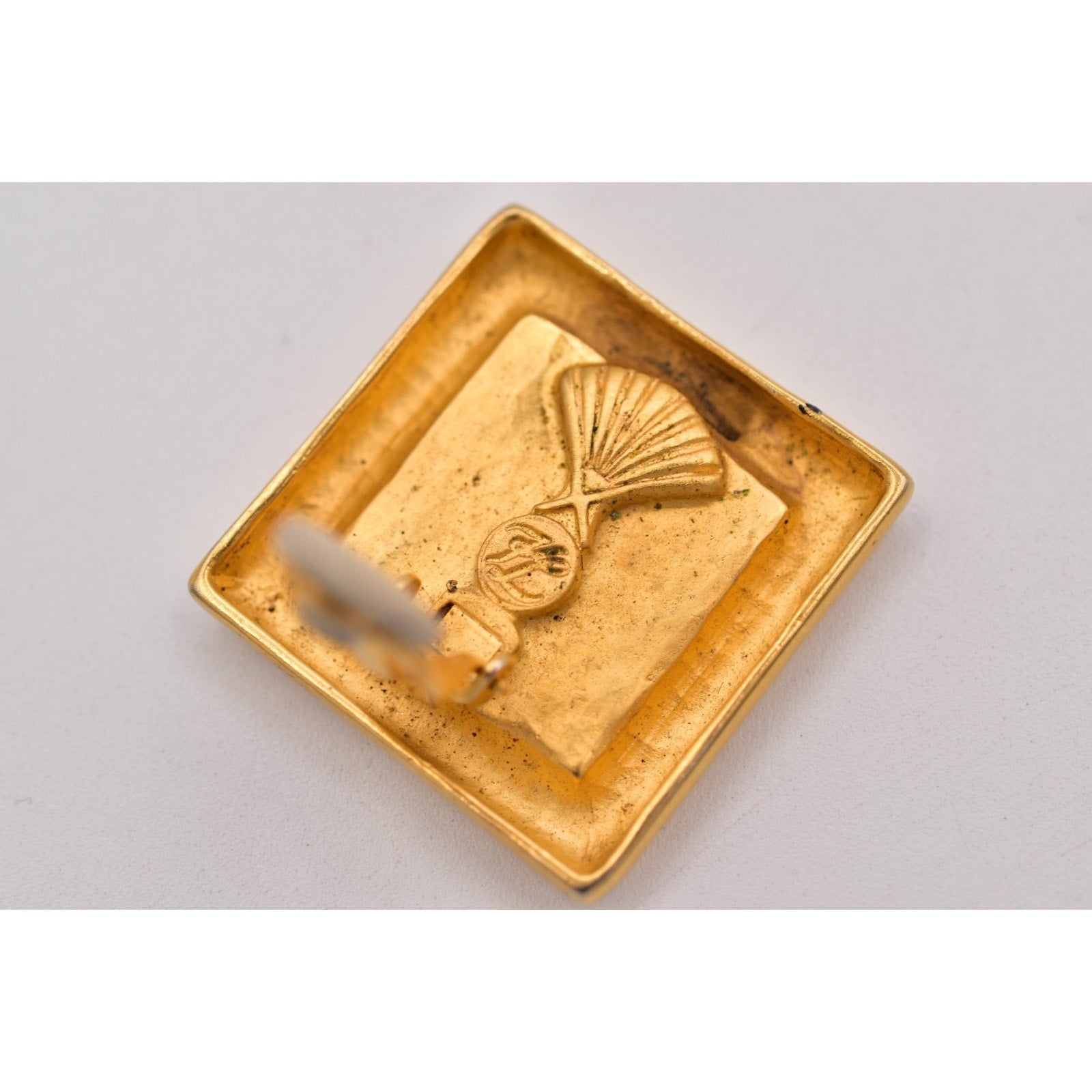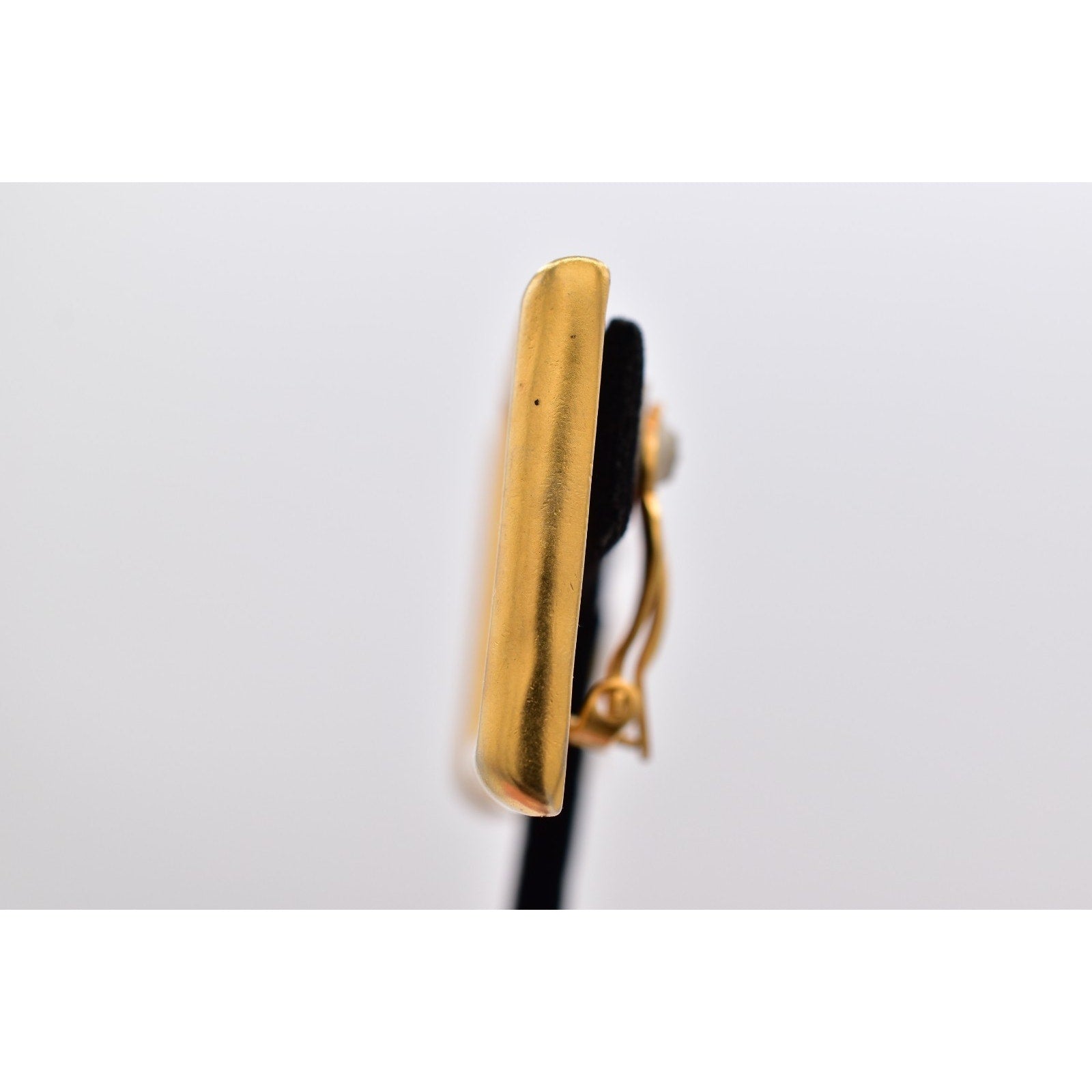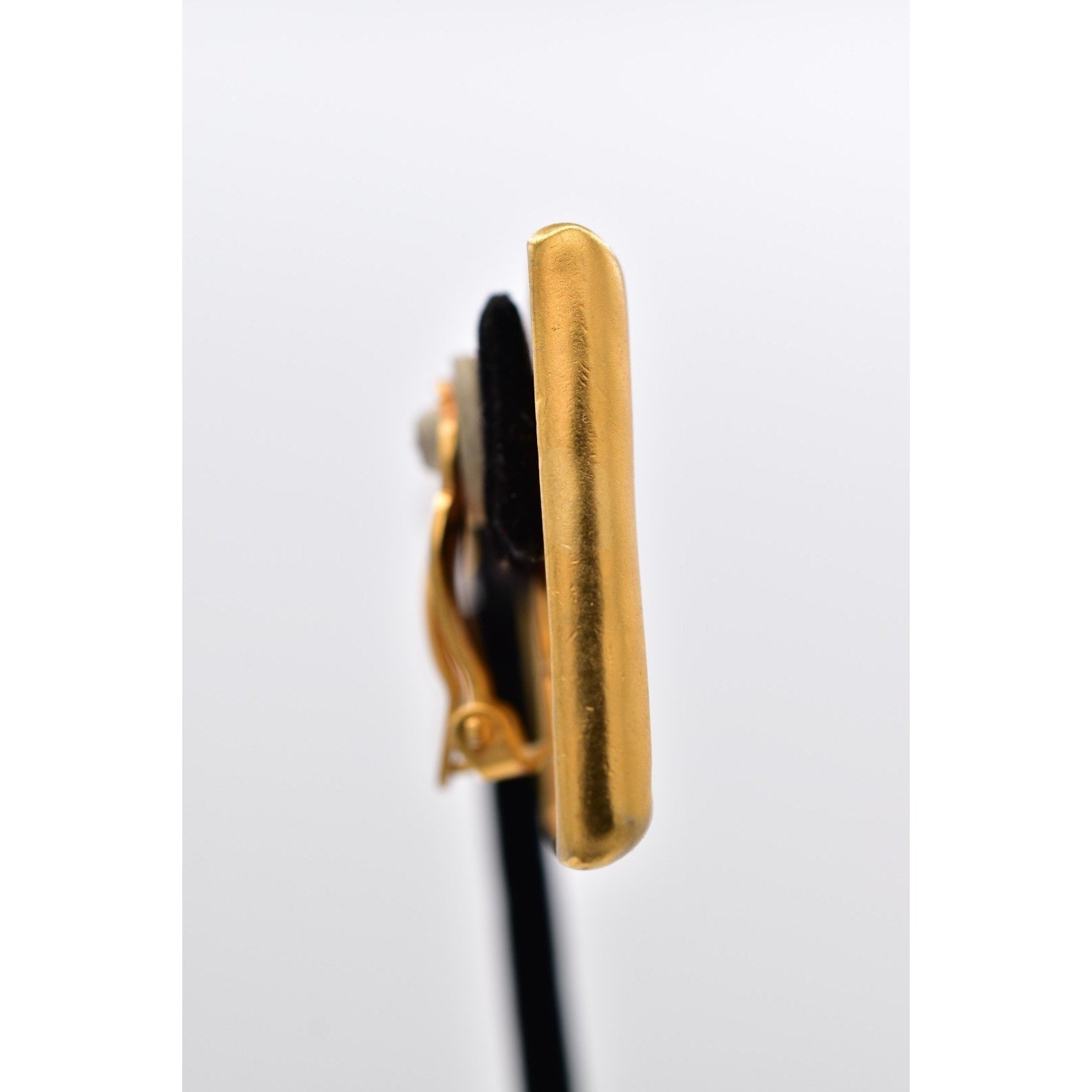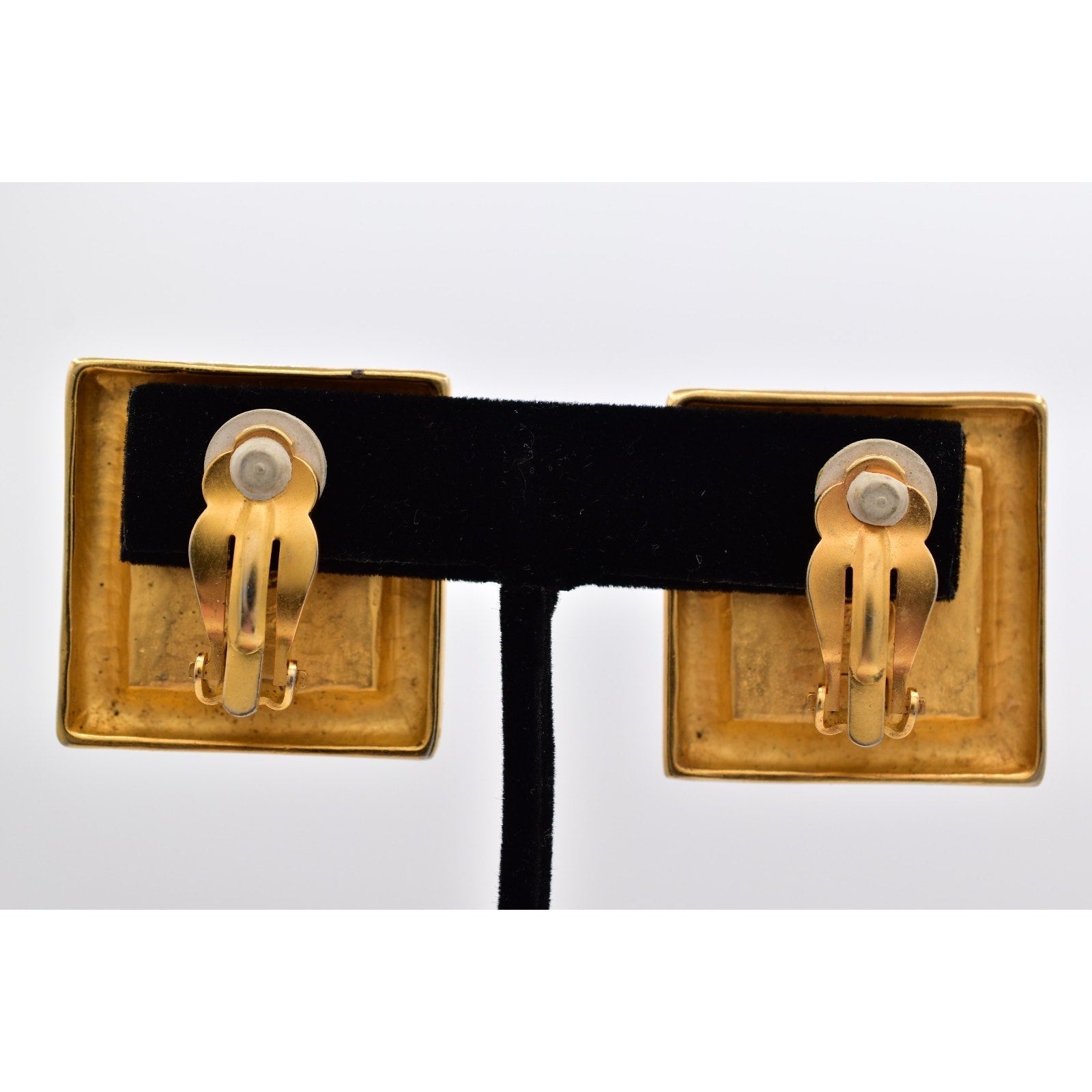 Bold vintage Karl Lagerfeld clip earrings featuring a sculptural square design with black enamel centers and raised gold-tone script logo — timeless, graphic, and unmistakably Lagerfeld.