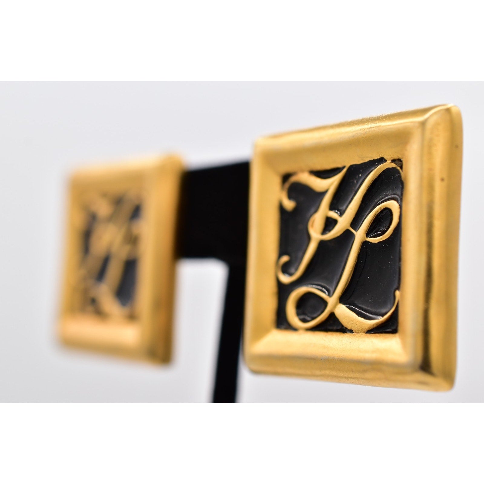 * Design: Square logo earrings with raised script letter over glossy black enamel center