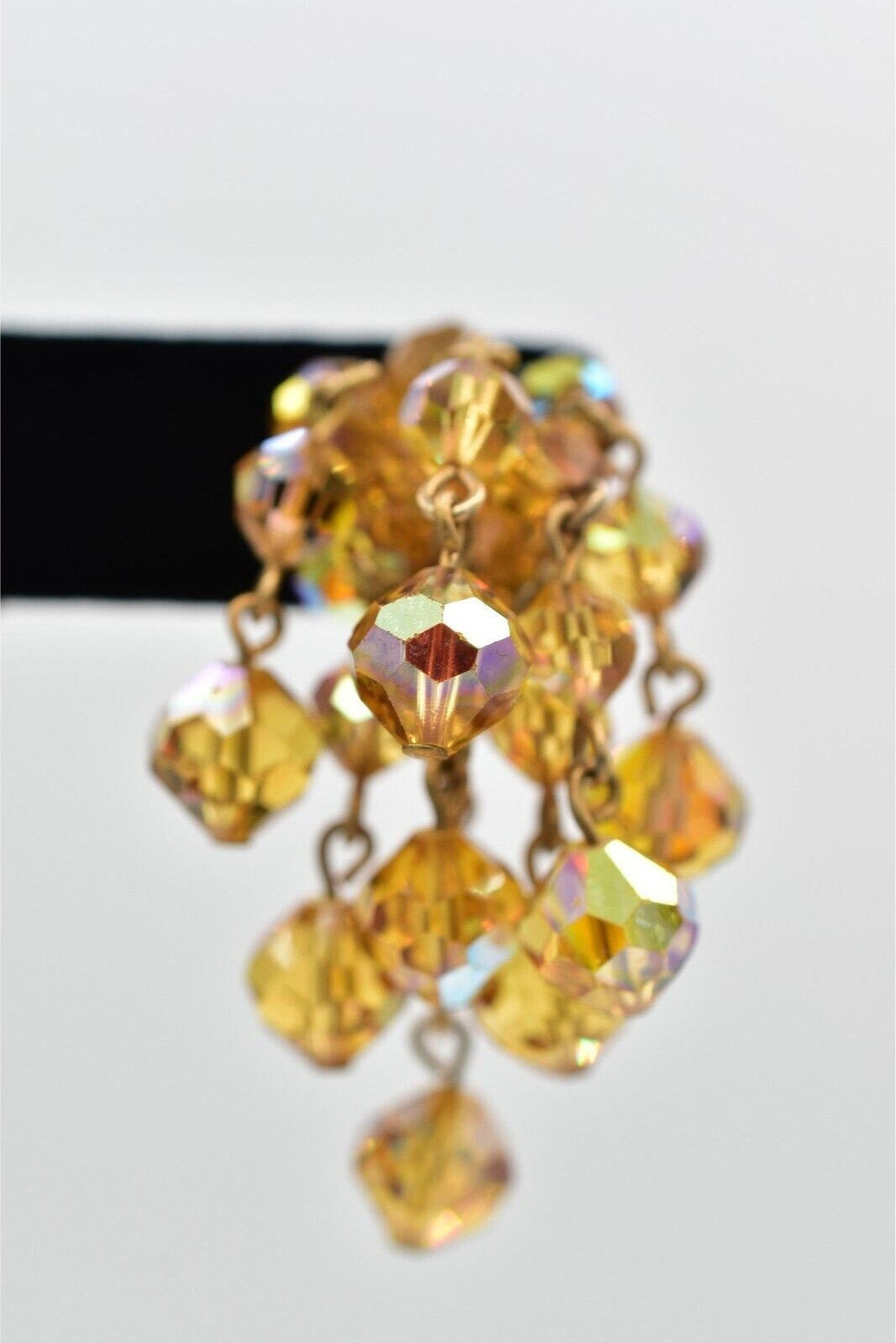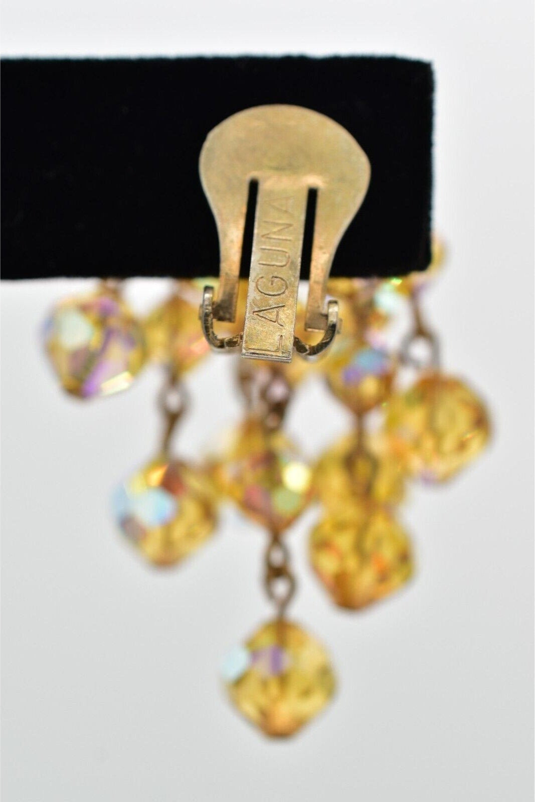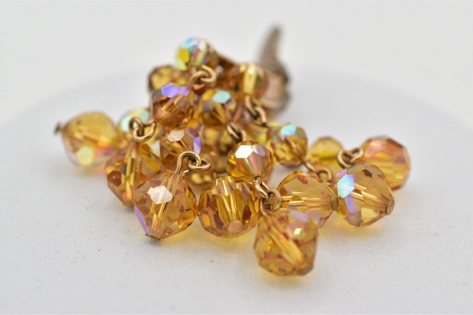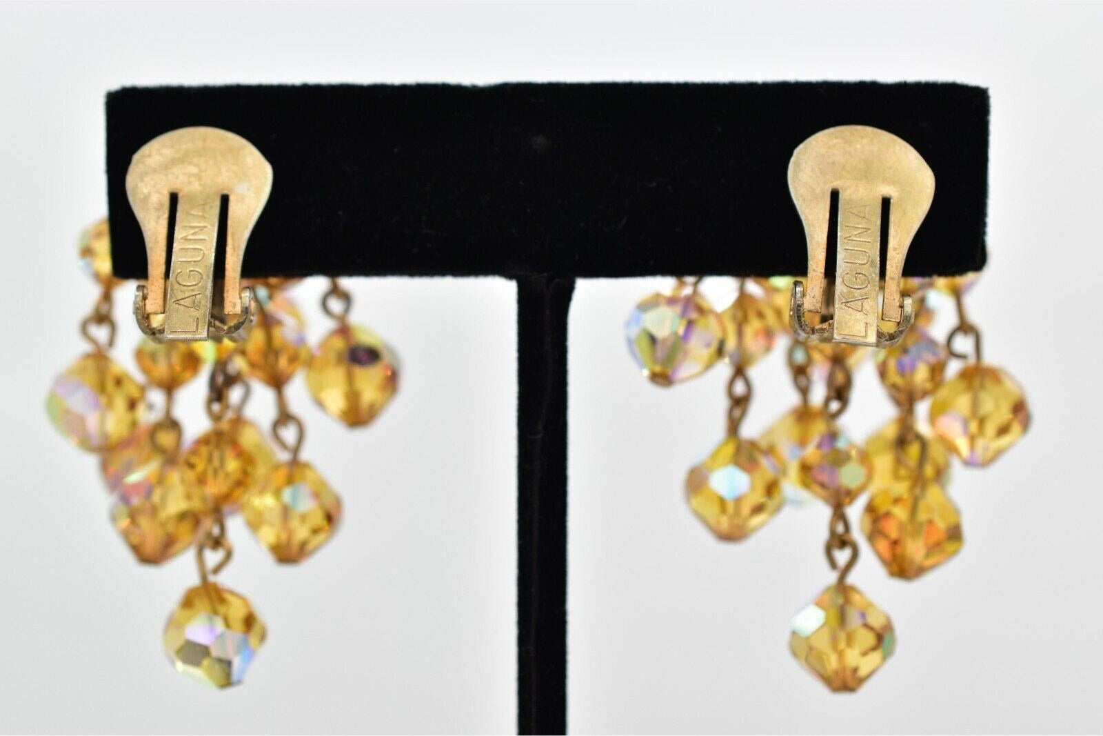 Vintage Laguna earrings with dangling chains of orange Austrian crystals.