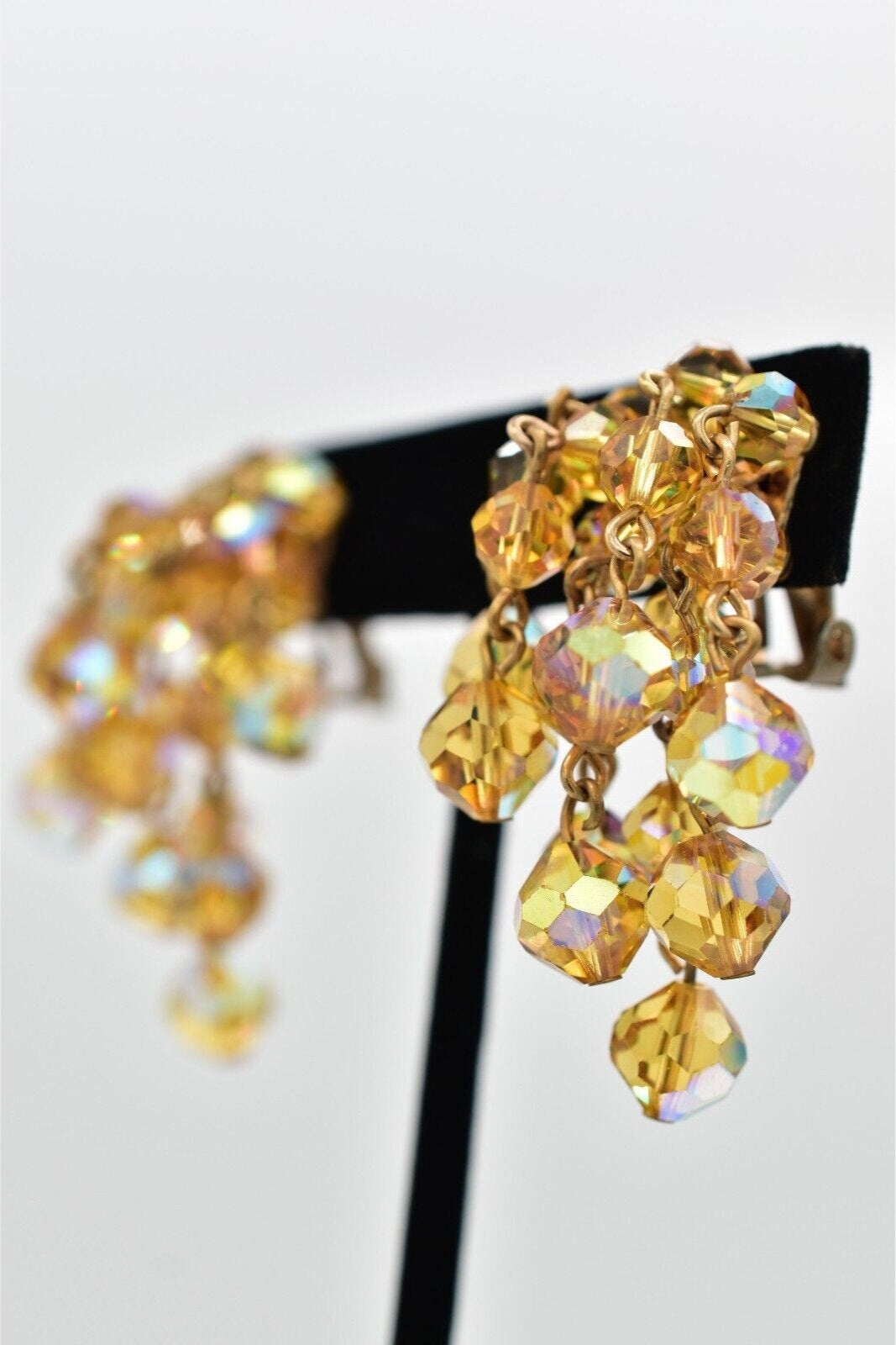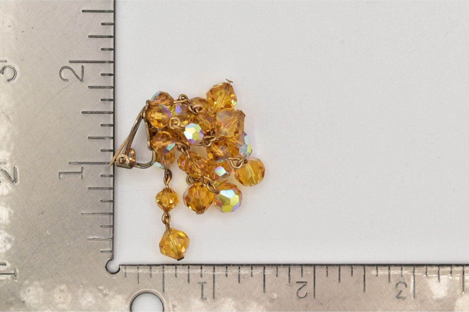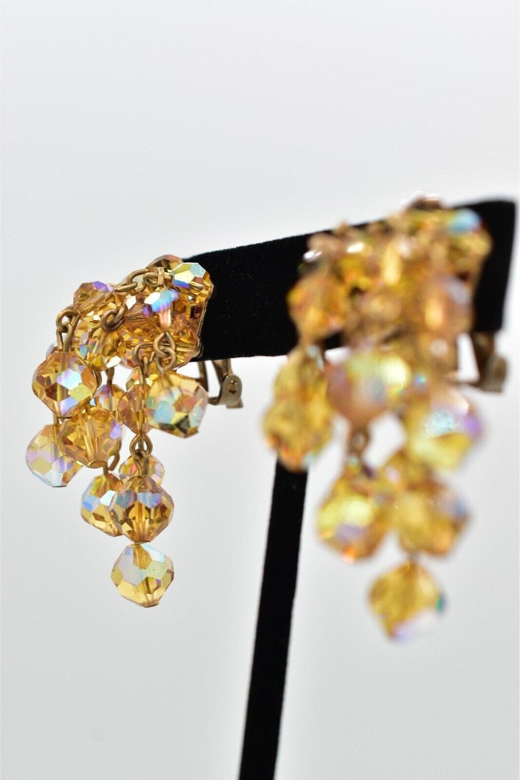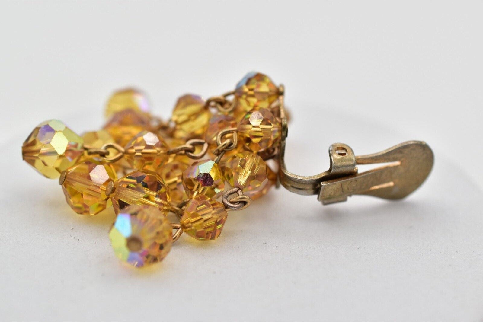 Vintage Laguna earrings with dangling chains of orange Austrian crystals.
